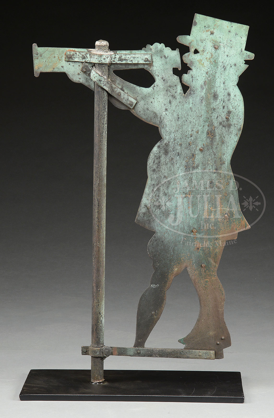 SEA CAPTAIN WEATHERVANE.Last quarter 19th century. Sheet copper with iron pipe mounting post depicting a sea captain with peg leg peering through his spyglass. SIZE: 28″ h x 17″ w. CONDITION: Verdigris surface with traces of old gold paint. 51859-21 (3,000-4,000) – Lot 2242