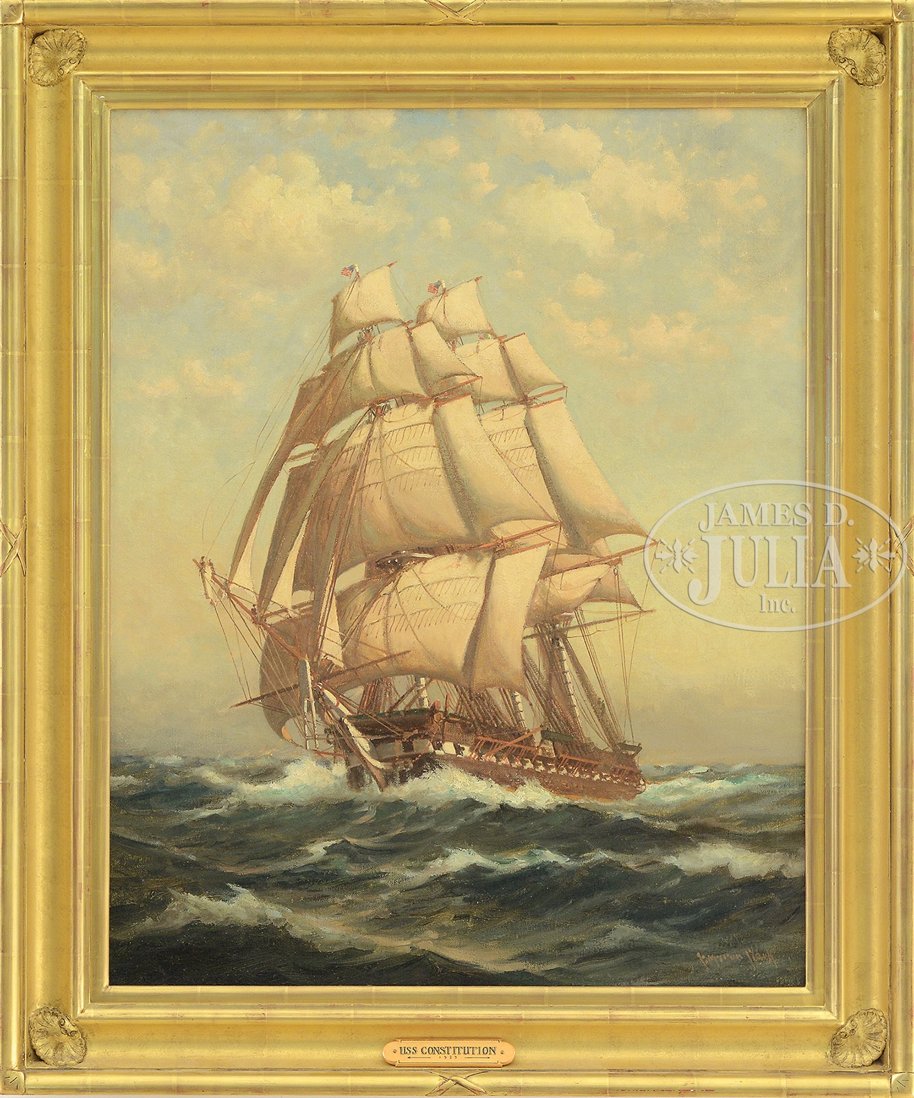 C MYRON CLARK (American, 1858-1925) USS CONSTITUTION.Large oil on canvas nautical scene shows the constitution in full sail sailing right to left through choppy seas under blue and white cloud sky. Signed lower right “C. Myron Clark”, housed in a fine modern shell decorated gilt frame, having a gilt title plaque. Accompanying the painting are three red wax personal seals circa 1812 of Commodore Isaac Hull (March 9, 1773 – February 13, 1843) past commander of the USS Constitution. Housed in a small wood frame behind glass. SIZE: 33″ x 26-1/4″. Overall 40″ x 33″. Seals: 4-1/2″ x 5-1/2″ overall. CONDITION: Very good with some minor touch up. Seals good. 51344-17 (1,000-1,200) – Lot 2243