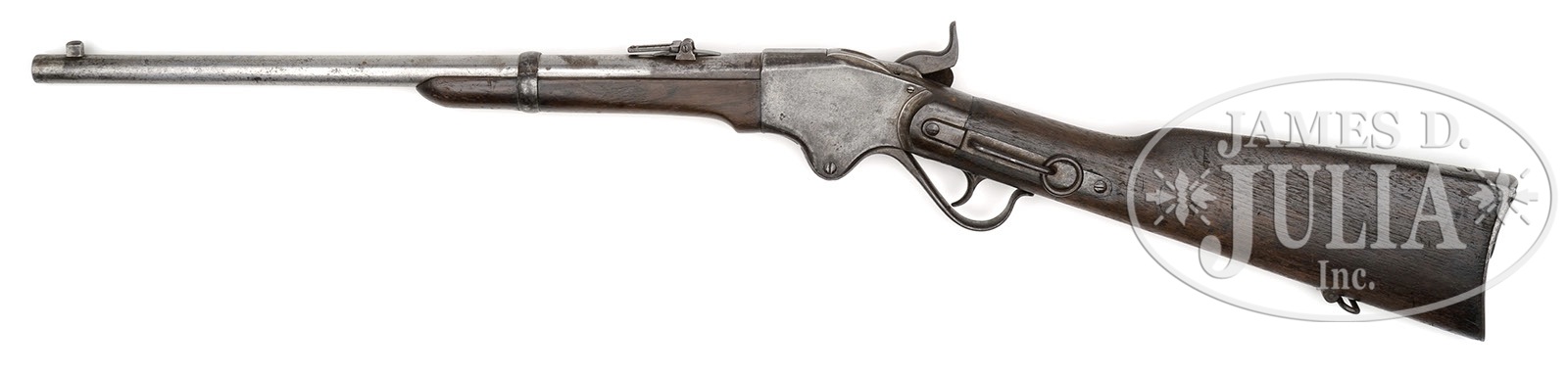 SPENCER MODEL 1865 SADDLE RING CARBINE USED AT THE BATTLE WASHITA RIVER, KANSAS AND THE LITTLE BIG HORN.SN 4231. Cal. 56-50 Rimfire. Standard carbine with 20″ bbl, rectangular base front sight and 900-yd Spencer carbine ladder rear sight with flat tension spring. Left side of wrist has a sling, bar & ring. Mounted with uncheckered, straight grain, American walnut with straight stock and Spencer buttplate. Toe of buttstock is hand carved in large letters “B.F.W” (presumably the initials of Sgt. Benjamin F. Williams). This lettering contains the remnants of very old red paint. It is well documented that Custer ordered his troops to mark their individual arms, even as early as the Civil War, to curtail theft by other units or within the unit. Carbine has faint orig markings on top flat of receiver with model number over the chamber area and serial number on top rear of receiver. This carbine shows hard use consistent with long exposure to the outdoors. According to consignor’s notes, this carbine was issued to Sgt. Benjamin F. Williams, Co. M, 7th Cav. and was lost at the Battle of Washita River on Nov. 27, 1868. Sgt. Williams was killed along with Maj. Gen. H. Elliot and 19 others. It was taken by a Cheyenne Indian named Black-White-Man who, in an interview years later reported taking a rifle from a man with stripes. Consignor states that this carbine was used at The Battle of Little Big Horn and also The Dull Knife Battle in Wyoming Territory near, what is now the town of Kaycee. As of this writing, it is unclear what proof consignor has regarding the provenance of this carbine. PROVENANCE: Wendell Grangaard Collection. CONDITION: Fair. No orig finish remains. The bbl has been lightly sanded and is now a silver metal patina with scattered pitting; receiver, lockplate, lever & buttplate are mostly a mottled silver brown patina, darker on the lever; wood is sound with nicks & scratches and a couple deeper gouges and retains a very dark hand worn patina. Mechanics are fine; worn dark bore with a couple of rings about a third of the way in front of the chamber. 4-49326 JR433 (10,000-15,000) – Lot 2245