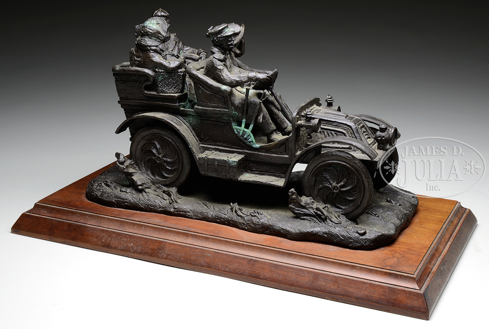 LARGE SIGNED AUTOMOBILE BRONZE BY WENDY BERG.Contemporary well-carved and detailed bronze sculpture depicting two early 20th century couples out for a joy ride in their open air automobile. Mounted to wooden base with plaque reading “La Machine de Romance”. Rear of bronze is signed “Wendy Berg 20/36″ SIZE: 13″ h. Base measures 24″ l x 13” w. CONDITION: Near excellent. 45146-26 (800-1,200) – Lot 2245 Auction: Advertising, Toy & Doll - Spring 2015 Please Note: All prices include the hammer price plus the buyer’s premium, which is paid by the buyer as part of the purchase price. The prices noted here after the auction are considered unofficial and do not become official until after the 46th day. |
