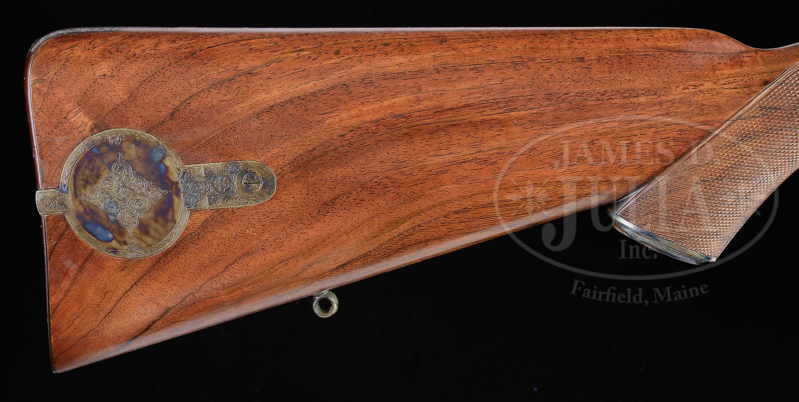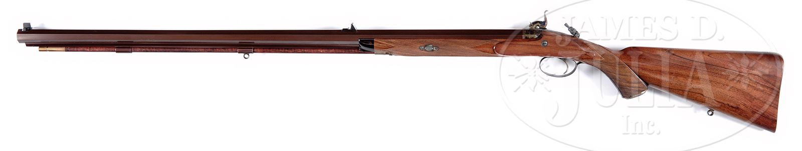 ALEXANDER HENRY STYLE SINGLE BARREL PERCUSSION TARGET/ HUNTING RIFLE BY DON BROWN WITH EXTRA BARREL AND LOADING ACCESSORIES.SN 23. Cal. .418 Groove diameter. Both bbls are 33″ nicely swamped octagon with bottom rib. Top flats are engraved “DON HENRY BROWN”. One set is fitted with one standing, one folding express rear sight with tall white bead front. The other is fitted with one standing, three folding leaf rear sight, and dovetailed through base for vernier windage adjustable front. Hickory cleaning rod with brass tip is held by two plain pipes, central pipe affixed with sling eye. Patent breeches are case hardened and nicely scroll engraved. Breech iron is also scroll engraved and a Lyman type elevation adjustable folding peep sight is installed. Case hardened lock with Alexander Henry style tall serpentine hammer is also engraved with well cut, shaded scroll. Nicely marbled and lightly figured European walnut steel trap capped pistol grip stock is fitted with classically styled furniture, with pineapple finial to trigger plate, and steel buttplate with medium top spur. A classic, case hardened, spring loaded patchbox is on left side of butt. Stock also features nicely carved drop points, point pattern checkering with mullered borders at grip and around forend, and horn forend tip. Also included with rifle are a nylon and brass cleaning/ loading rod, a Lyman (?) bullet mold, steel loading rod, an Ideal bullet sizer/ lubricator with die, loading block, various sights, nipples, sling swivels, two front sights for adjustable base, and a vernier rear sight (all in a plastic container). CONDITION: Excellent, near new, with only a hint of wear and handling marks on wood and metal. Bores are excellent. Lock is crisp. An exceptionally fine recreation of a very desirable percussion target rifle. 49027-3 JR (6,000-10,000) – Lot 2245 Click here to view provenance