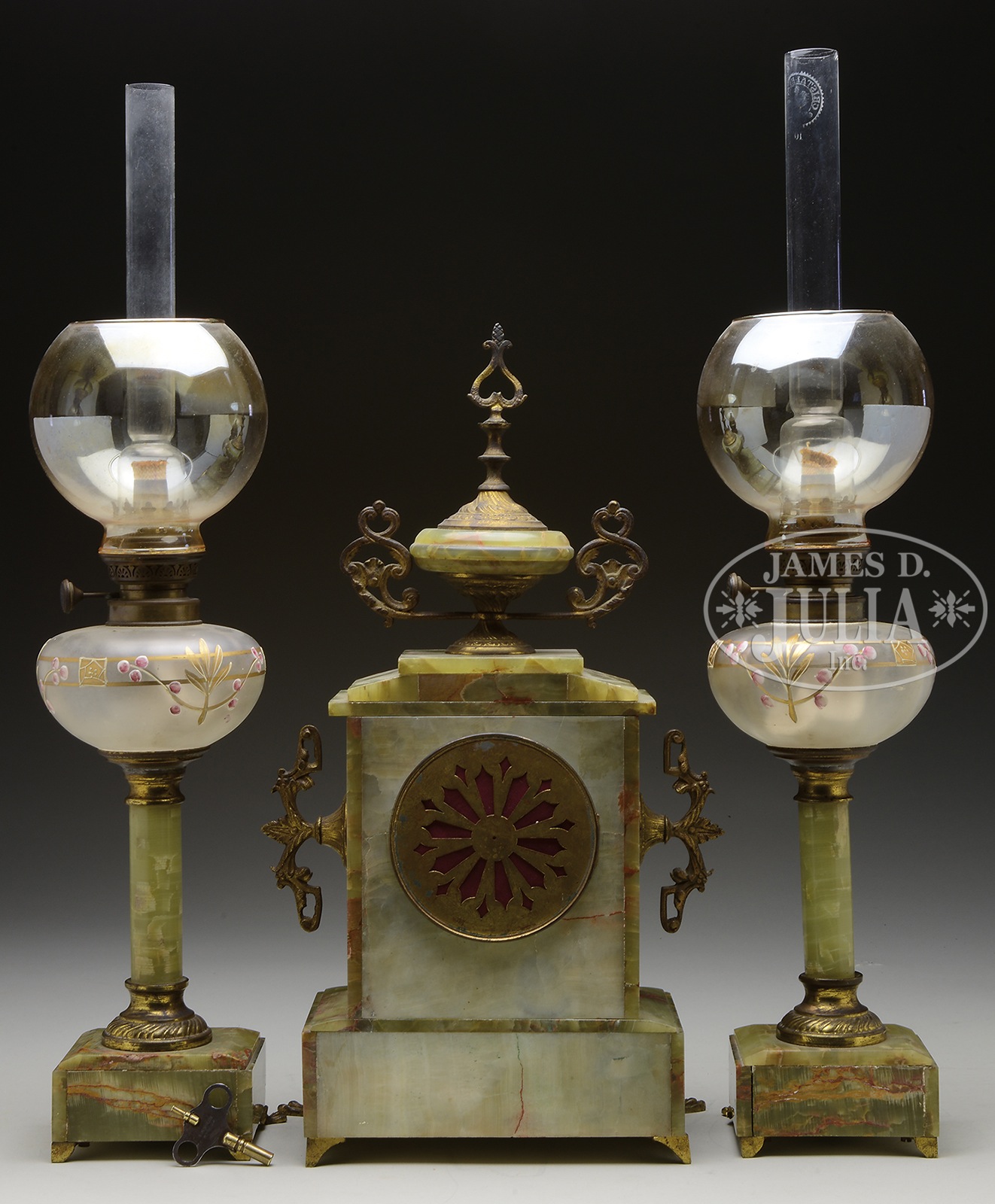 FRENCH ONYX THREE PIECE CLOCK AND LAMP SET.Late 19th century. French. Featuring a central clock in onyx with ormolu mounts having onyx and brass finial, accompanied by 2 onyx, brass and glass kerosene lamps having enameled decoration and iridescent shades. The brass clock movement marked in a lozenge “Marque Fabrique V.F.”. SIZE: Clock 17-3/4″ t. CONDITION: Very good, pendulum in tact, few minor nicks in onyx around base of clock. 9-96183 (1,500-2,000) – Lot 2246