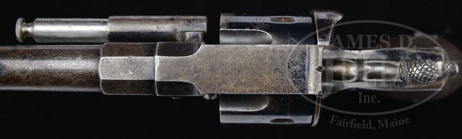 DREYSE M1893 BABY REICHSREVOLVER, DOUBLE TRIGGER, WITH EJECTOR.SN 314. Cal. .380. Dreyse made very few Baby Reichsrevolvers; this example has 3-3/8″ bbl, double triggers and a frame-mounted safety behind the hammer that needs to be retracted before the hammer can be cocked. Fixed front & rear sight. Left upper chamber flat marked with Crown/Crown U pressure proof; left chamber flat marked with SN “314”. Sideplate marked “F. DREYSE SOEMMERDA” within a horizontal oval. Rear of the cyl is matching numbered “314”. All visible small parts, including the screw heads and grip escutcheons, marked with matching “14”. Finely checkered wood grips, each secured with a central screw & escutcheon. Major parts finished with a high polish blue; small parts fire blued (grip escutcheons); strawed (screws) or left in-the-white (hammer). PROVENANCE: Ex Dinely Collection. Collection of Dr. Geoffrey Sturgess. CONDITION: Approx 40-50% orig blue with comparable fading of small parts. Dull bore with easily discernible rifling. Perfect manual mechanics. One of the most difficult to find Dreyse revolvers. 4-52562 (2,000-3,000) – Lot 2248