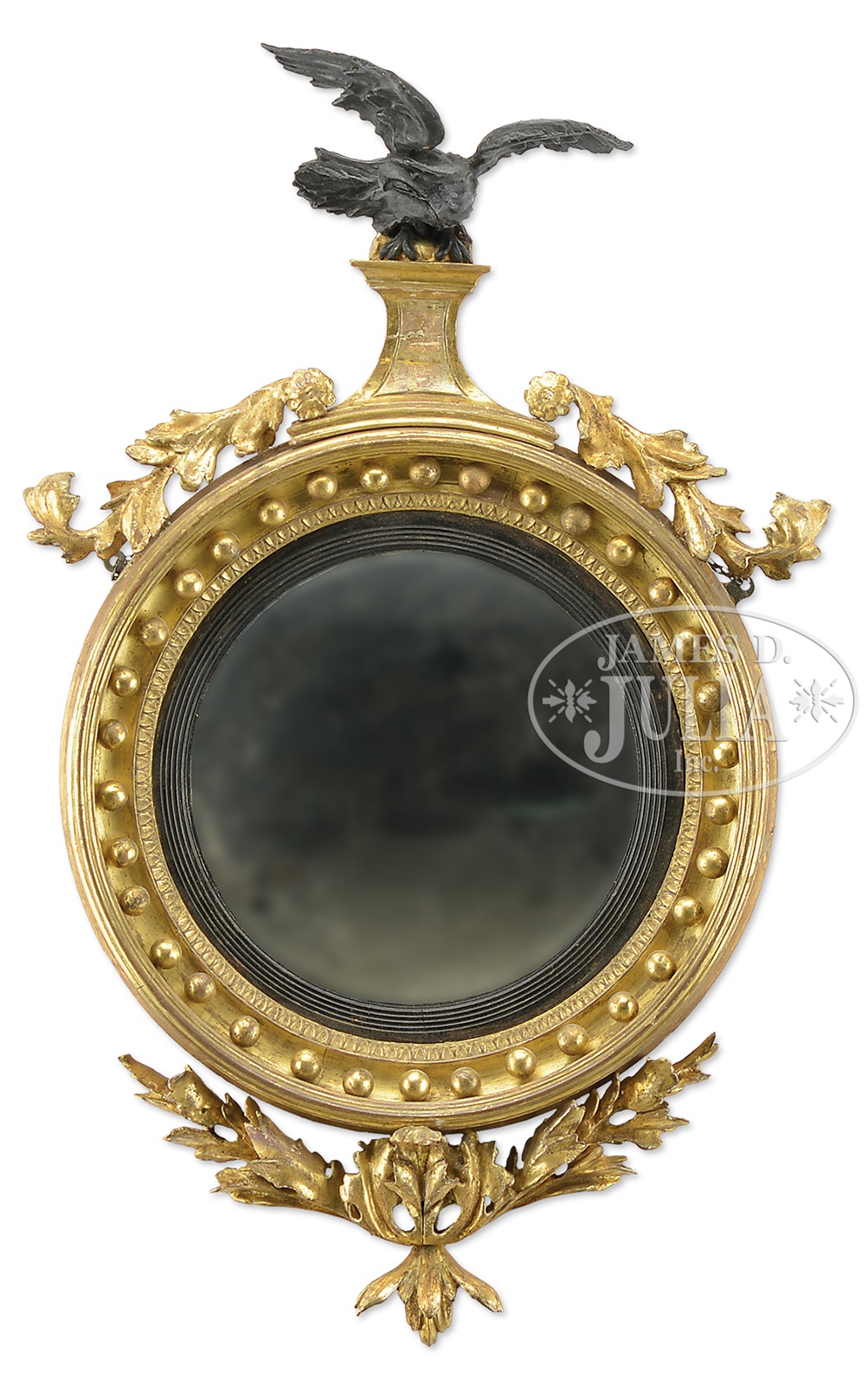 FEDERAL PERIOD CONVEX MIRROR.Late 18th, early 19th century, probably American, featuring a round framed gilt mirror topped with a finely carved eagle on gilt plinth crest, having gilt stylized foliate embellishments, gilt ball decoration with egg and dart molding around convex mirror with concentric molded frame. SIZE: 32″ h x 20″ w. CONDITION: Very good with old glued restoration to plinth, possibly repaint to eagle, retains original backboard. 7-70769 (2,000-3,000) – Lot 2249
