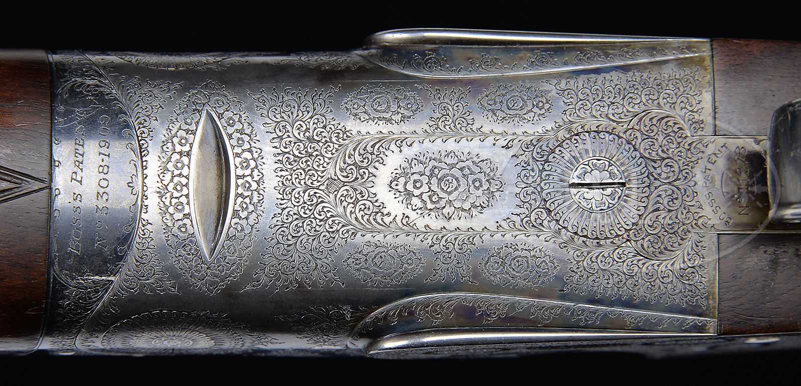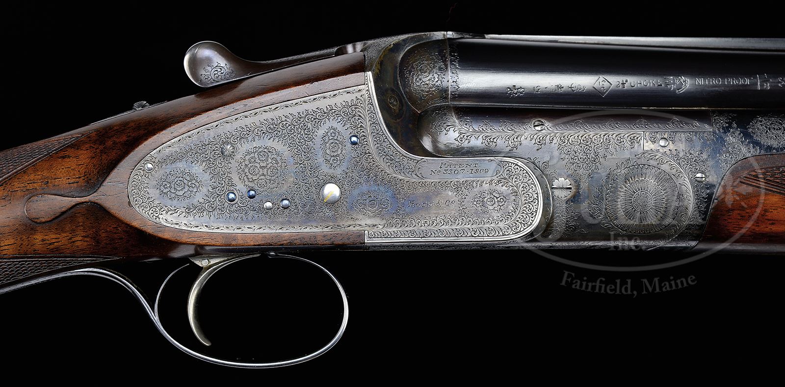 *FINE “GOLDEN AGE” BOSS OVER-UNDER SINGLE TRIGGER GAME GUN WITH CASE.SN 7903. (ca 1928) Cal. 12 ga. 2-3/4″ Chambers. 28″ Demi-bloc bbls fitted with narrow, matted, solid rib, are engraved “Boss & Co 41 Albemarle Street. Piccadilly. London. W.” and “Made in England” on left side of top bbl. Right side of top bbl and bottom bbl flat are stamped with London nitro proofs for 2-1/2″ chambers, along with a later London re-proof, charge and chamber unspecified. Bbls are stamped with Whitworth sheaf of wheat trademarks. SN is on bottom bbl. Classic low profile Boss OU action with its unique pivoting trunnions and removable jointing blocks on the circle, features non-automatic safety (SAFE gold inlaid), bushed strikers, gold band tumbler end cocking indicators, and Boss’ incomparable single trigger. Action is engraved with approx 80% coverage exceptionally well cut small scroll with 17 rose bouquets in Boss house style as executed by Jack Sumner. Boss’ OU patent no. is on each side of action. “Boss & Co” is on each lockplate. Trigger plate is marked with single trigger patent no. Blued, beaded, small bow trigger guard is engraved to match action, and has SN on tang. Classic lightly marbled and nicely flame figured European walnut straight grip buttstock measures 14-5/8″ over checkered wood butt, and features drop points, point pattern checkering with mullered borders at grip, and a vacant gold oval on toe line. Matching one piece forend is fitted with Boss’ distinctively styled ejector system and Anson release. Bore diameter: top -.730, bottom -.730. Bore restrictions: top -.008 (IC), bottom -.014 (lt mod). Wall thickness: top -.029, bottom -.029. Drop at heel: 2-1/4″, drop at comb: 1-1/2″. Weight: 6 lbs 12 oz. LOP: 14-5/8″. Abercrombie & Fitch marked leather VC case with stitched leather corners is embossed “M.S.P.” on top. Case is lined in burgundy cloth and has paper Boss Dover Street label in lid. Case contains a pair of snap caps, 2-pc wood and brass cleaning rod, A&F marked square oil bottle, and the key. CONDITION: Excellent. Bbls retain over 90% of what appears to be orig blue, sharp edges of rib silvered, and some thinning with further silvering on bolsters at breech ends from contact with case. Action retains 60 – 70% orig case hardening color, strong and vivid where protected, silvering on high points, and thinning on bottom from normal hand wear. Lockplates retain in excess of 90% of their color, right lock with most loss, silvered at bottom from finger wear. Top lever, forend iron, and trigger guard retain most of their orig blue. Stocks are very fine with numerous light marks, and an area of light pings on left side of butt, in what appears to be their orig finish. Checkering slightly worn and darkened. Bores are excellent with no visible imperfections. Action is tight. Bbls are on face. Ejectors are slightly out of time. Trigger works well. Case leather is still light in color, but has considerable chips and rubs, mostly on edges. One strap is missing, other strap and handle are good. Interior cloth is fine with some marks and rubs from contact with gun and bbls. Label is excellent. Accessories are good. A great handling classic Boss. 49305-12 MGM89 (50,000-70,000) – Lot 2250
