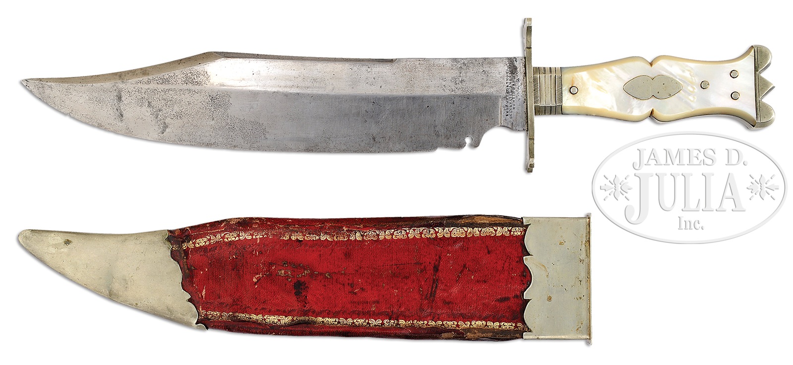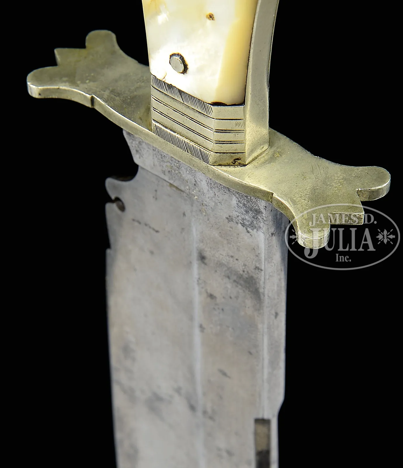 MASSIVE AND EXTREMELY RARE CIRCA 1835 BROOMHEAD & THOMAS “ARKANSAS TOOTHPICK”.This is one of only two known Bowies by this earliest of Sheffield makers, stamped on ricasso “BROOMHEAD & THOMAS / CELEBRATED AMERICAN / HUNTING KNIFE”. Scabbard is covered with red Moroccan leather with gold tooled decoration “THE CELEBRATED / ARKANSAS TOOTH PICK”. Knife measures 15-3/4″ with 10-3/4″ blade, just over 1/3″ thick at ricasso with 4-1/4″ clip point and additional 4″ beveled top and Spanish notch. Knife is German silver mounted including 3-1/4″ cross guard, scabbard mounts and escutcheons which fit into finely carved Mother-Of-Pearl slab grips. This is among the most desirable early American knives which Bob Abels in his iconic collection deemed “One of the finest knives in the collection”. PROVENANCE: Robert Abels collection, P. 7 Bowie Knives from the collections of Robert Abels & Ohio Historical Society, 1962; p. 19 Classic Bowie Knives, 1967; Charles Schreiner III collection, The Antique Bowie Knife Book, p. 362, 1990; Butterfield’s Lot #3891, 3-23 1992; Paul Tudor Jones II Collection CONDITION: Fine to excellent overall. Blade shows areas of original polish with overall bright/gray color with scattered areas of pin prick pitting and staining. German silver mounts on knife and scabbard have matching silver/gray patina, scabbard veneer has chipping on edges and about 2″ x 1-1/2″ piece missing losing part of 2 letters in text as can be seen in photos. 49941-12 JS (40,000-60,000) – Lot 2252 Click here to view provenance
