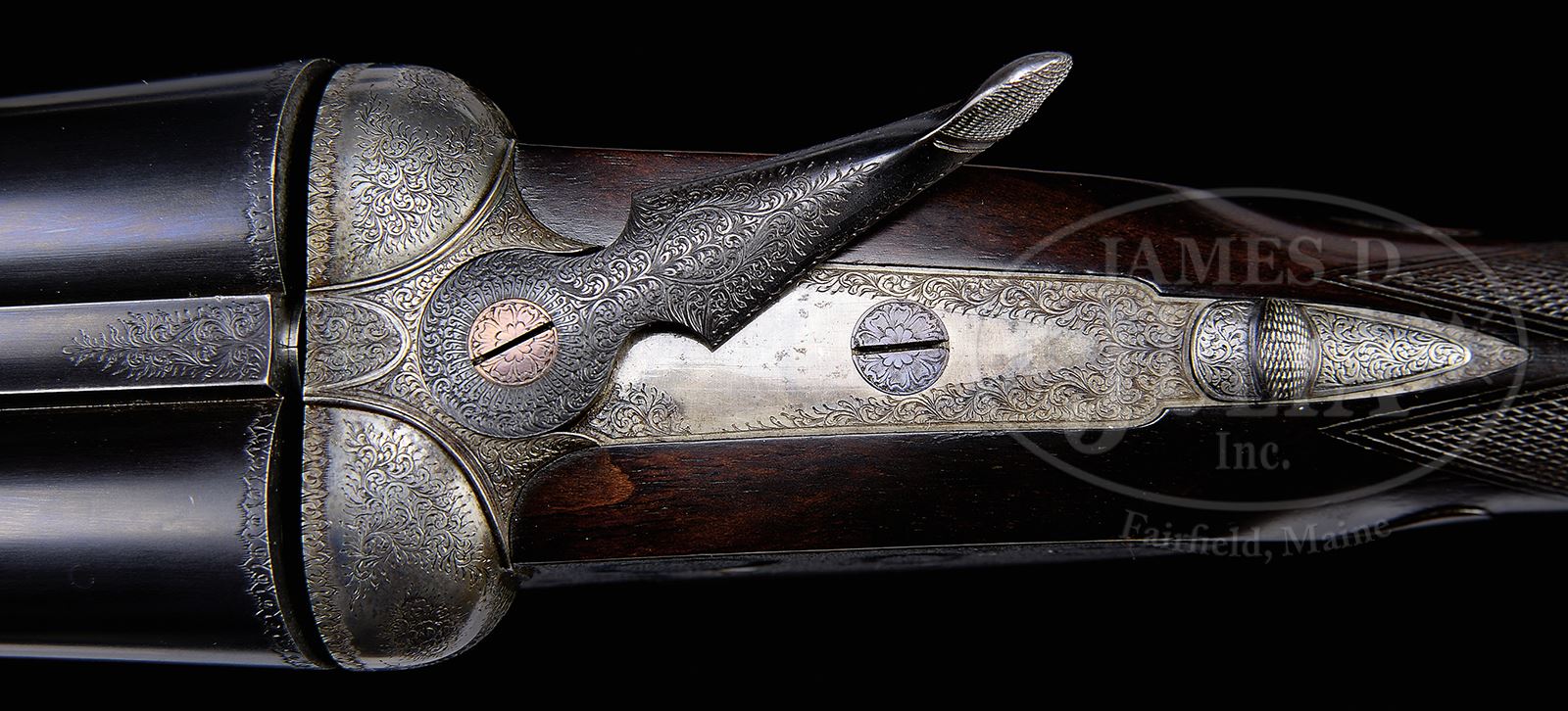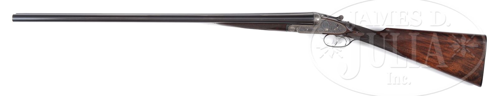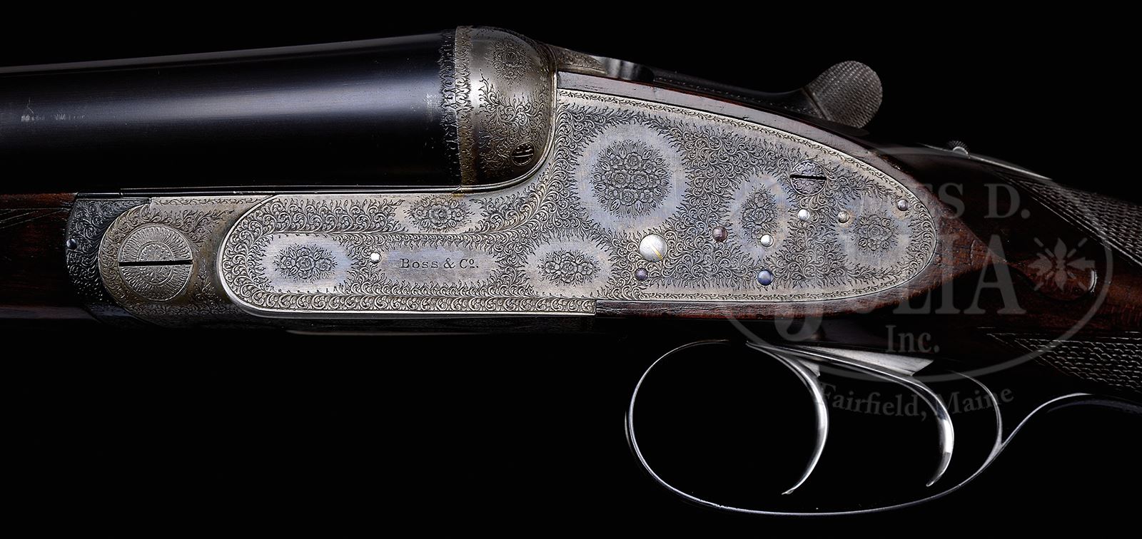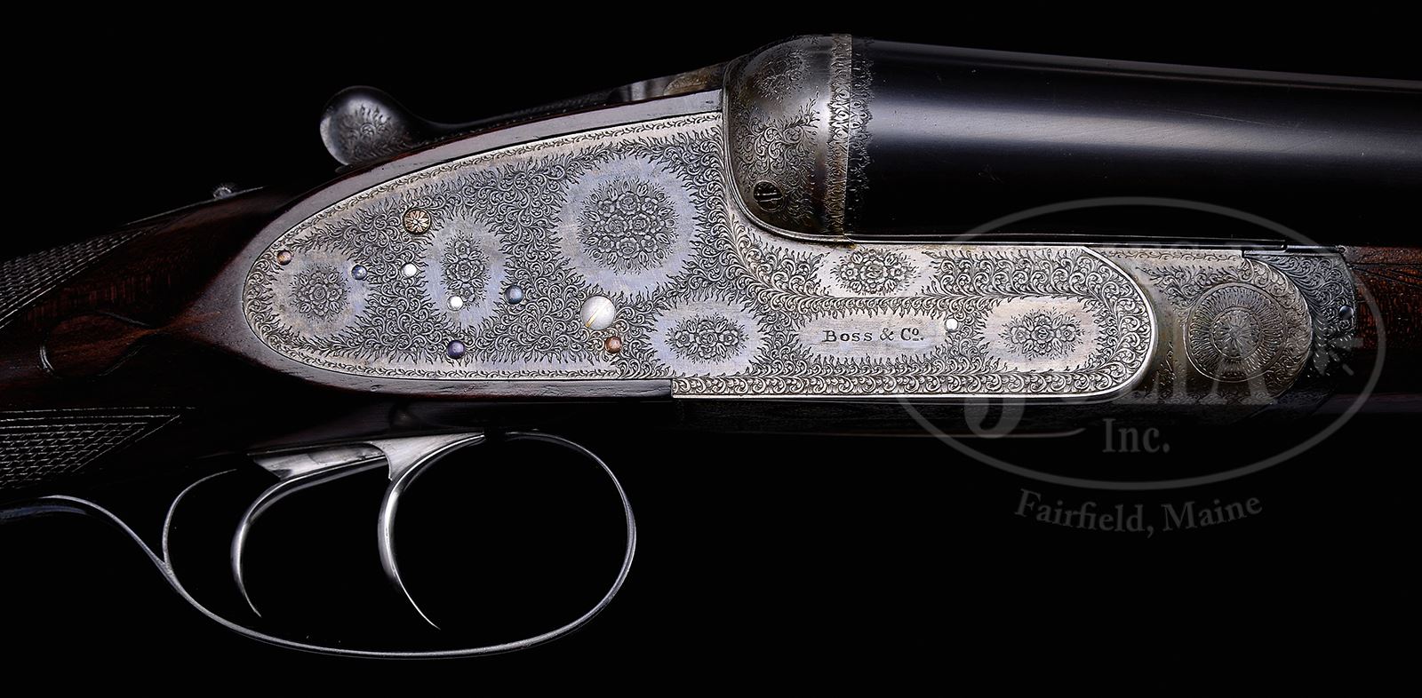 *LOVELY GOLDEN AGE HEAVY PROOF BOSS GAME GUN WITH CASE.SN 7593. (ca 1928) Cal. 12 ga. 2-3/4″ Chambers. 30″ Chopper lump bbls are engraved “Boss & Co. 13 Dover Street. Piccadilly, London. England.” on narrow, swamped game rib. Bbl flats are stamped with London nitro proofs for 2-3/4″ chambers, and “CHOKE”. SNs are on bottoms of bbls. Coin finished sidelock action is stocked to the fences, and features non-automatic safety (SAFE inlaid in gold) (automatic safety “wire” is in envelope in case), gold band tumbler end cocking indicators, bushed strikers, and double triggers. Action and lockplates are engraved in classic Boss house style, undoubtedly done by Jack Sumner, with exceptionally well cut, miniscule, shaded scroll surrounding 20 rose bouquets. “Boss & Co” is on each lockplate. Blued top lever and single beaded trigger guard are also scroll engraved. SN is in semi-relief at grip. Nicely marbled and lightly figured European walnut straight grip buttstock measures 14-1/2″ over checkered horn buttplate. Classic drop points are behind lockplates and typical point pattern checkering with mullered borders is at grip. A small gold oval engraved “P-L.T.” is on toe line which is shaped with 1/8″ negative camber giving swept racy look. Matching splinter forend has Anson release and is fitted with Boss’s highly rated ejector system. Bore diameter: left -.729, right -.729. Bore restrictions: left -.031 (full), right -.017 (mod). Wall thickness: left -.030, right -.027. Drop at heel: 2-1/4″, drop at comb: 1-9/16″. Weight: 7 lbs 2 oz. LOP: 14-1/2″. What is possibly orig makers oak and leather case with brass corners, has later inset leather rectangle on top, embossed “R. F. G.” Interior is lined in scarlet cloth, and has large paper Boss Dover Street label in lid. Case contains Boss marked snap caps, square oil bottle, and aforementioned automatic safety “wire”. CONDITION: Excellent, as partially, lightly, and correctly refinished. Bbls retain approx 95% of an old “best” re-black, thinned on sides from normal hand wear, silvered at sharp edges of breeches and muzzles. Action retains approx 60% orig case hardening color, silvering on fences and beads, thinning on bottom from normal hand wear. Lockplates retain over 90% of their orig color. Top lever is slightly silvered on thumbpiece. Trigger guard, possibly with correct re-black, is silvered on sharp edges and at grip. Stocks retain essentially all of a hand rubbed oil finish over a few scattered light dents and marks, with some subsequent light marks. Checkering has not been re-cut. Action is tight. Bbls are on face. Ejectors are strong and in time. Case leather is still light in color, darkening a bit on edges, and with a few rubs. Straps are good. Newer handle is excellent. Interior cloth is very fine with some compressions, rubs as well as soiling from contact with compartment knobs, action, and bbls. Label is considerably foxed with one or two marks and rubs. Accessories are fine. Simply a great, heavy proof Boss, that measures perfectly. 49580-2 MGM374 (30,000-50,000) – Lot 2253