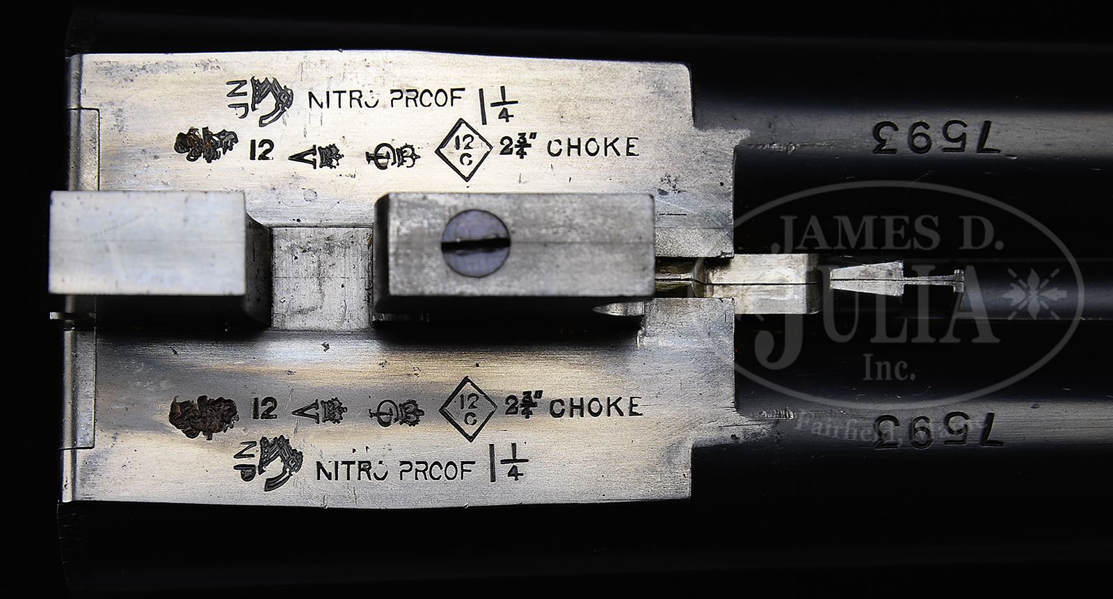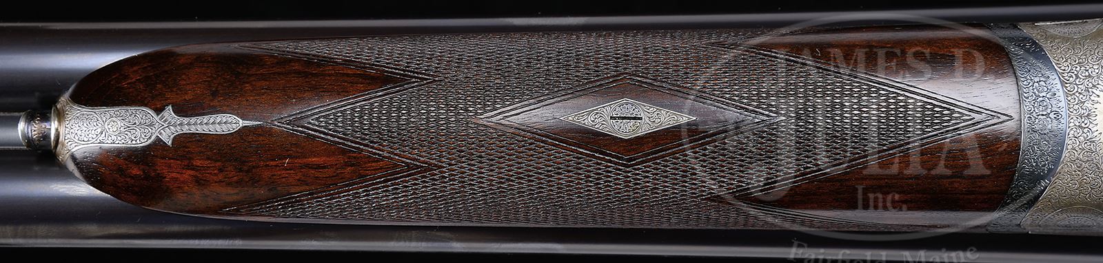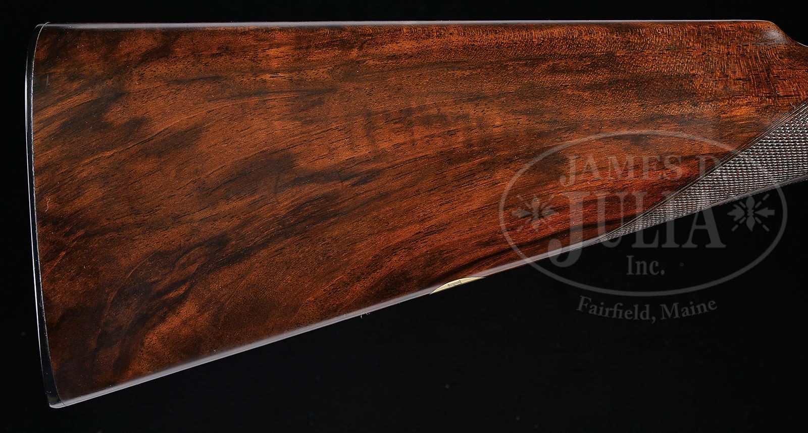 *LOVELY GOLDEN AGE HEAVY PROOF BOSS GAME GUN WITH CASE.SN 7593. (ca 1928) Cal. 12 ga. 2-3/4″ Chambers. 30″ Chopper lump bbls are engraved “Boss & Co. 13 Dover Street. Piccadilly, London. England.” on narrow, swamped game rib. Bbl flats are stamped with London nitro proofs for 2-3/4″ chambers, and “CHOKE”. SNs are on bottoms of bbls. Coin finished sidelock action is stocked to the fences, and features non-automatic safety (SAFE inlaid in gold) (automatic safety “wire” is in envelope in case), gold band tumbler end cocking indicators, bushed strikers, and double triggers. Action and lockplates are engraved in classic Boss house style, undoubtedly done by Jack Sumner, with exceptionally well cut, miniscule, shaded scroll surrounding 20 rose bouquets. “Boss & Co” is on each lockplate. Blued top lever and single beaded trigger guard are also scroll engraved. SN is in semi-relief at grip. Nicely marbled and lightly figured European walnut straight grip buttstock measures 14-1/2″ over checkered horn buttplate. Classic drop points are behind lockplates and typical point pattern checkering with mullered borders is at grip. A small gold oval engraved “P-L.T.” is on toe line which is shaped with 1/8″ negative camber giving swept racy look. Matching splinter forend has Anson release and is fitted with Boss’s highly rated ejector system. Bore diameter: left -.729, right -.729. Bore restrictions: left -.031 (full), right -.017 (mod). Wall thickness: left -.030, right -.027. Drop at heel: 2-1/4″, drop at comb: 1-9/16″. Weight: 7 lbs 2 oz. LOP: 14-1/2″. What is possibly orig makers oak and leather case with brass corners, has later inset leather rectangle on top, embossed “R. F. G.” Interior is lined in scarlet cloth, and has large paper Boss Dover Street label in lid. Case contains Boss marked snap caps, square oil bottle, and aforementioned automatic safety “wire”. CONDITION: Excellent, as partially, lightly, and correctly refinished. Bbls retain approx 95% of an old “best” re-black, thinned on sides from normal hand wear, silvered at sharp edges of breeches and muzzles. Action retains approx 60% orig case hardening color, silvering on fences and beads, thinning on bottom from normal hand wear. Lockplates retain over 90% of their orig color. Top lever is slightly silvered on thumbpiece. Trigger guard, possibly with correct re-black, is silvered on sharp edges and at grip. Stocks retain essentially all of a hand rubbed oil finish over a few scattered light dents and marks, with some subsequent light marks. Checkering has not been re-cut. Action is tight. Bbls are on face. Ejectors are strong and in time. Case leather is still light in color, darkening a bit on edges, and with a few rubs. Straps are good. Newer handle is excellent. Interior cloth is very fine with some compressions, rubs as well as soiling from contact with compartment knobs, action, and bbls. Label is considerably foxed with one or two marks and rubs. Accessories are fine. Simply a great, heavy proof Boss, that measures perfectly. 49580-2 MGM374 (30,000-50,000) – Lot 2253
