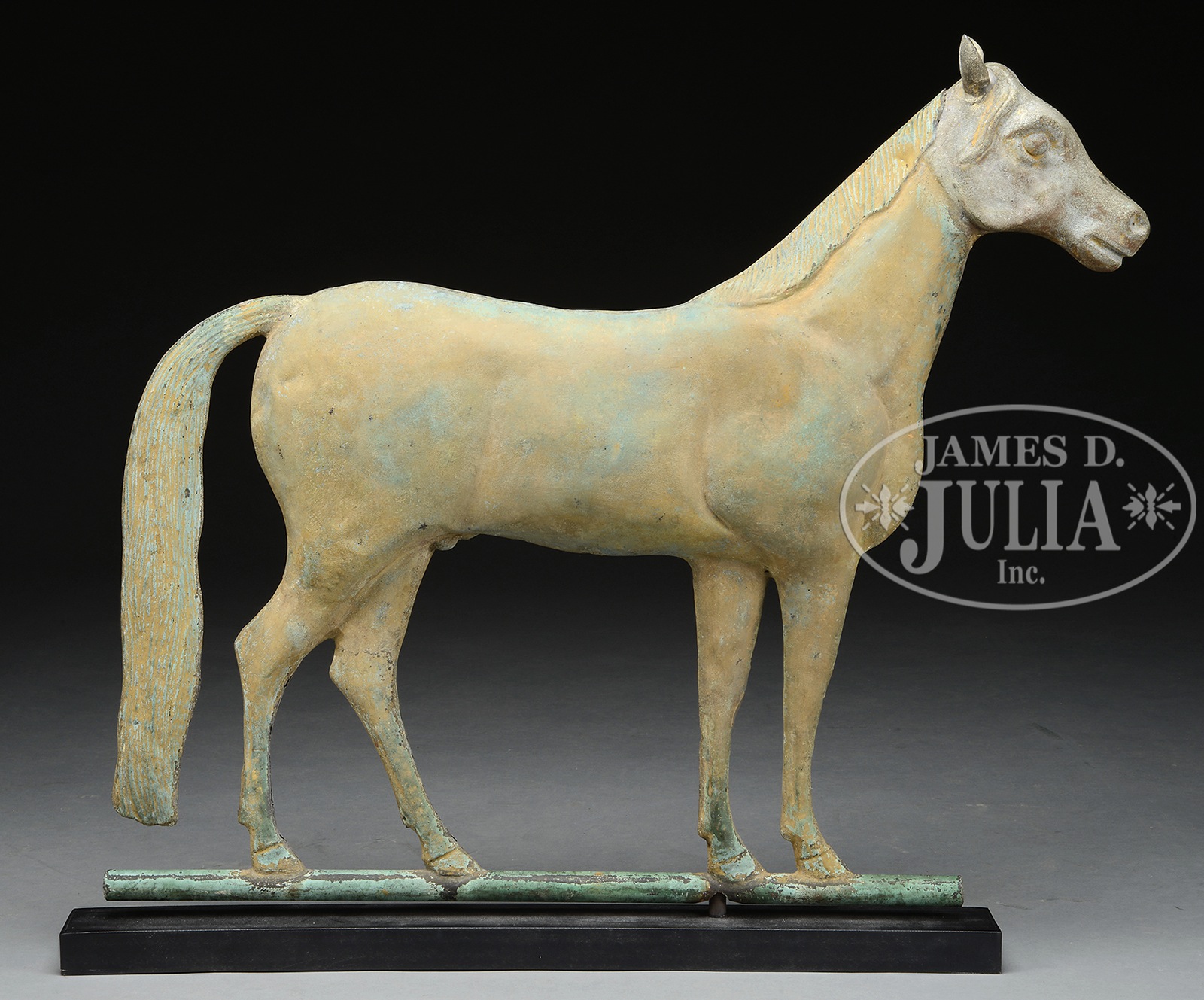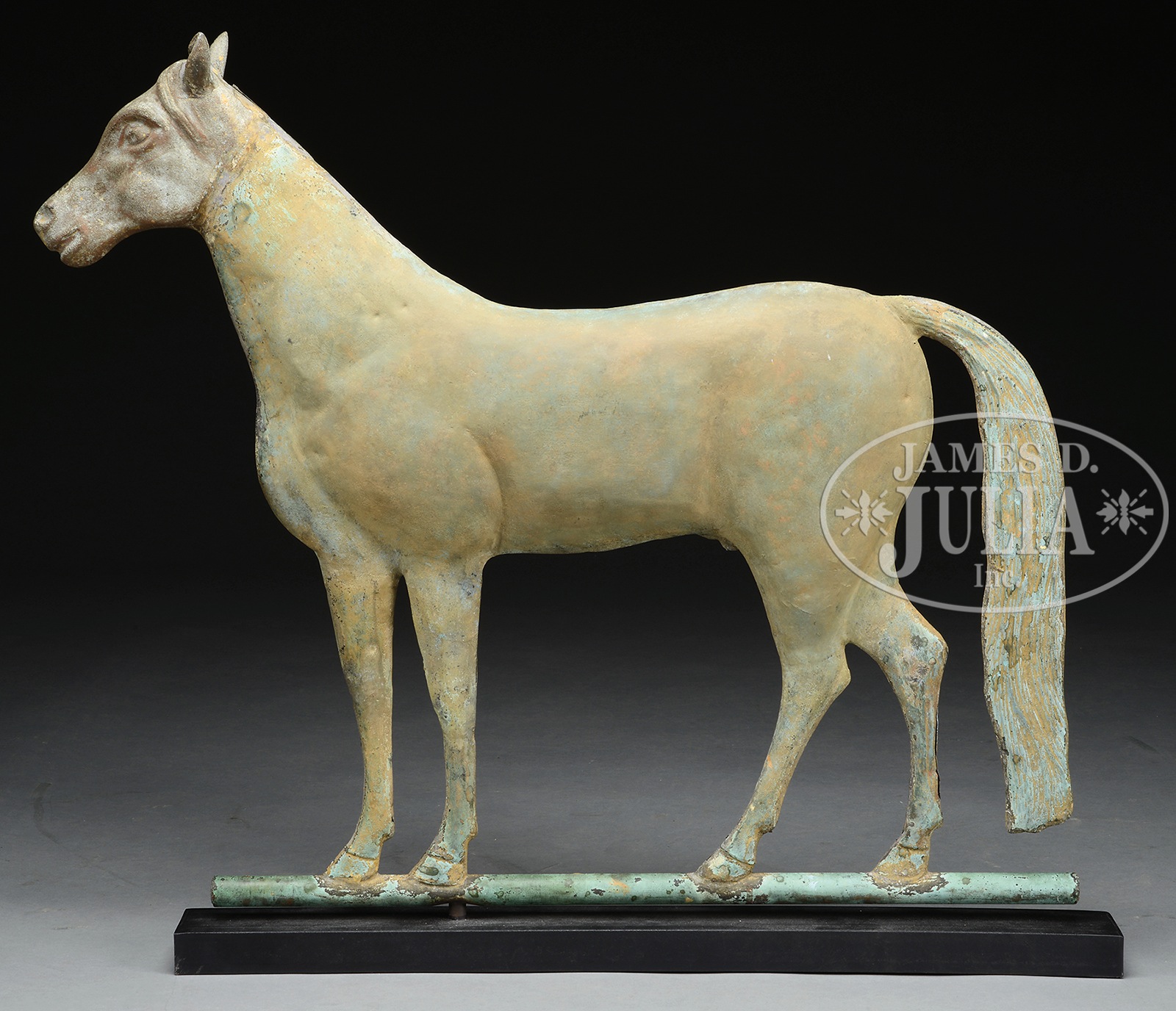 MOLDED COPPER LEXINGTON HORSE WEATHERVANE.American, circa 1885. A very fine large example with cast zinc head and repousse copper body. A rare and desirable form, on custom made iron display stand. SIZE: 29″ h x 32″ l. CONDITION: Very good condition with appealing old surface. Minor professional restoration to the body of the horse due to bullet hole damage. Some weathered erosion to solder seams. 49221-1 (12,000-15,000) – Lot 2253
