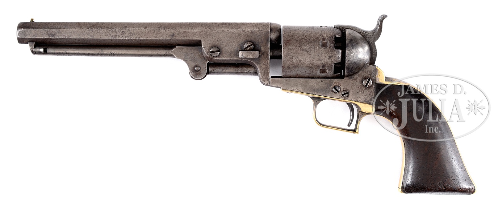 RARE EARLY TRANSITIONAL MODEL SQUAREBACK 1851 NAVY REVOLVER.SN 923. Cal. 36. This is a scarce example of an early 3-digit Colt Percussion Navy revolver made in 1851, which theoretically by SN should be in 1st Model range, however this is a correct pure 2nd Model with 1-line New York address. PROVENANCE: The Estate of G. W. “Bill” Stewart of Sonora, Texas. CONDITION: Good to very good overall condition with traces of original finish remaining. Serial numbers are all matching except cylinder which is numbered #823 rather than #923 (however we feel this is a factory error). Mechanically gun is functional with discernible rifling in bore. 49973-496 JS (5,000-7,000) – Lot 2254