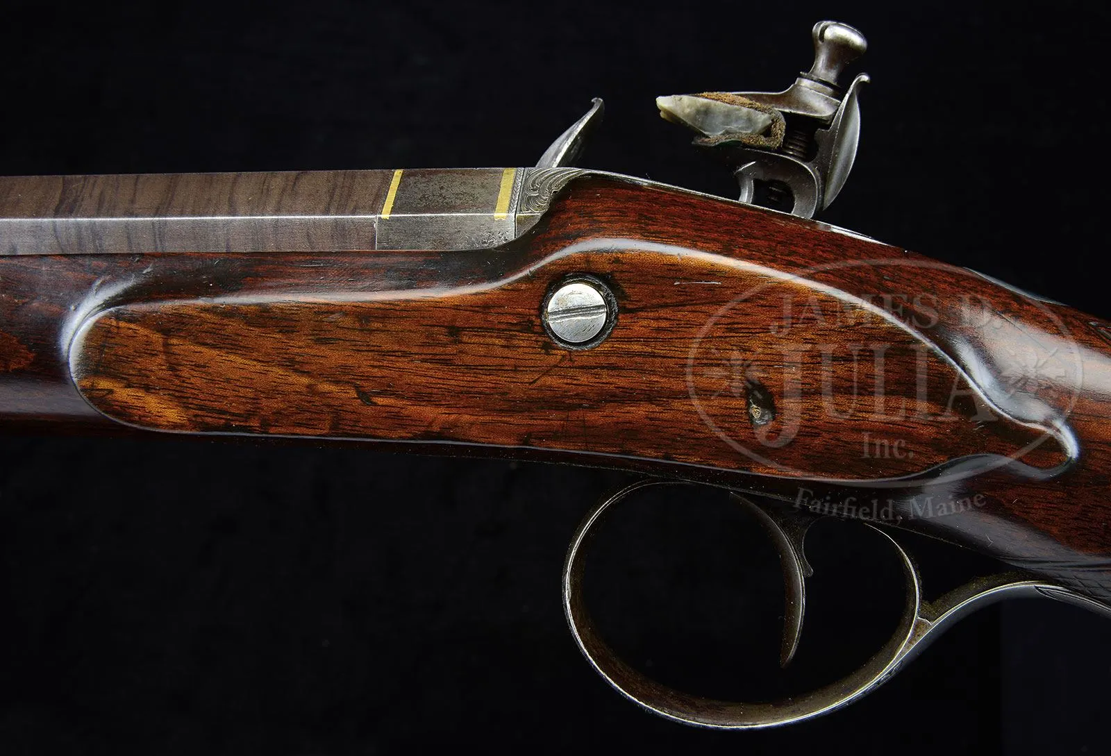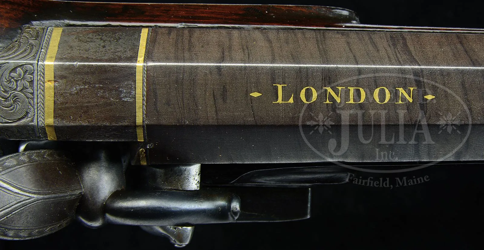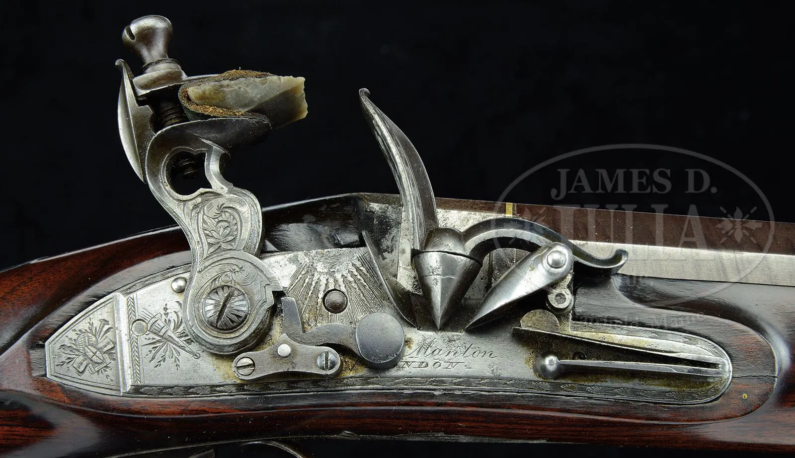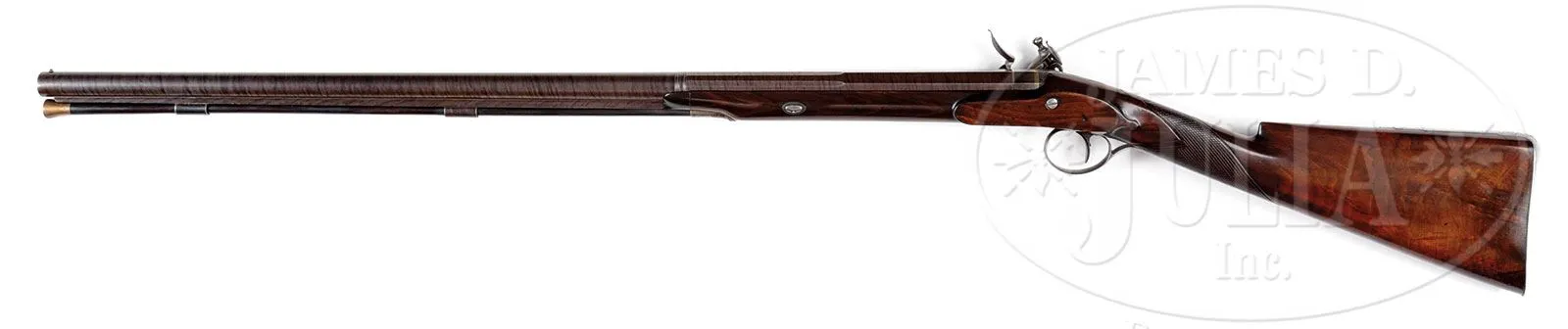 JOSEPH MANTON SINGLE BARREL FLINTLOCK FOWLER.SN 1503. (ca 1801) Cal. 14 ga. .690 Bore diameter. 28″ Twist bbl transitions from octagon to 16-sided, t0 wedding band to round. A rib is mounted to underside of bbl which is fitted with two plain pipes holding greenheart ramrod with brass head and tail with worm under cap. Top flat at rear is gold inlaid “LONDON”. Bottom of bbl is stamped with gunmakers proof and no. “1503”. Inset patent breech has platinum touch hole, and is embellished with two gold bands. Breech iron is deeply engraved with flowers and scroll. Lock with waterproof pan and roller frizzen has chamfered plate with rebated square tail. Lock is fitted with nicely filed double breasted reinforced cock, and Manton’s patented gravitating stop. Lock is engraved with stand-of-arms type motifs, sunburst in front of cock, and “Manton London” under pan, which is gold lined. Trigger plate has stylized pineapple finial, and stand-of-arms engraving is on trigger guard bow. Dense, stump figured European walnut stock measures 14-1/8″ over steel buttplate with stand-of-arms engraving on extra long top tang. Half stock with horn tip features drop points, coarse point pattern checkering, and a vacant silver oval at top of grip. Stock attaches to bbl with captive side nail through oval silver escutcheons. Minimum wall thickness: -.055. Drop at heel: 2″, drop at comb: 1-5/8″. Weight: 5 lbs. 11 oz. LOP: 14-1/8″. Mahogany case with inlet D ring brass handle has pivoting hook closure. Case is lined in green baize with a reproduction Joseph Manton label in lid. Case contains an oak leaf embossed Hawksley powder flask, and leather shot flask embossed with hunting dogs. PROVENANCE: Consignors notes. Guy A. Ritter Collection. CONDITION: Fine, as partially refinished. Bbl retains nearly all of an old re-brown with good definition to pattern, edges slightly softened. Lock is cleaned to pewter gray. Other metal parts are also pewter gray, engraving clear. Stock retains most of an old refinish over some fairly deep marks, and with a few subsequent marks. There is a repair to left side bbl channel; otherwise stock appears sound. Lock pin is a replacement. Bore is very fine, shiny throughout, with one or two pits toward muzzle. Lock and frizzen are crisp. Gravitating stop works freely. Gold lining of pan is a replacement. Case retains most of an old varnish refinish over a number of marks, with a few subsequent marks. Interior cloth is fine with minor insect damage. Interior partitions have been moved, some areas patched in with non-matching cloth. Flasks are good. This nice handling gun would make a fine shooter. 4-51582 MGM200 (4,000-6,000) – Lot 2255 Click here to view provenance