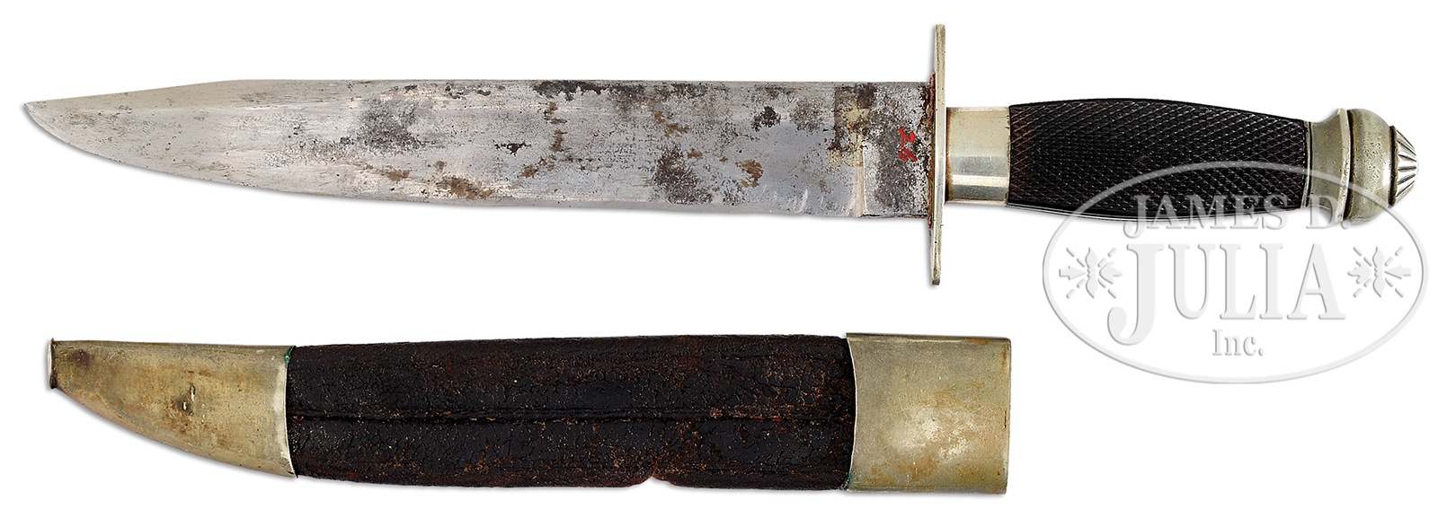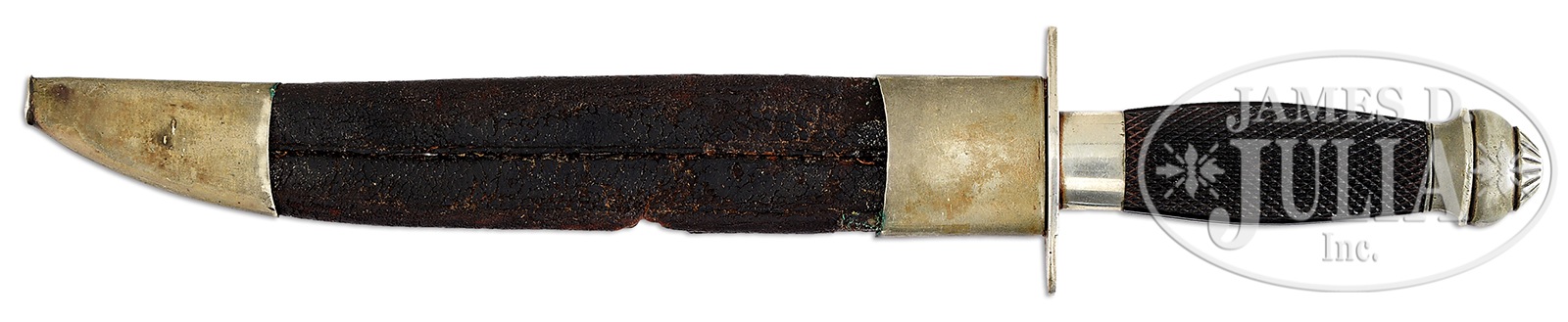 RARE AND FINE “ARKANSAS TOOTHPICK” BY GOERGEN, NEW ORLEANS.This earliest of New Orleans marked Bowies measures 13-5/8″ overall with an 8-7/8″ clip point blade, .30″ thick at ricasso, etched “Arkansas Tooth Pick” in 5-1/2″ panel. Etched on top of blade “MANUFACTURED FOR F. C. GOERGEN, NEW ORLEANS”. This knife dates circa 1840 in unique form to Goergen, German silver mounted with formed checkered ebony grip. Few of these knives survive with such fine discernible blade markings. PROVENANCE: Robert Berryman collecton; Lot #3906 Butterfield’s 3-23 1992; Paul Tudor Jones II Collection. CONDITION: Blade shows areas of original frost and polish but overall gray with scattered old sharpening marks. Manufacturers mark is mostly discernible though partially obscured by tool marks. 2-3/4″ German silver cross guard and other German silver knife and scabbard mounts have mixed gray and dark patinas. Scabbard mounts have several dents and dings with untouched patina, tooled leather scabbard body is dry, heavily flaked but still retains some original polished surface with one 1/4″ chip of leather missing on cutting edge. Ebony grip has about 1″ age crack on one side as can be seen in photos which does not affect aesthetics. 49941-29 JS (7,000-9,000) – Lot 2255 Click here to view provenance
