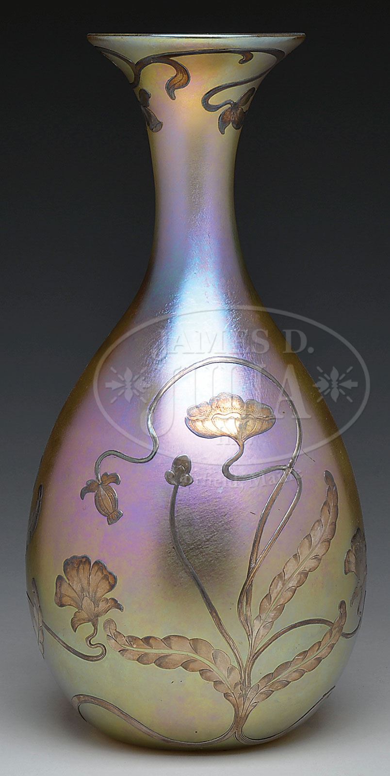 Monumental Quezal vase has bulbous body with slender neck and flaring rim. The vase is finished in gold iridescence with purple and blue highlights and very bright gold iridescence on the interior. Vase is further decorated with sterling silver overlay flowers, stems and leaves encircling the body. Signed in the polished pontil “Quezal” with a scroll. SIZE: 14-7/8″ t. CONDITION: There have been repairs to the silver overlay, one area had come loose and was glued back with glue residue remaining. The silver has lifted below the glue repair. On a silver area near the foot there are three flakes indicating the silver has lifted and been repaired. There are several small nicks and scratches to the iridescent surface on the body of the vase. 5-69424 (1,200-1,800) – Lot 2257