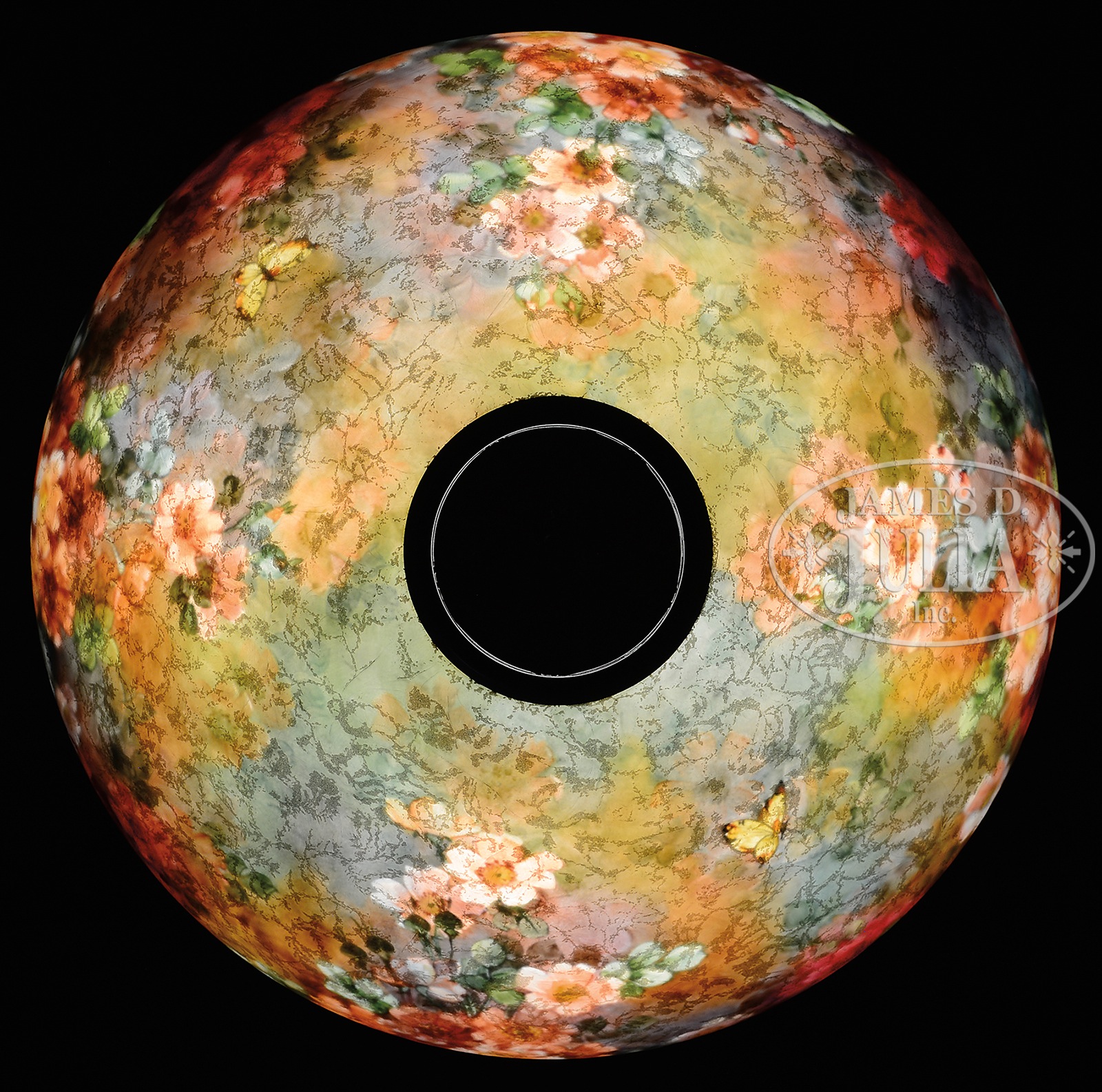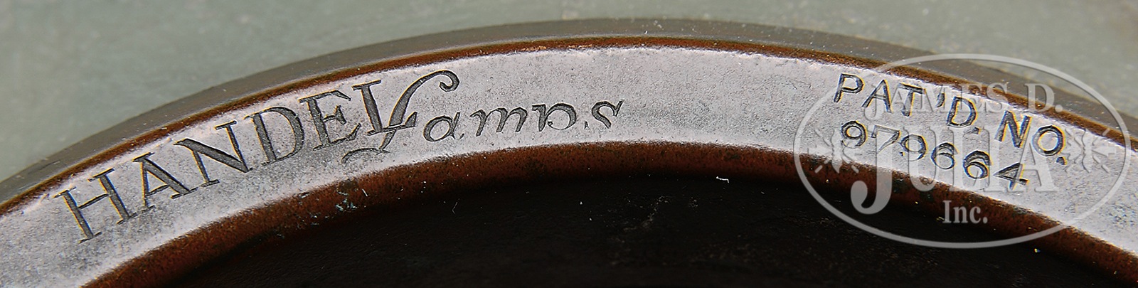HANDEL 6688 REVERSE PAINTED TABLE LAMP.Handel 6688 table lamp is reverse painted with brightly colored pink, red and yellow flowers extending upward from the rim with a background of flower outlines encircling the entire shade. Two yellow and orange butterflies fly above the flowers. Exterior of the shade has a chipped ice finish and shade is signed on interior “Handel 6688”. Shade rests on a Handel base with acanthus leaf decoration surrounding the foot and stem. Base has a three-light cluster and fleur de lis heat cap. All finished in a bright brown patina. Shade is marked on the bottom with cloth tag “Handel Lamps”. SIZE: Shade is 18″ dia. Lamp is 24″ t. CONDITION: Very good to excellent. Base has been rewired with contemporary plastic cord. 5-68506 (10,000-12,000) – Lot 2258