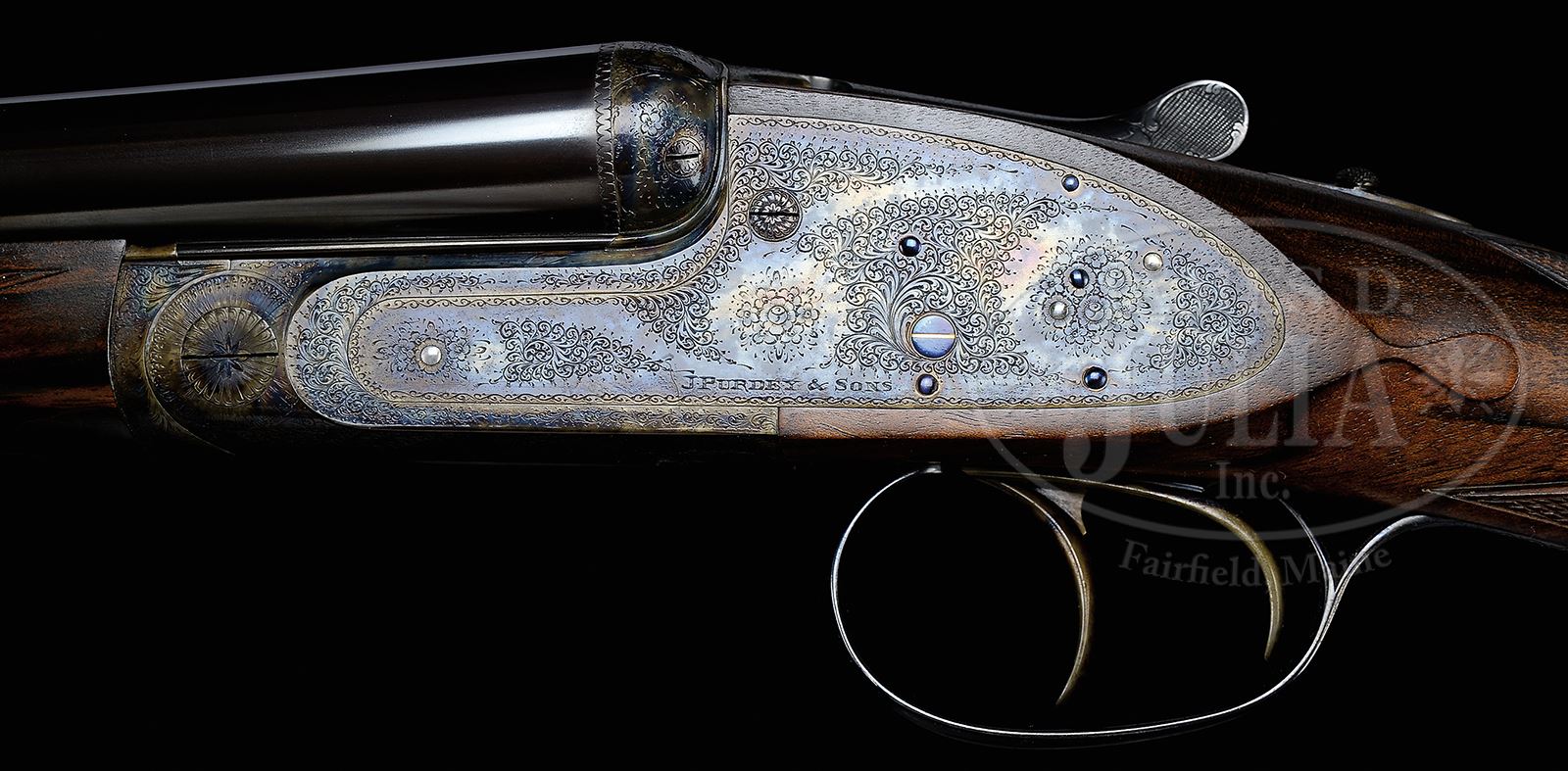 *SUPERB TWENTY BORE JAMES PURDEY SIDELOCK EJECTOR GAME GUN WITH CASE.SN 30357. (2009) Cal. 20 bore. This svelte small bore gun has finely struck 27″ chopper lump bbls with narrow, concave game rib. Tops of bbls are engraved “J. Purdey & Sons” and “London England”. Bbl flats are stamped with 2009 London nitro proofs for 2-3/4″ chambers. Bottom of rear lump is engraved with importers name and address (Griffin & Howe). Bottom of right bbl is stamped with SN. Small case hardened Beesley patent self-opening action features non-automatic safety (SAFE gold inlaid), bushed strikers, gold band tumbler end cocking indicators, and double triggers. Action and lockplates are engraved in classic Purdey house style with well cut small scroll and rose bouquets. “J. Purdey & Sons” is on each lockplate. Engravers signature, “M Bublik”, is on trigger plate in front of trigger guard bow. Blued single beaded trigger guard is also rose and scroll engraved, and has SN at grip. Exceptional European walnut buttstock with dark veining and flashy figure measures 14-5/8″ over checkered wood butt. Classic drop points are behind lockplates. Standard point pattern checkering with mullered borders is at grip. A vacant gold oval is on toe line. Matching splinter ejector forend with iron engraved with initials “J. C. B” has Anson release. Bore diameter: left -.611, right -.611. Bore restrictions: left -.008 (IC), right -.000 (cyl). Wall thickness: left -.033, right -.033. Drop at heel: 1-15/16″, drop at comb: 1-3/8″. Weight: 5 lbs 14 oz. LOP: 14-5/8”. Makers tan leather case with stitched leather corners is stamped with Purdey name and “London” under latch. Case is lined in scarlet cloth and has gold embossed black leather Purdey label in lid. Case contains a pair of Purdey marked brass and ebony snap caps, Purdey marked round oil bottle, and Purdey new gun/ maintenance record booklet containing information on this gun. CONDITION: Excellent, near new, with scant evidence of light field use. Bbls show a hint of silvering on sharp edges and some marks from contact with forend. Top lever shows the slightest of silvering on top sharp edge of thumbpiece. There is some slight silvering at grip on trigger guard. Breechfaces show some slight halos from cartridges. There are a few minor light marks on butt. Action is tight. Bbls are on face. Ejectors are strong and in time. Case leather is excellent with one or two minor scuffs. Handle and straps are excellent. Interior cloth is also excellent with the slightest of soiling and rubs from contact with action and bbls. Accessories are excellent. This light and lively small bore Purdey would make an excellent quail or woodcock gun. 49052-1 MGM29 (55,000-75,000) – Lot 2258