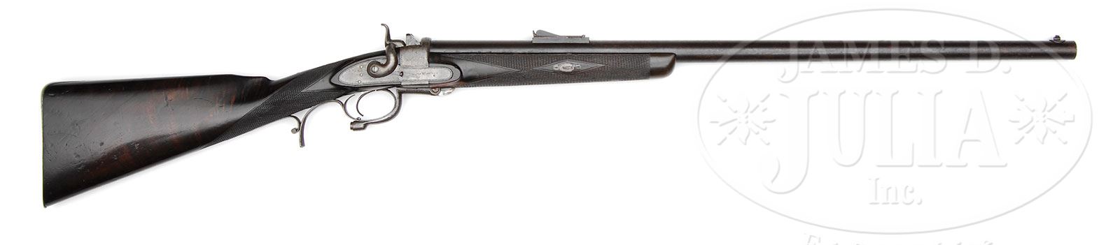 HISTORICALLY IMPORTANT, VERY EARLY ALEXANDER HENRY BAR LOCK ACTION DROPPING BLOCK SINGLE SHOT RIFLE.SN 1421. Cal. .577 2-3/4 BPE. This exceptionally early rifle, action no. 8, is possibly the first commercially sold Alex Henry rifle, as 6 of the first rifles produced were submitted to government trial. This large caliber rifle has 28″ slightly tapered, round bbl mounted with interesting tangent express rear sight with long range ladder, and small bead front sight mounted on pedestal. Top of bbl is engraved “Alex’r Henry 12 South St. Andrews St.” in front of rear sight, and “Edinburgh Patent Nos 831 and 8” referring to patent use numbers of bbl 831 and action 8. Earliest type dropping block action with extreme cutaway breech block to help seat recalcitrant rounds and earliest type sliding extractor, is border engraved and marked on top of thin receiver ring “Patent No 8”. Simple operating lever has push button lock engaging slot in trigger guard bow. Bar action lock features forward sliding safety, which engages at half cock, with tall round bodied serpentine hammer. Lockplate has border engraving and is marked “Alex’r Henry”. Trigger guard has checkered spur extending into pistol grip. Nicely figured and lightly marbled dark European walnut buttstock measures 14″ over steel buttplate with medium tang. Grip is checkered in point pattern with mullered borders. “F. O’Brien “Orange”” is stamped on left side of butt toward plate. (Orange probably refers to Orange Free State, South Africa.) Matching forend with horn tip attaches to bbl with captive side nail through shaped oval border engraved escutcheons. Drop at heel: approx 2-3/16″, drop at comb: approx 1-3/4″. Weight: 7 lbs. 7 oz. LOP: 14″. CONDITION: Good. Bbl retains approx 30% of what appears to be orig blue with considerable light pitting overall, balance turning to brown. Action is mostly dark pewter gray, with scant traces of case hardening color in protected areas. Lock is mostly gray to brown with traces of fire blue on safety. Stocks retain what appears to be orig oil finish, maintained over the years with rubbed in oil, with numerous marks, bumps, and digs. Metal of buttplate is proud of wood. Front flute of comb appears to have been chipped many years ago, and has been smoothed over. A section of forend under front portion of lock has been replaced. Lock is crisp. Safety works. Breech block is loose, and has been peaned to tighten. 3/8″ x 1/2″ area of floorplate is chipped out and missing, probably from over zealous use of opening lever. Bore, with strong rifling, is lightly pitted throughout. This interesting rifle is illustrated and described in BRITISH SINGLE SHOT RIFLES Vol. 1 by Wal Winfer on p. 41, figure 26, and listed by Jonathan Kirton in his chapter on Alexander Henry in THE BRITISH FALLING BLOCK BREECHLOADING RIFLE FROM 1865, as the second earliest and as “sporting rifle border engraved”, with only patent use no. 3 being earlier. which is listed as “R & D for Army trials”. 4-51931 MGM53 (4,000-6,000) – Lot 2259