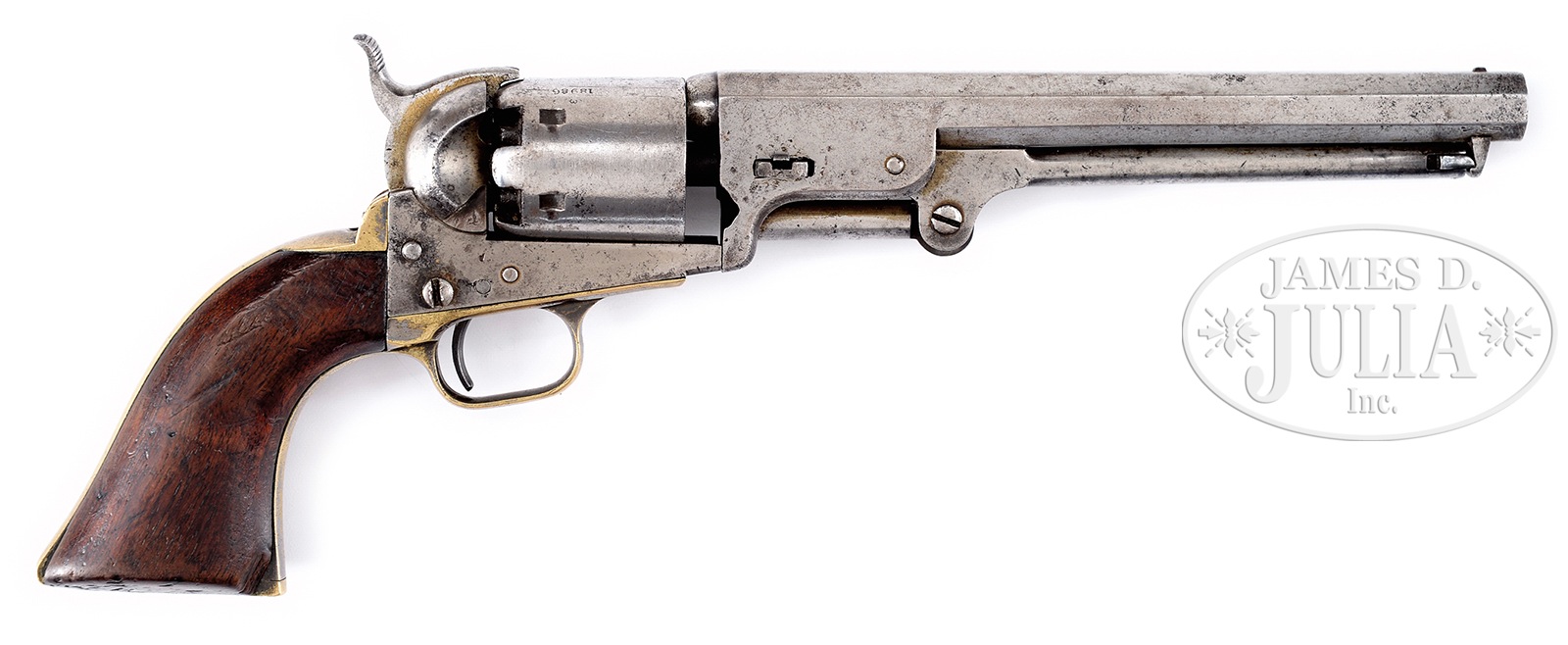 SCARCE COLT 1851 NAVY CUT FOR SHOULDER STOCK.SN 18989. Cal. 36. Standard configuration, 7-1/2″ bbl, 6-shot cylinder, near full-length loading lever, top of bbl marked “Address SamL. Colt New York City”. 4-screw frame marked on front of left side “Colt’s Patent”, 1-pc walnut grip, brass trigger guard and backstrap. Matching SNs throughout. PROVENANCE: The Estate of G. W. “Bill” Stewart of Sonora, Texas. CONDITION: Fair overall retaining no orig finish to metal surfaces. Front sight has thinned. All metal surfaces with minute pinprick pitting and minor staining. No cylinder scene is present. Grips are good, minor losses at toe. Scattered handling marks and scratches throughout. Mechanics are good. Bore is fair though rifling appears strong. 49973-136 JSL (1,800-3,800) – Lot 2259