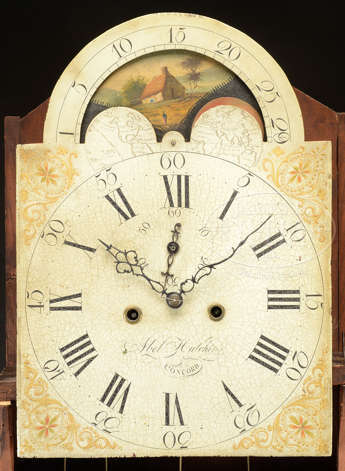 IMPORTANT ABEL HUTCHINS INLAID MAHOGANY TALL CASE CLOCK.Concord, New Hampshire. Abel Hutchins active 1786 through first quarter 19th century. This fine tall case clock circa 1810 with arched scrolling pierced fretwork alternating with inlaid pediments, each surmounted by original reeded ball and spire brass finials above the cove molded cornice supported by free standing fluted columns with brass capitals and bases centering the arched door opening to a painted dial with Roman numeral and Arabic chapter rings centering a subsidiary seconds dial and time and strike apertures above “Abel Hutchins” in flowing script above “CONCORD”. The dial within delicate painted gilt foliate spandrels all beneath a painted moon phase dial within the arch. The eight day brass movement striking on a bell. The cased throat with rectangular inlaid door with finely molded edges and central oval inlaid patera flanked by engaged stop fluted quarter columns joined to the cove molded box base raised on slender delicate French feet centering a shaped apron. The box base with oval figured maple inlaid patera. NOTE: Clock is accompanied by three brass finials, winder, door key, pendulum and pair of weights. SIZE: 7’10-3/4″ overall height. Throat width 14-1/4″. 9-1/2″ d. PROVENANCE: From a private Maine collection. CONDITION: Overall very good original condition with fine mellow patina and well polished and maintained surface. Brass finials and fretwork appear original as is dial and movement. Small stable shrinkage cracks above cased door and on box base. Losses to string inlay border of base. Otherwise very good. 52345-4 (5,000-8,000) – Lot 2259