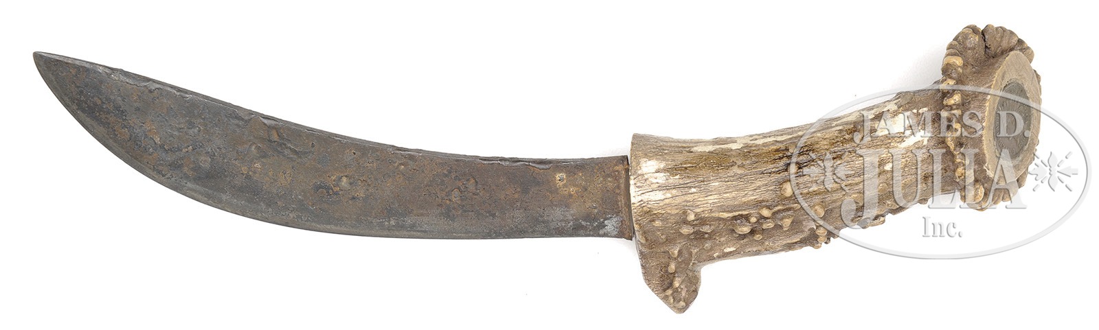 SMALL HOMEMADE INDIAN SCALPING KNIFE.Unusual knife with 6″ curved blade mounted in a crown stag handle, held in place with solder or pewter. Butt of handle in inlaid with an Indian head penny dated 1862. Penny appears to be secured in place with a crystallized resin of some sort, possibly horn or hoof glue used by the Indians. Blade has numerous dents and dings which consignor states were probably created during the Sioux Ghost Dance. During this dance, which was outlawed by the whites, warriors would clash their weapons together such as a hatchet and knife, which could cause such damage to the blades. The stag handle, near the crown buttcap, is covered in a reddish finish that is probably oil and ochre applied to their weapons to represent “blood of the Messiah”. Consignor speculates that the knife was made after the Little Big Horn but was told that the coin came from the battle. PROVENANCE: Wendell Grangaard Collection. CONDITION: Fair. Blade shows hand sharpening and overall is a dark blackish patina with numerous dents and dings; handle shows moderate wear with some red staining around the crown and in some of the recesses. 4-49347 JR530 (2,000-3,000) – Lot 2262