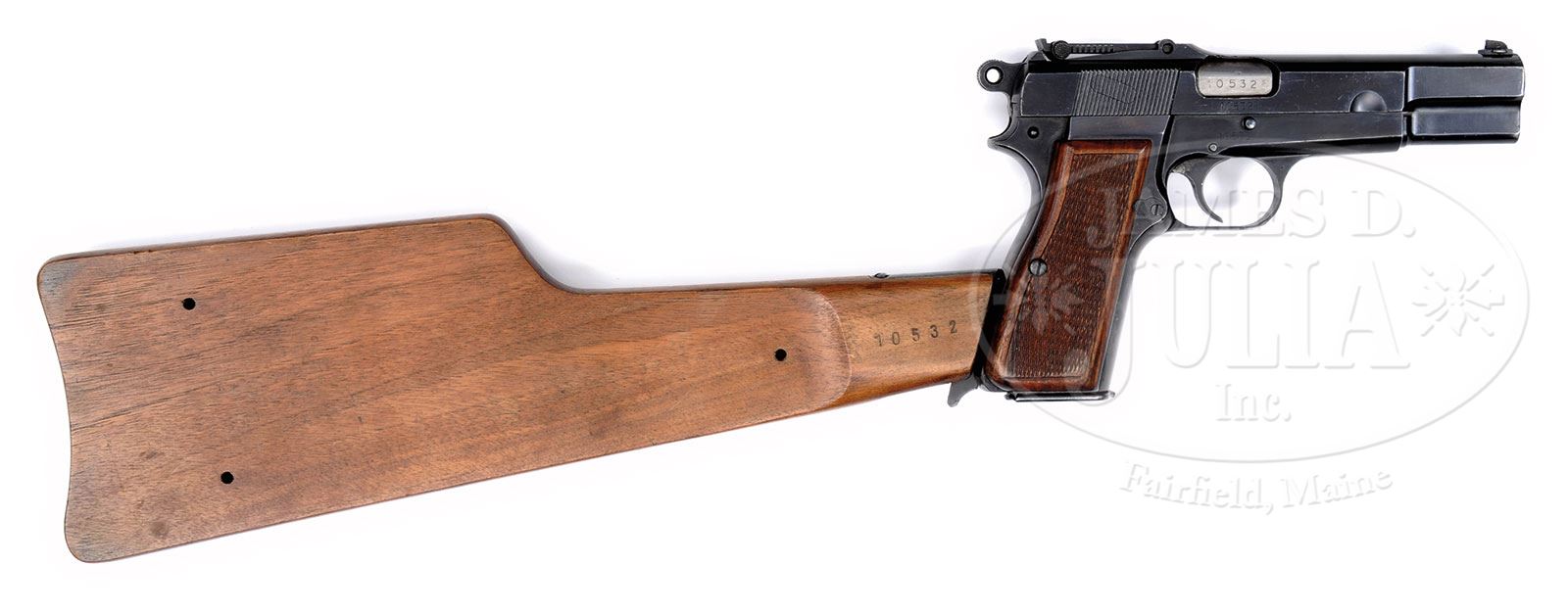 *◊ EARLY PRE-WWII FN MODEL 1935 PISTOL, BELGIAN ARMY, MATCHING STOCK, HOLSTER RIG.SN 10532. Cal. 9mm. Belgian Army GP35, blue finish with 4-3/4″ bbl, dovetailed barleycorn front sight with serrated rear face. Rear sight is early tangent style, with half sight bar markings, graduated to 500 meters. Backstrap is slotted for shoulder stock and it is mounted with 2-pc checkered walnut stocks. Left grip has five small pinholes, apparently where a medallion or plaque may have been attached. Right side of bbl, slide & frame have matching SNs. Bbl is a Nazi era replacement stamped with matching number and has crown “N” and double eagle/WaA 140 military proofs (inner surface). Unmarked late war/early post-war magazine with split tail base. Accompanied by an extremely rare pre-war, orig wood board stock matching numbered to this pistol. Also accompanied by a Belgian Army brown leather flap holster which is compartmented for the stock & pistol with strap & D-ring lock on the front and two brass D-rings and belt loops on the back for attaching to both shoulder straps & belt. Front flap is marked “AG 39”. Also accompanying is an orig Belgian Army hard shell 2 magazine pouch with strap & brass stud closure and belt loop on the back. Altogether an extremely fine & rare set unlikely to ever be encountered again. Most of these very early High Power pistols saw hard service during the war and are rarely ever found with high orig finish. PROVENANCE: Ex Henk Visser Collection. Collection of Dr. Geoffrey Sturgess. CONDITION: Pistol is very fine, all matching as noted above. Overall retains about 95% orig bright blue with muzzle end and very light sharp edge wear. Front strap has one small spot of wear, otherwise front & back straps retain most of their orig finish. Mechanics are crisp; bright shiny bore. Stock is fine with a few small nicks & bruises and retains most of its orig finish. Holster is sound with a few light scrapes on the flap & front edge. Overall shows light wear and retains most of its orig brown finish. Magazine pouch is equal condition. 4-52088 (5,500-9,500) – Lot 2262