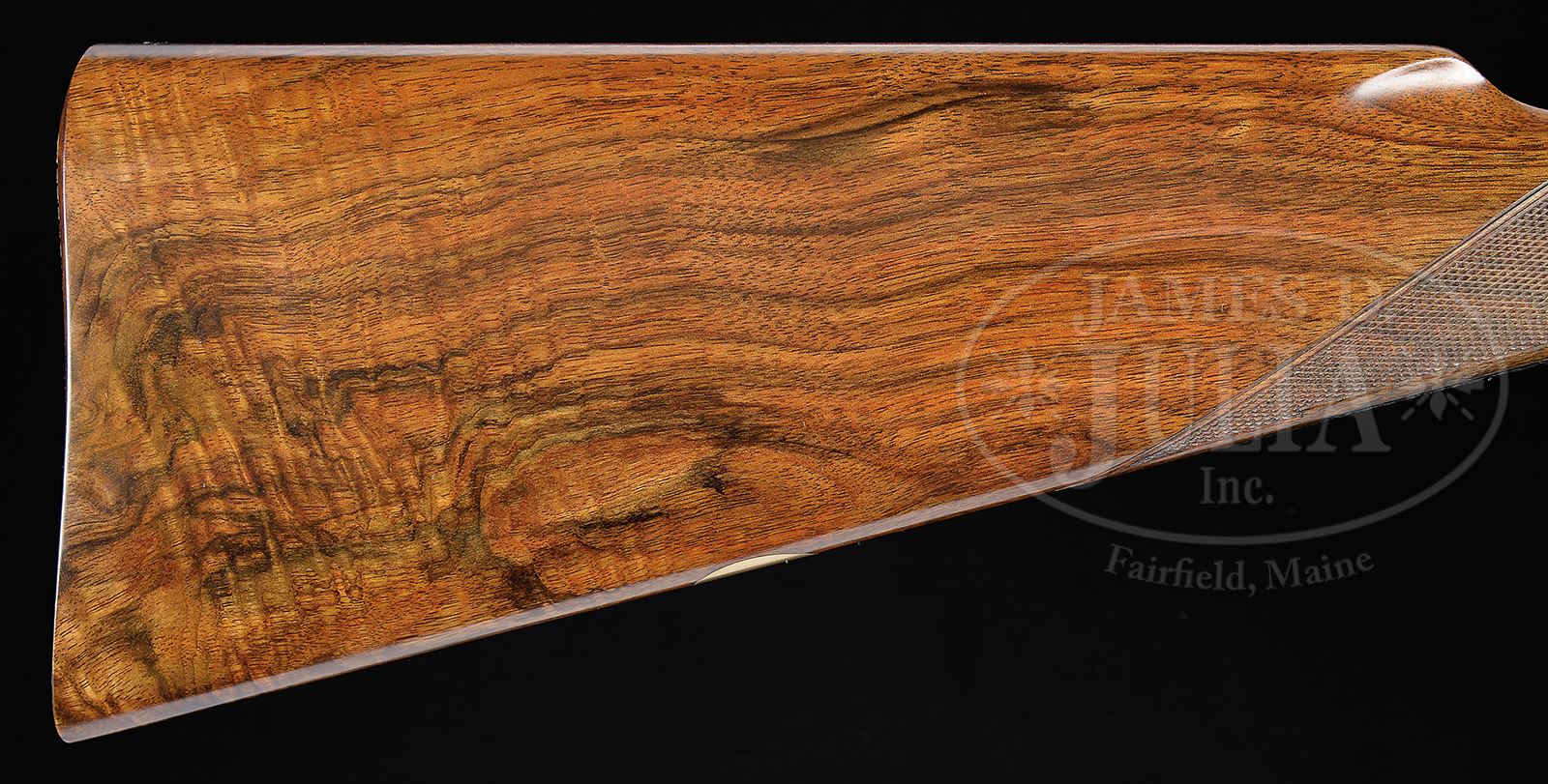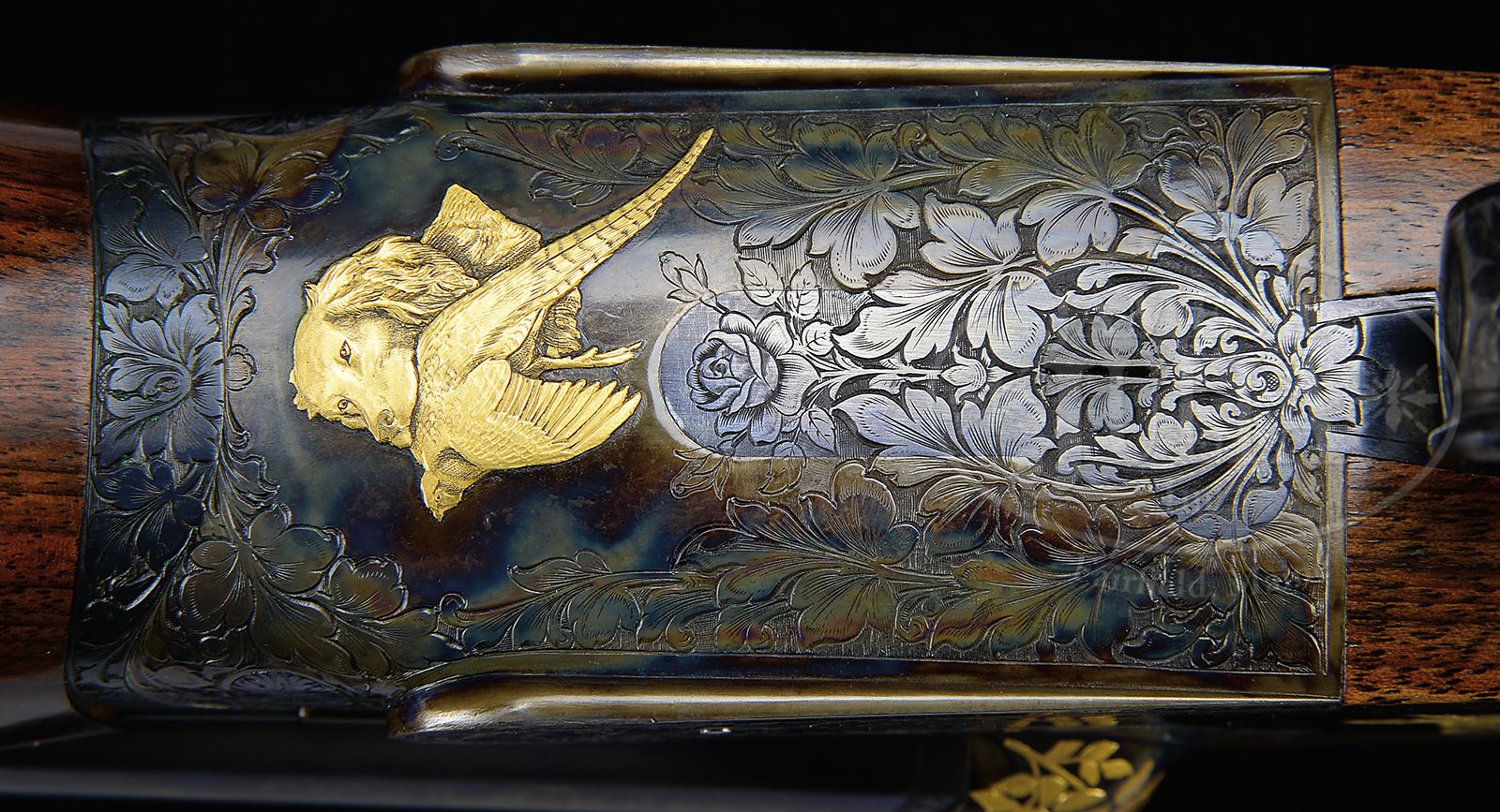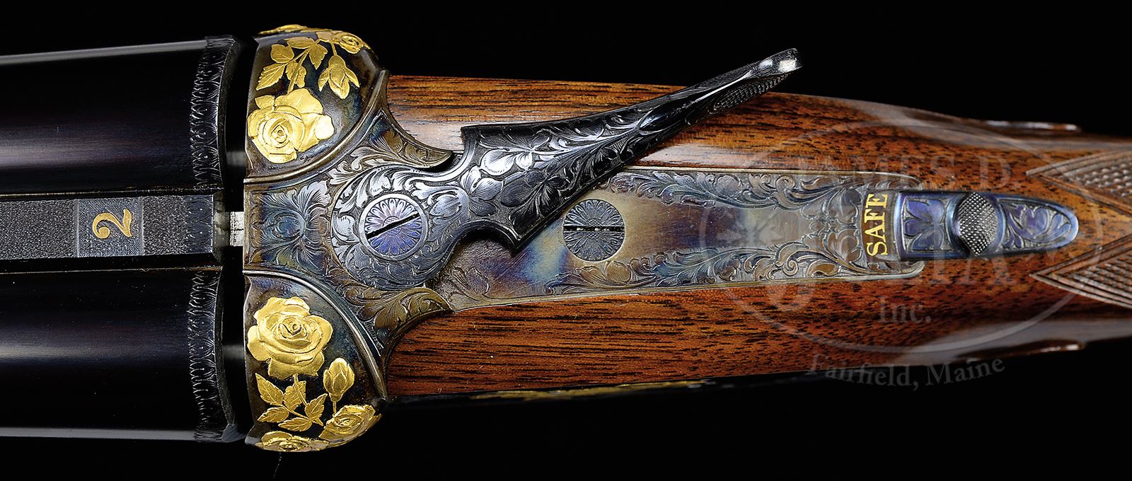 SN 28489. (1981) Cal. 12 ga. 2-3/4″ Chambers. Both sets of 28″ chopper lump bbls are fitted with slightly raised, matted ribs. “1” and “2” are gold inlaid at rear portions of ribs. Tops of bbls are engraved with Purdey’s Audley House London address. Bbl flats are stamped with 1981 London nitro proofs for 2-3/4″ chambers. Choke percentages are engraved on bottoms of rear lumps; with bbl set no. “1” marked “R 70%”, “L 75%”. Bbl set no. “2” is marked “R 40%” “L 55%”. Bottoms of bbls are stamped with SNs and bbl makers initials “AH” (Alf Harvey). Importers name and address are marked on bottom ribs, where covered by forends (Ron Coleman). Bottoms of ribs are also gold inlaid “12 – GA 2-3/4 MAG”. Case hardened Beesley patent self-opening sidelock action features automatic safety (SAFE inlaid in gold), hidden third fastener, side clips, bushed strikers, raised rib tumbler end cocking indicators, and Purdey non-selective sgl trigger. Action and lockplates are tastefully engraved with 40 – 50% coverage well cut, large, shaded acanthus, as counterpoint to exceptional relief gold inlaid, finely detailed, renditions of ducks modeled on Texas waterfowl stamps from 1981 and 1982, with pair pintails behind stalks of wild rice (?) on left (modeled after the 1982 stamp), and swimming mallards behind cattails on right (1981). Fences are exquisitely relief gold inlaid with rose blossoms and foliage. “J. Purdey & Sons” and “London” are gold inlaid on each side of action. Bottom of action portrays finely limned portrait of spaniel retrieving ring necked pheasant. This fine work is by famed engraver, Ken Hunt, whose signature appears at the bottom of both duck scenes. Small bow single beaded trigger guard is blued and engraved en suite with action and has SN at grip. Lightly streaked and nicely stump figured European walnut straight grip buttstock measures 14-1/2″ over checkered wood butt, and features classic drop points and checkering. A vacant gold oval is on toe line. Gun is provided with two interchangeable forends, one classic splinter, the other a large beavertail, both with Anson releases, and with irons marked with actioners initials “PD” (Peter Delay, third generation Purdey actioner). BBL set “1”: Bore diameter: left -.728, right -.728. Bore restrictions: left -.037 (full), right -.021 (mod). Wall thickness: left -.033, right -.033. Drop at heel: 2″, drop at comb: 1-3/8″. Weight with splinter forend: 7 lbs 1 oz. LOP: 14-1/2″. BBL set “2”: Bore diameter: left -.728, right -.729. Bore restrictions: left -.015 (mod), right -.009 (IC). Wall thickness: left -.032, right -.031. Drop at heel: 1-15/16″, drop at comb: 1-3/8″. Weight with beavertail forend: 7 lbs 5 oz. LOP: 14-1/2″. High quality oak and leather case with brass corners and central brown brass medallion, is lined in royal blue cloth, and has gold embossed black leather Purdey label in lid, along with 1981 and 1982 Texas waterfowl stamps, under plexiglass, each depicting duck scenes found on this gun. Case contains 2-pc black nylon and brass cleaning rod with mop and brush, along with a broken cartridge extractor and striker bottle under covered compartment. Also included are a pair of Purdey marked snap caps, and a squarish oil bottle engraved with crossed guns over “Purdey”. CONDITION: Excellent, near new, showing limited field use, with only a hint of high edge wear on all metal finishes, and some light marks on buttstock and splinter forend. Beavertail forend has some scuffs and rubs on right side, with two small fingernail sized dents in checkering. Hinge pin shows nearly all of its fire blue, and ribs of cocking indicators are silvered. Bores are excellent with no visible imperfections. Mechanically crisp, with nicely timed ejectors, and smooth working trigger. Case leather is excellent with a number of light scuffs and marks. Interior cloth shows slight compressions and light soiling from contact with gun and bbls. Accessories are excellent. A truly lovely and versatile work of art. 49417-25 MGM348 (37,500-57,500) – Lot 2262