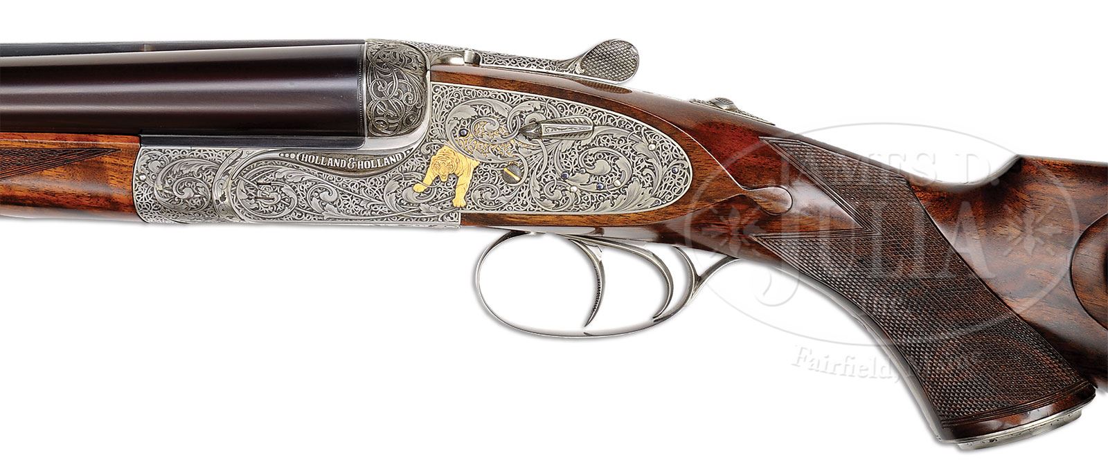 *EXCEPTIONALLY FINE, EXQUISITELY ENGRAVED, HOLLAND AND HOLLAND ROYAL DELUXE DOUBLE RIFLE WITH CASE.SN 35655. (1995) Cal. .500/ .465 H & H Magnum. This world class dangerous game rifle has 24″ chopper lump bbls fitted with quarter rib and front sight bases filed in classic H & H manner. Rib is mounted with one standing, one folding express sight, with standing leaf marked for 50 and 100 yards. Gold bead front sight is longitudinally dovetailed into base and has flip-over bone night bead. Tops of bbls are engraved “Holland & Holland” and “Bruton Street. London”. Bbl flats are stamped with caliber and 1995 London nitro proofs. SNs are on bottoms of bbls. Classic Royal hammerless action features automatic safety (SAFE inlaid in gold), hidden third fastener, bushed strikers, side bolsters, and long top tang which extends over comb. Typical back action locks have hand detachable takedown pin and gold band tumbler end cocking indicators. Double triggers have articulated front trigger blade which is checkered. Action and lockplates are engraved with an exceptional mix of various types of scroll surrounding motifs of Indian game and hunting. The major component of this scroll consists of large flowing open acanthus on lockplates flowing onto front of action. Its background is of beautifully cut open shaded small arabesque scroll. Larger arabesque scroll is in full relief on fences. Incuse fine attenuated scroll with acanthus highlights is on action beads and top tang. This fine panoply of scroll is background to relief gold inlaid Bengal tigers on lockplates. Head and fore limbs of snarling tigers are in front of scroll, with body and tail ghosting through scroll in background, all to very fine effect. “HOLLAND & HOLLAND” is engraved in high relief on bolsters. Bottom of action depicts high relief realistic hunting scene of elephant with alert hunters in howdah. Elephant is walking along finely detailed wooded path. There are gold inlaid floral highlights to scroll on top of action and on single beaded trigger guard bow. SN is gold inlaid on tang, which extends to steel trap grip cap with scroll and floral gold inlay matching action. Quality and presentation of this engraving is beyond reproach, as executed by Eric Gold and as featured in “The Best of Holland & Holland.” His initials “EG” can be found on the bottom metal under the elephant’s feet and to the right hidden in the shrubs. Beautifully marbled and nicely figured European walnut capped pistol grip buttstock features classic H & H style checkering, drop points, and right hand cheekpiece. It measures 14-3/4” over Silver type pad. A gold oval on toe line is engraved “F J R”. Matching sling loops are on stock and bbl. Matching splinter ejector forend has Anson release. Drop at heel: approx 3″, drop at comb: approx 1-7/8″. Weight: 10 lbs. 8 oz. LOP: 14-3/4″. Makers oak and leather case with canvas outer cover features brass corners and central brass medallion engraved “F J R”. Canvas outer cover has central leather patch likewise embossed. Interior is lined in dark green cloth, and has gold embossed black leather Holland & Holland label in lid. Case is semi-French fitted for rifle and accessories, which include a pair of ebony turnscrews, brass and vulcanite cleaning rod, and oil bottle, all marked “Holland & Holland”. Cleaning brush and mop are in black morocco leather wallet, and a pair of snap caps are marked “RWS”. Another compartment contains leather trimmed web carrying sling, and a bench cloth. PROVENANCE: Copy of factory build specs, and copy of target from H&H shooting ground indicating that gun was built for stock. CONDITION: Exceptionally fine, near new, with only one or two of the lightest of handling marks on bbls and stocks. Bores are excellent. Mechanically crisp. Case leather is excellent, near new, as protected by its outer cover, which has some slight discoloration and scuffs. Interior is excellent, with only a few light rubs on cloth and leather action guard. 4-50464 MGM68 (150,000-225,000) – Lot 2263 | Click here to view provenance