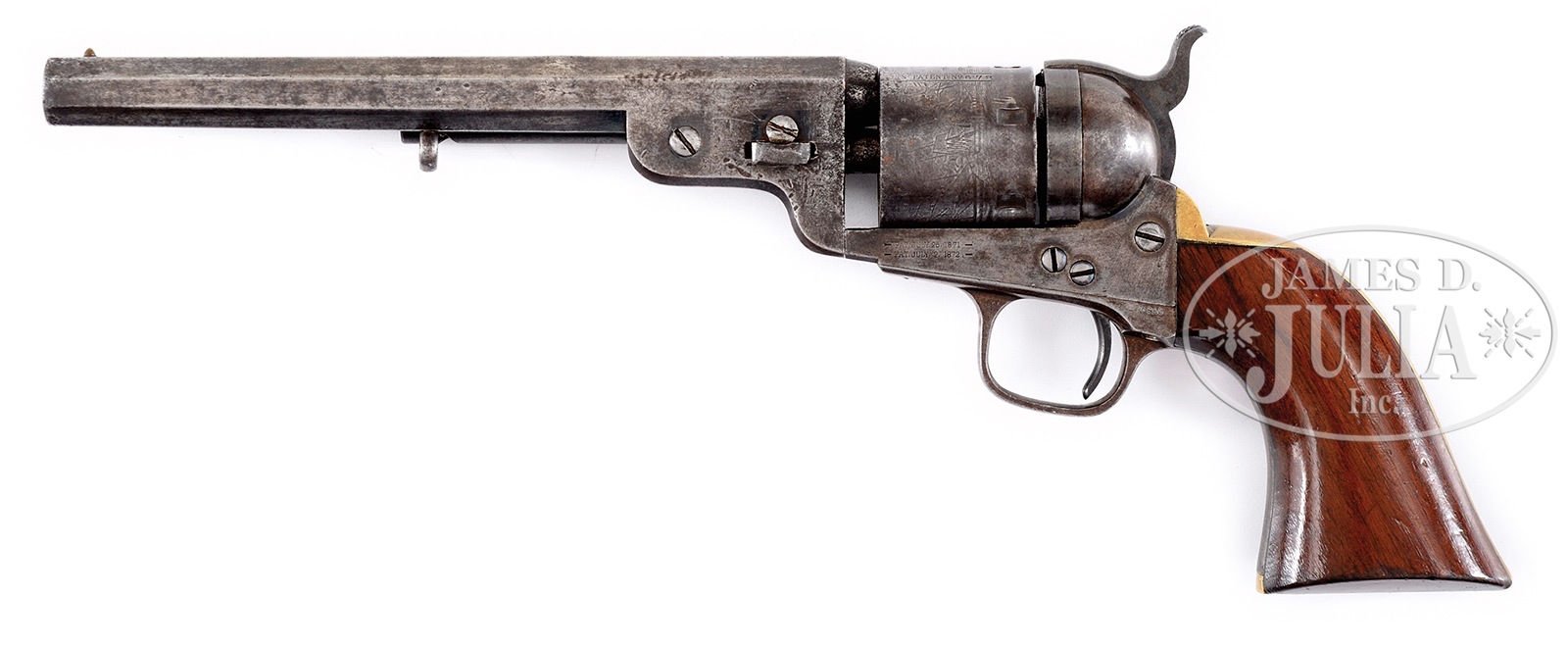 COLT MODEL 1851 NAVY CONVERSION REVOLVER.SN 2678. Cal. 38. This fine original, complete and authentic example of one of 3800 mid 1870 produced cartridge conversions which utilize existing model 1851 parts. This particular example is made in original rimfire, has great aesthetics with crisp markings. PROVENANCE: The Estate of G. W. “Bill” Stewart of Sonora, Texas. CONDITION: Gun overall is gray/plum with traces of original finish found in protected areas. Scattered areas of pitting especially at muzzle, back of bbl lug and face of cylinder. Cylinder scene is about 80% visible. Grips are well fit, retaining most of their bright factory varnish with edge wear. Mechanically gun functions well with crisp discernible bore. 49973-167 JS (2,000-4,000) – Lot 2264