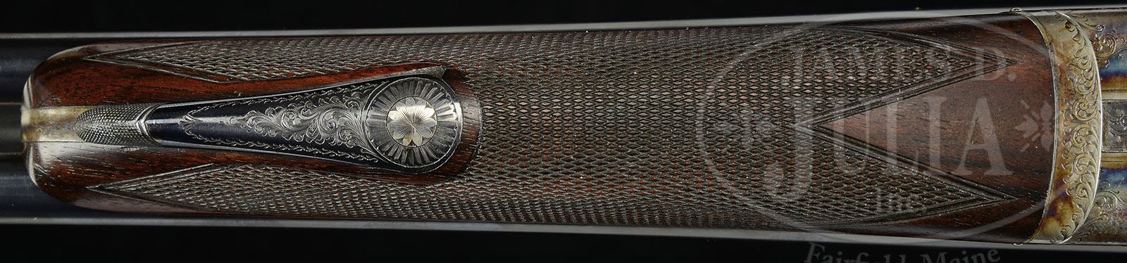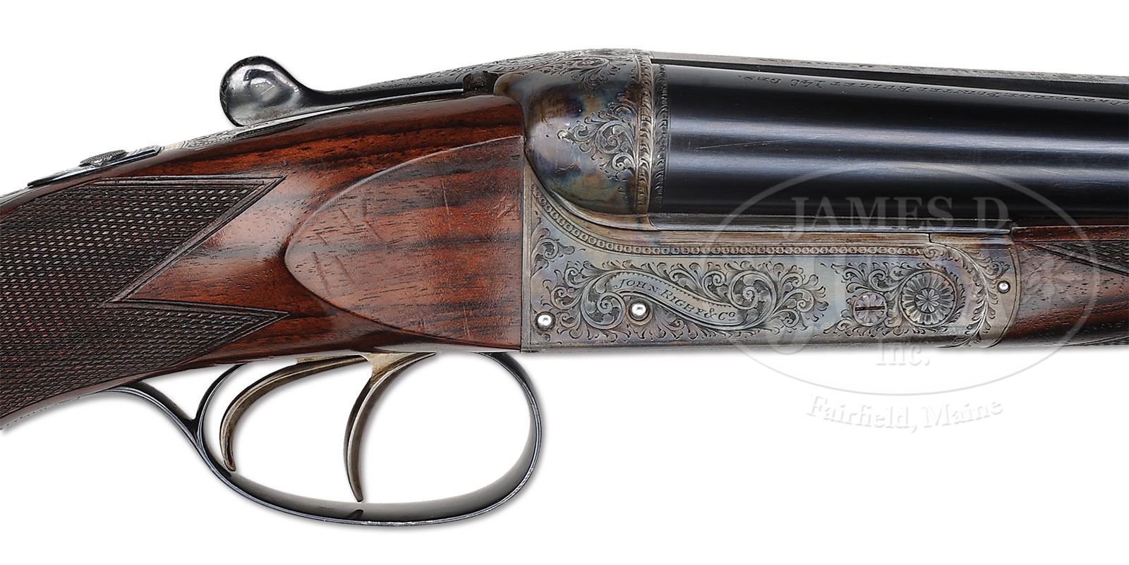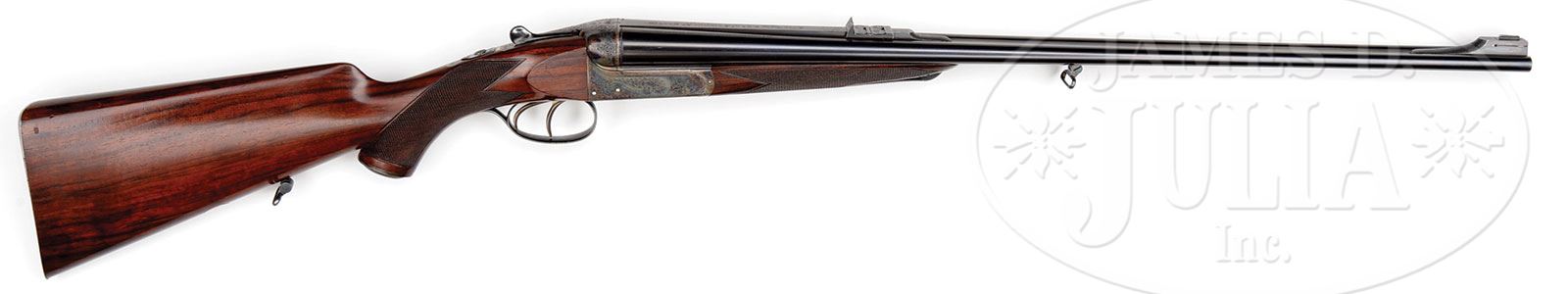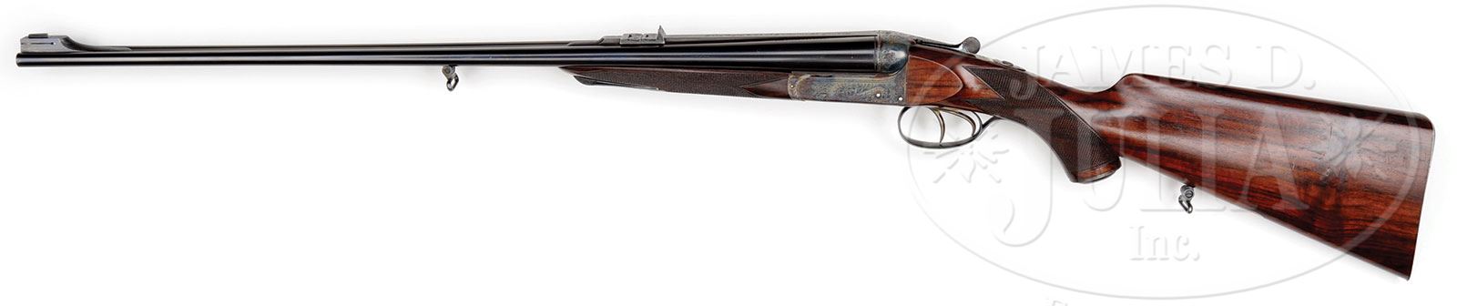 James D. Julia Auctioneers complies with all federal laws and regulations (Please review our Ivory Position Statement): The African ivory mounts on this item were in the country long before the January 8th, 1990’s CITE appendix. As per the President’s Executive Order of February 2014, this gun accompanied by an appropriate ESA is legal to sell and buy. However, no ivory will accompany this gun when you purchase it unless you hire John Sexton to prepare an ESA statement. If you hire John Sexton to prepare an ESA statement, the cost is $1,500.00. John Sexton is an independent consultant with appropriate qualifications to prepare ESA statements. John Sexton’s address is 1962 Portage Landing North, North Palm Beach, Florida 33408. It is the buyer’s responsibility to make payment to John Sexton for ESA statements. Documents are prepared by John Sexton and not James D. Julia Auctioneers. Once statements are prepared, a copy will be presented to Julia’s and they will then present you with the ivory mounts for this gun. Another copy should be kept with your gun. THIS GUN WILL BE SOLD WITHOUT ITS IVORY. IF THE BUYER WISHES TO HAVE THE IVORY, THEY MUST HIRE JOHN SEXTON TO PREPARE AN ESA “ANTIQUE CERTIFICATION” (COST $1,500). *HIGH ORIGINAL CONDITION RIGBY BEST BOXLOCK EJECTOR DOUBLE RIFLE WITH DIES AND BRASS.SN 18247. (ca 1938) Cal. .275 no. 2 Mag. This very well preserved double rifle has 26″ chopper lump bbls mounted with file cut quarter rib and matching front ramp. Quarter rib is fitted with one standing, two folding leaf express rear sight marked for 100, 300, and 400 yards. An ivory bead front sight is longitudinally dovetailed into front ramp. Top of quarter rib is engraved in English script “John Rigby & Co 43 Sackville St. London.” Top of right bbl is engraved “No. 2 Magnum Cartridge Pointed Bullet 140 Grs.” Top of left bbl is engraved “For Rigby 275 Bore.” Bbl flats are stamped with London nitro proofs. Importers name and address are on bottom rib. A sling loop is soldered to bottom rib. Case hardened boxlock Webley “screw grip” action features automatic safety (SAFE inlaid in gold), square shouldered dolls head third fastener, and double triggers. Action is engraved with 60 – 70% coverage well cut open shaded scroll. “John Rigby & Co” is in scroll terminated riband on each side. Blued top lever, floorplate, and trigger guard are also scroll engraved. SN is on trigger guard tang, which extends to case hardened and engraved steel grip cap. Nicely streaked and lightly figured European walnut capped pistol grip buttstock measures 14-7/8″ over blued and checkered steel buttplate. Stock features point pattern checkering with mullered borders. A vacant silver oval, a sling loop matching that on forend, and the stamped number “159” are on toe line. Matching splinter ejector forend has forward pivoting lever release. Drop at heel: approx 2-7/8″. Drop at comb: approx 1-1/2″. Weight: 9 lbs 4 oz. LOP: 14-7/8″. Included with rifle are approx 50 custom loaded cartridges, C & H dies, and 40 new brass cases by Bertram. PROVENANCE: Copy of Rigby’s ledger page. Two targets shot with rifle by Ken Owen in developing loads (< 1" group @65 yds) for 175 gr bullet. Info on .275 no. 2 cartridge. Copy of 1939 Stoeger catalog advertising Rigby rifles, showing this rifle with price in USA of $850.00. CONDITION: Exceptionally fine. Bbls retain approx 95 - 98% orig blue with slight silvering on sharp edges and some minor handling marks. Action retains 95 - 98% orig case hardening color, silvered slightly on top tang and at bottom, from normal hand wear. Thumbpiece is slightly silvered. Floorplate and trigger guard retain nearly all of their orig blue. Buttplate retains nearly all of its orig blue with some light marks and thinning at heel. Stocks retain nearly all their orig fine rubbed oil finish with some light handling marks. Checkering has only the slightest wear. Bores are excellent, bright, sharp and shiny throughout. Action is tight. Bbls are on face. Ejectors are strong and in time. Cartridges, dies and brass are excellent. A lovely, well balanced, classic British rifle. 4-51335 MGM88 (27,500-37,500) – Lot 2265 Click here to view provenance