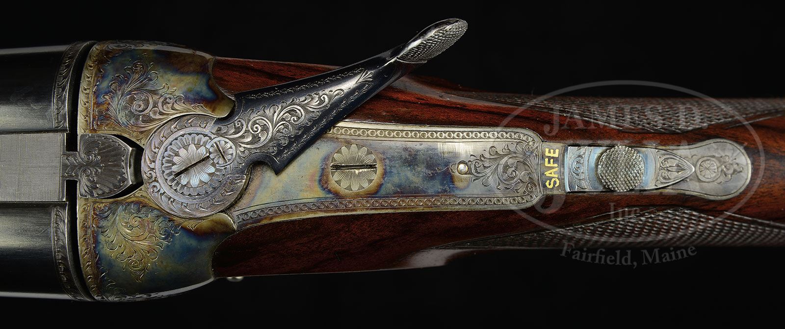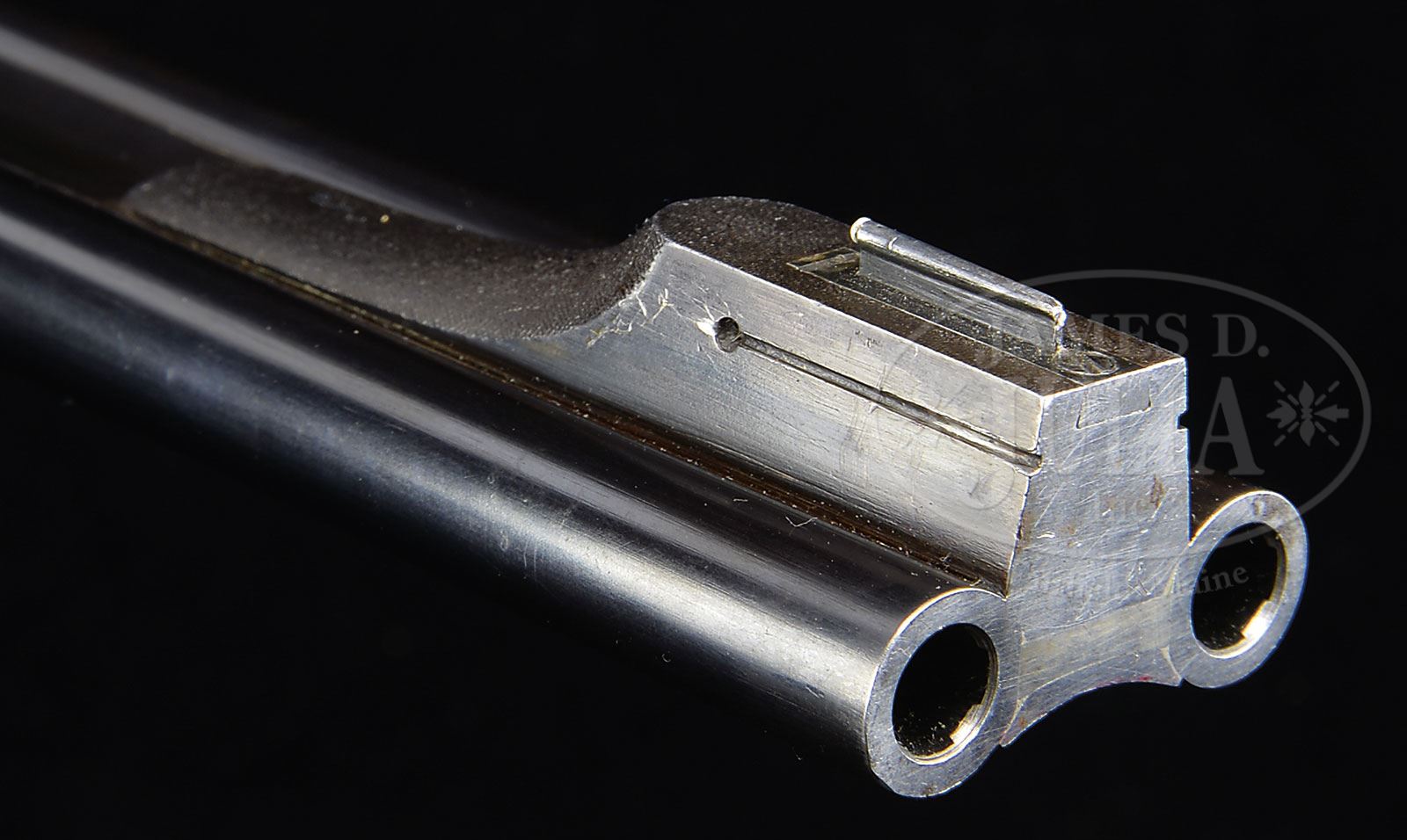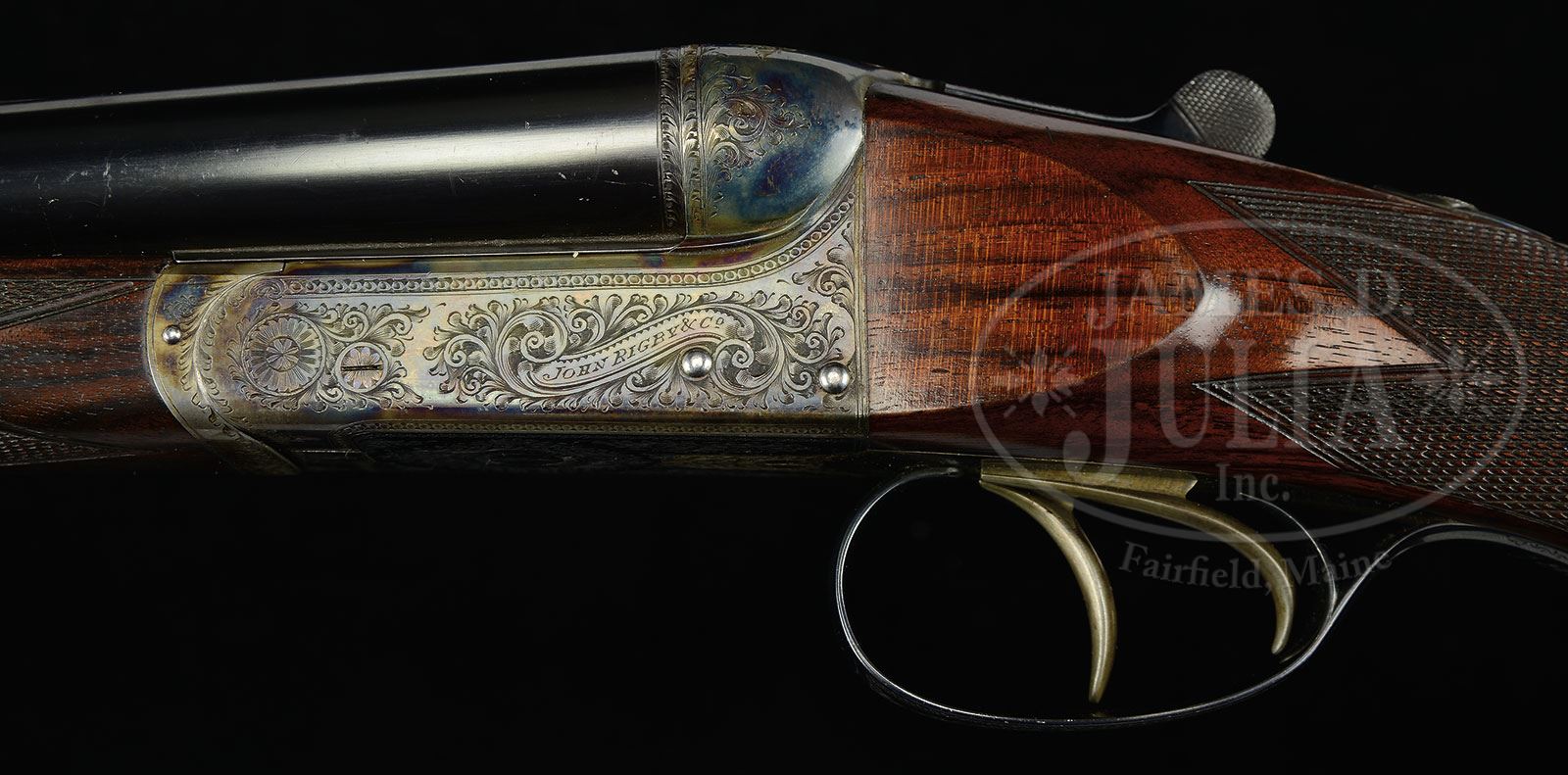 James D. Julia Auctioneers complies with all federal laws and regulations (Please review our Ivory Position Statement): The African ivory mounts on this item were in the country long before the January 8th, 1990’s CITE appendix. As per the President’s Executive Order of February 2014, this gun accompanied by an appropriate ESA is legal to sell and buy. However, no ivory will accompany this gun when you purchase it unless you hire John Sexton to prepare an ESA statement. If you hire John Sexton to prepare an ESA statement, the cost is $1,500.00. John Sexton is an independent consultant with appropriate qualifications to prepare ESA statements. John Sexton’s address is 1962 Portage Landing North, North Palm Beach, Florida 33408. It is the buyer’s responsibility to make payment to John Sexton for ESA statements. Documents are prepared by John Sexton and not James D. Julia Auctioneers. Once statements are prepared, a copy will be presented to Julia’s and they will then present you with the ivory mounts for this gun. Another copy should be kept with your gun. THIS GUN WILL BE SOLD WITHOUT ITS IVORY. IF THE BUYER WISHES TO HAVE THE IVORY, THEY MUST HIRE JOHN SEXTON TO PREPARE AN ESA “ANTIQUE CERTIFICATION” (COST $1,500). *HIGH ORIGINAL CONDITION RIGBY BEST BOXLOCK EJECTOR DOUBLE RIFLE WITH DIES AND BRASS.SN 18247. (ca 1938) Cal. .275 no. 2 Mag. This very well preserved double rifle has 26″ chopper lump bbls mounted with file cut quarter rib and matching front ramp. Quarter rib is fitted with one standing, two folding leaf express rear sight marked for 100, 300, and 400 yards. An ivory bead front sight is longitudinally dovetailed into front ramp. Top of quarter rib is engraved in English script “John Rigby & Co 43 Sackville St. London.” Top of right bbl is engraved “No. 2 Magnum Cartridge Pointed Bullet 140 Grs.” Top of left bbl is engraved “For Rigby 275 Bore.” Bbl flats are stamped with London nitro proofs. Importers name and address are on bottom rib. A sling loop is soldered to bottom rib. Case hardened boxlock Webley “screw grip” action features automatic safety (SAFE inlaid in gold), square shouldered dolls head third fastener, and double triggers. Action is engraved with 60 – 70% coverage well cut open shaded scroll. “John Rigby & Co” is in scroll terminated riband on each side. Blued top lever, floorplate, and trigger guard are also scroll engraved. SN is on trigger guard tang, which extends to case hardened and engraved steel grip cap. Nicely streaked and lightly figured European walnut capped pistol grip buttstock measures 14-7/8″ over blued and checkered steel buttplate. Stock features point pattern checkering with mullered borders. A vacant silver oval, a sling loop matching that on forend, and the stamped number “159” are on toe line. Matching splinter ejector forend has forward pivoting lever release. Drop at heel: approx 2-7/8″. Drop at comb: approx 1-1/2″. Weight: 9 lbs 4 oz. LOP: 14-7/8″. Included with rifle are approx 50 custom loaded cartridges, C & H dies, and 40 new brass cases by Bertram. PROVENANCE: Copy of Rigby’s ledger page. Two targets shot with rifle by Ken Owen in developing loads (< 1" group @65 yds) for 175 gr bullet. Info on .275 no. 2 cartridge. Copy of 1939 Stoeger catalog advertising Rigby rifles, showing this rifle with price in USA of $850.00. CONDITION: Exceptionally fine. Bbls retain approx 95 - 98% orig blue with slight silvering on sharp edges and some minor handling marks. Action retains 95 - 98% orig case hardening color, silvered slightly on top tang and at bottom, from normal hand wear. Thumbpiece is slightly silvered. Floorplate and trigger guard retain nearly all of their orig blue. Buttplate retains nearly all of its orig blue with some light marks and thinning at heel. Stocks retain nearly all their orig fine rubbed oil finish with some light handling marks. Checkering has only the slightest wear. Bores are excellent, bright, sharp and shiny throughout. Action is tight. Bbls are on face. Ejectors are strong and in time. Cartridges, dies and brass are excellent. A lovely, well balanced, classic British rifle. 4-51335 MGM88 (27,500-37,500) – Lot 2265 Click here to view provenance