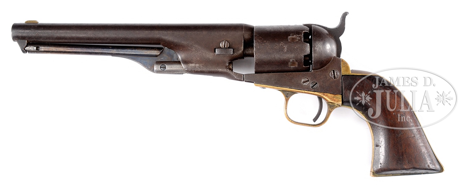 COLT 1861 NAVY MARTIALLY MARKED PERCUSSION REVOLVER.SN 20801. Cal. 36. 7-1/2″ rnd bbl, with NY address. 6 shot rnd cyl, brass grip straps, 1-pc walnut grip. Right side of grip is stamped “1903” above clearly visible military cartouche. Left side of grip at butt has “RAC” inspector mark followed by hand scratched initials “EYD”. Bbl, frame, grip straps, cyl and wedge have matching numbers. Loading lever is an unnumbered replacement. PROVENANCE: The Dr. Robert G. Cox Estate Collection. CONDITION: Poor. Metal has dark patina with weak but partially legible markings. Replacement loading lever retains 40% case colored finish. Sanded and undersized grips have dark appearance with heavy wear. Some grip frame and action screws are replacements. Cyl is not rotating when action is cycled. Dark pitted bore. 50582-69 DS (500-800) – Lot 2265 Click here to view provenance