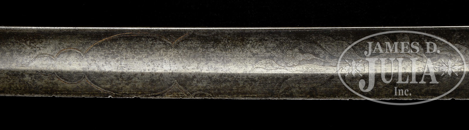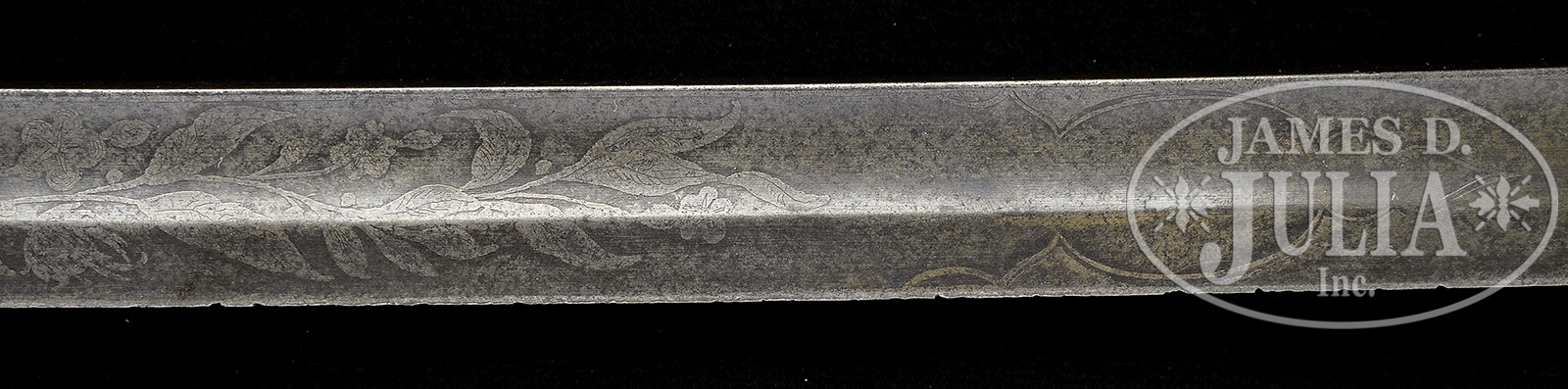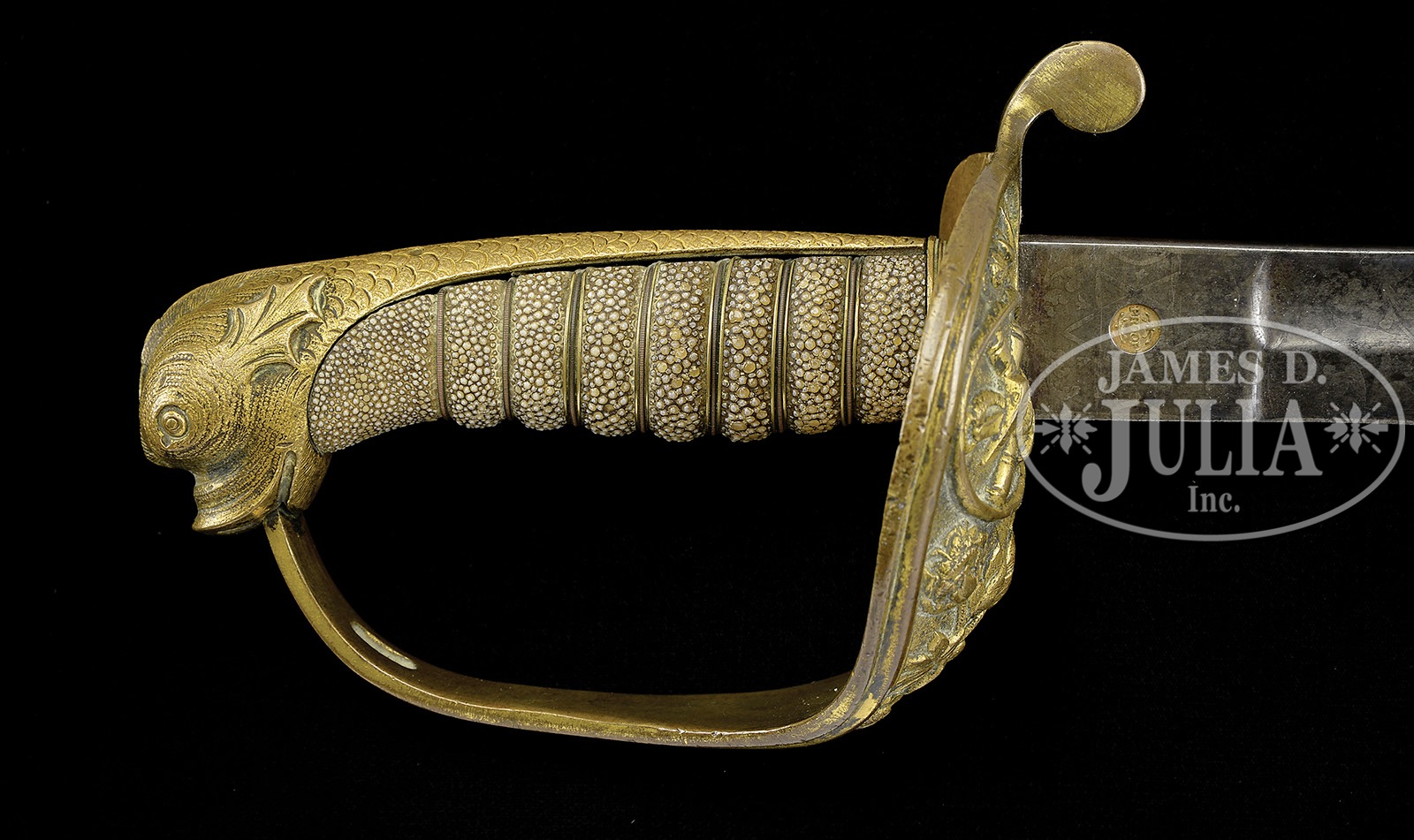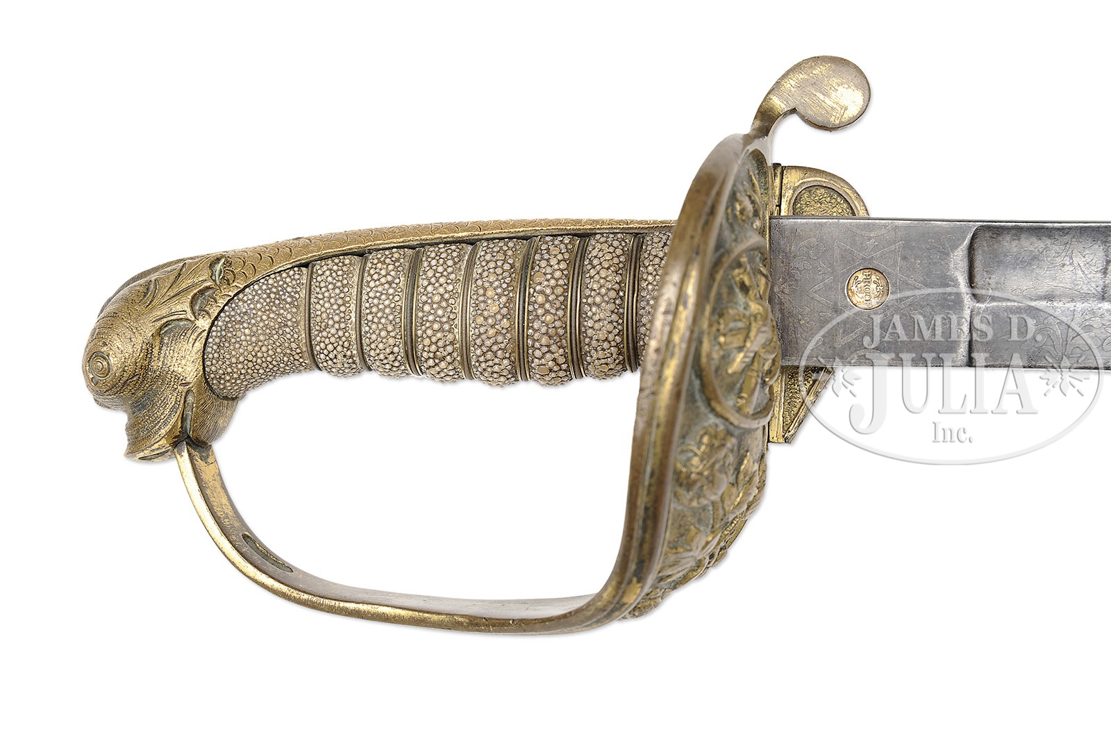RARE CONFEDERATE REGULATION NAVAL OFFICER’S SWORD.This regulation dolphin head officer’s sword was made by Mole in England and agent marked “COURTNEY & TENNENT CHARLESTON SC”. This sword exhibits a 30-1/2″ blade and is 35-1/2″ overall. Blade has etched panels on each side, measuring 16″ containing elements including cotton boles and patriotic motifs of crossed cannons over a fluted anchor and a Confederate first national flag over a fluted anchor. The guilted brass hilt has guard decorated in cotton plants with a central oval vignette about 1-3/4″ tall of the Confederate naval device a fluted anchor super-imposed over crossed cannon barrels. The shark skin handle is wrapped in triple wire wrap with a backstrap emulating a serpent’s body which terminates into a pommel characterized as a dolphin or a sea serpent. This rare pattern is unique to the Confederacy and specimens rarely come to market. CONDITION: Blade overall is grey/brown with discernible etching, scattered staining and pitting. Blade has numerous small nicks in cutting edge. Hilt backstrap and folding languette have mustard colored patina where 30-40% gold plate is missing. Folding languette is loose only partially held in place as hinge has come partially loose from hilt with an old 1/2″ blob of lead attached to one end. Sharkskin grip is sound, solid, well-fit with some wear to high spots. Wire is mostly intact though the single wire double wrap is missing from top 2 of 7 loops. 4-49541 JS56 (7,500-12,500) – Lot 2267