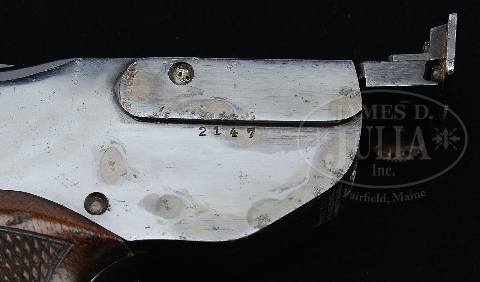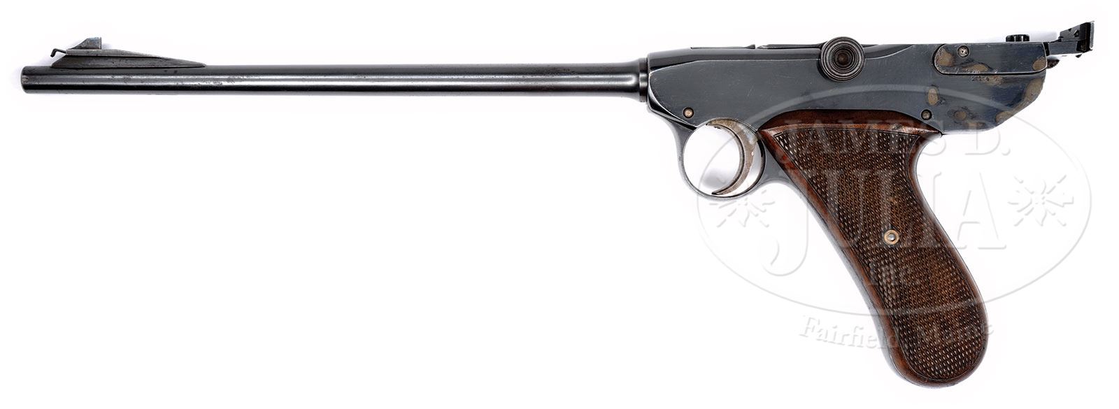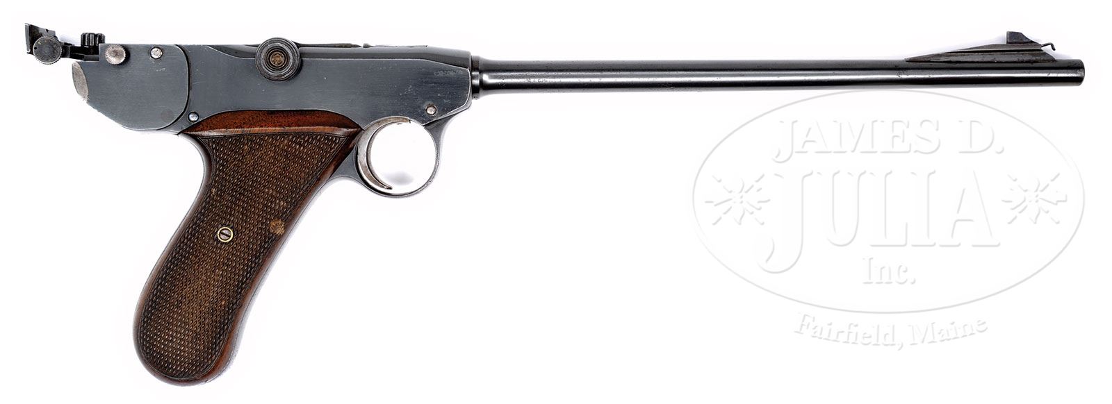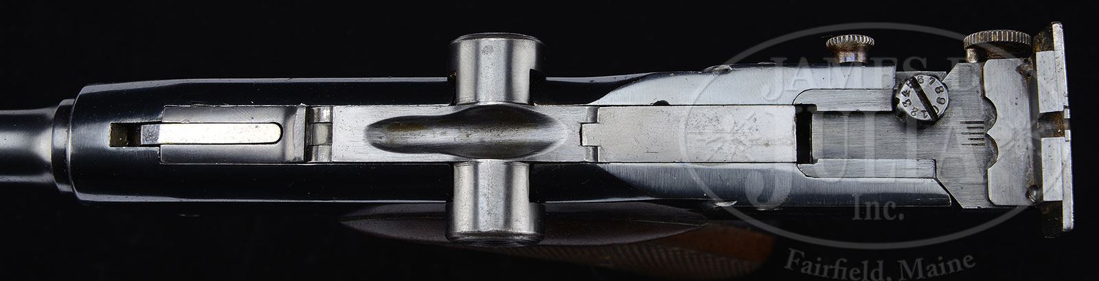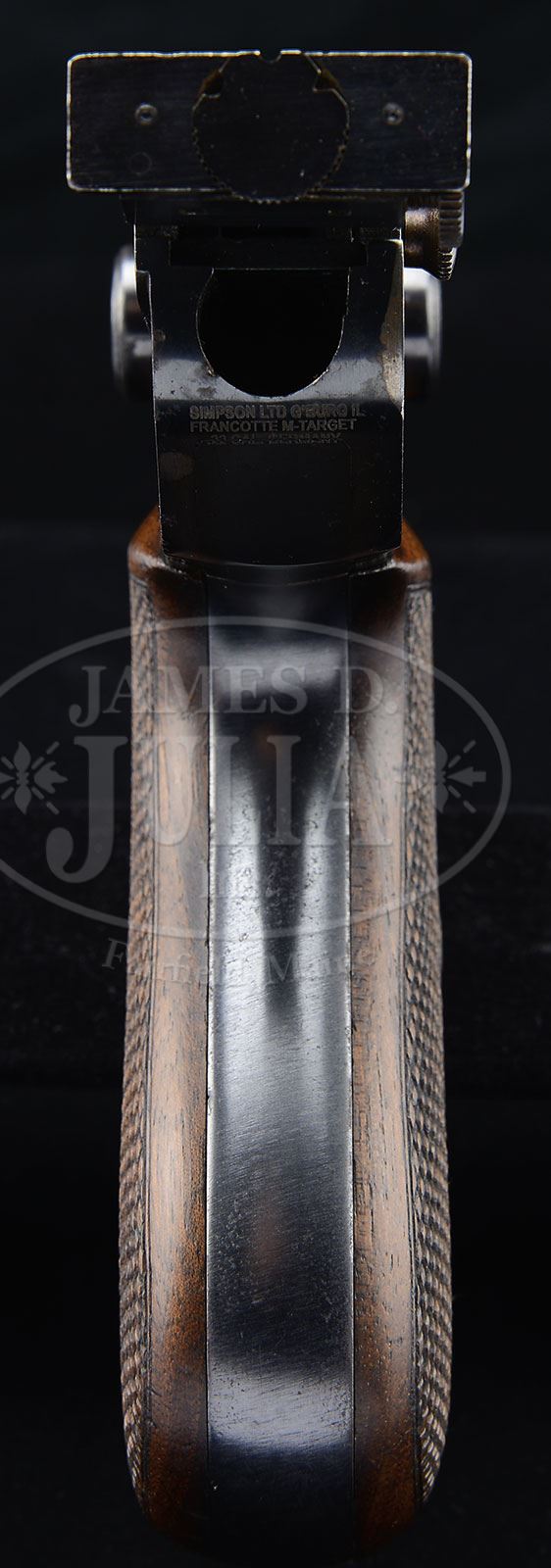 *◊ FRANCOTTE “BORCHARDT” PATTERN TARGET PISTOL, TOGGLE ACTION, SINGLE SHOT.SN 2147. Cal. .22 Long Rifle. Scarce single shot .22 Cal. target pistol, blued with a strawed trigger, made with a toggle action and finely adjustable sights, popularized in Germany and Switzerland and resembling the Borchardt pistol in general outline. This pistol has a 10″ bbl with a ramped detachable front sight and a micro-adjustable rear sight that has three separately sized “V” notches for shooter preference. Toggle with concentric knobs, remaining open after each shot. The right side of the receiver and bbl are Crown/B and Crown/U proofed with the bbl marked for Caliber “5.4mm”. The only other marking on this pistol is the SN “2147” that appears on the left side of the tang & is repeated under the bbl where inserting into the frame. Orig wood checkered grips retained with a single transverse screw. Although there are no manufacturer markings, the consignor noted the gun was made by Francotte. PROVENANCE: Collection of Dr. Geoffrey Sturgess. CONDITION: At least 95% bright orig blue with minor freckling on the bbl and spots of discoloration on each side of tang. Front & backstraps are bright with minimal wear. High condition grips with most orig varnish, sharp checkering, and only a few minute losses. Mirror bore. Perfect manual mechanics. An extremely attractive & unusual target pistol that should appeal to every Luger collector. 4-52104 (2,000-3,000) – Lot 2267