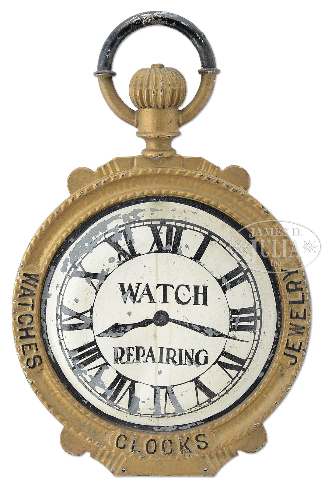 HEAVY CAST IRON & ZINC POCKET WATCH TRADE SIGN.Early two sided three dimensional figural trade sign in gold, black and cream embossed “Watches, Clocks, Jewelry” around the perimeter and “Watch repairing” on the clock face. SIZE: 27-1/4″ h x 17-3/4″ w. CONDITION: Good to very good with scattered paint chips and a dent to the clock face on one side. 49016-5 (1,000-2,000) – Lot 2267 Auction: Advertising, Toy & Doll - Spring 2015 Please Note: All prices include the hammer price plus the buyer’s premium, which is paid by the buyer as part of the purchase price. The prices noted here after the auction are considered unofficial and do not become official until after the 46th day. |