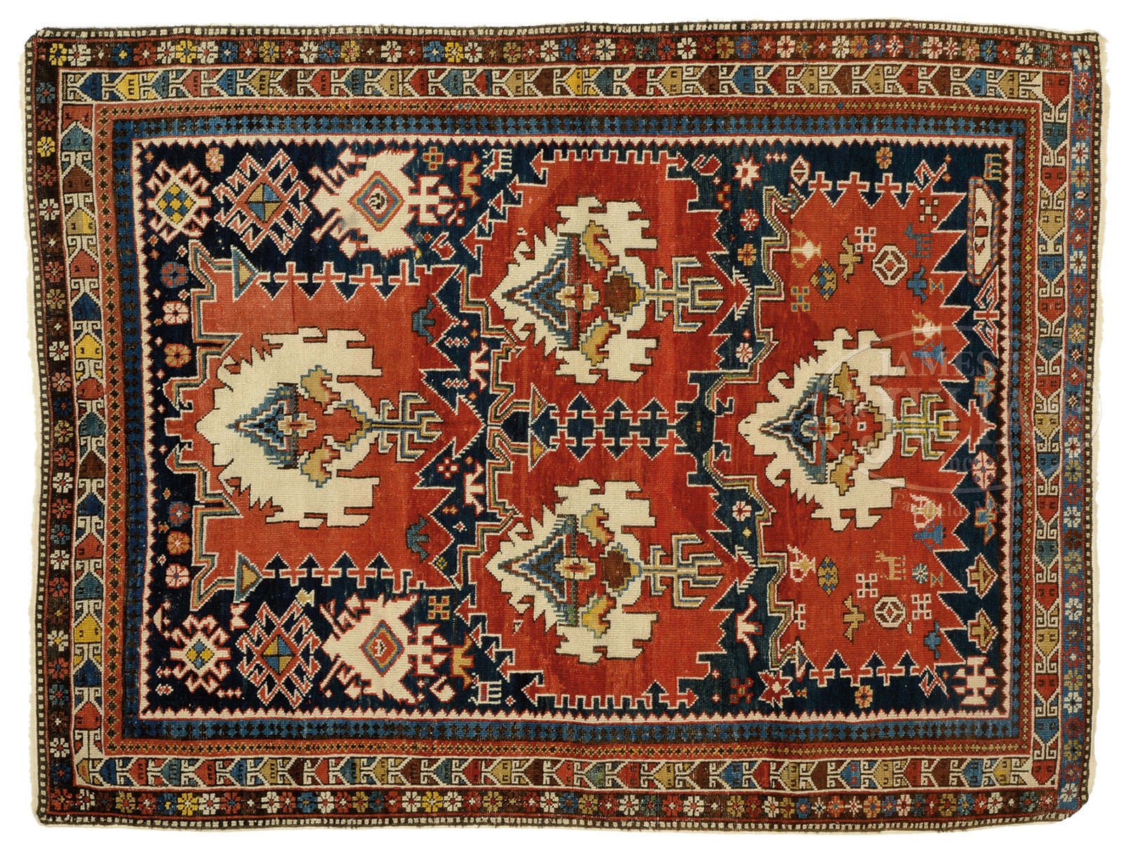 ANTIQUE SHIRVAN RUG, SOUTH CAUCASUS.Late 19th century. This fine example of asymmetrical design with four rose red irregular medallions each with polychrome phoenix design on an ivory ground. The whole on a dark indigo field interspersed with tarantula, crab, animal, and snowflake design within multiple polychrome floral and geometric borders. SIZE: 4′ 1″ x 5′ 3-1/2″. CONDITION: Exhibits strong palette with even wear throughout commensurate with age. No repairs, damage or restoration noted. 51911-32 (2,000-3,000) – Lot 2269