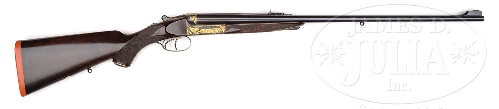 *MANTON & CO. BOXLOCK EJECTOR DOUBLE RIFLE WITH CASE.SN 13802. Cal. .360 no. 2. 26″ Chopper lump bbls with file cut quarter rib, fitted with one standing, two folding leaf express rear sight and matching ramp front base with small bead and fold-up night bead, are engraved “Manton & Co. Gun Makers. Calcutta & Delhi. By Appointment to H. E. The Viceroy.” and “.360 No 2 3″ 55 Grains Smokeless, 320 Grain S. N. S. P. Bullet”. Bbl flats are stamped with London nitro proofs, bottom of splinter with “Made in England”. A large sling eye is soldered to bottom rib. Boxlock PHV-1 case hardened action features automatic safety, clover leaf dolls head and pivoting third fastener, bushed strikers, and double triggers. Action is engraved “Manton & Co” on each side, and is fine cross hatch shaded overall. Where scroll engraving would normally be found, there is scrolled gold damascening at nearly 60% coverage. This treatment extends to top lever and trigger guard, which has SN on tang, which extends to steel grip cap. Nicely figured, dense European walnut capped pistol grip buttstock measures 14-3/8″ over Silver type pad, and features classic shadow line right hand cheekpiece, point pattern checkering with mullered borders at grip, a sling eye, as well as a vacant silver oval on toe line. Matching splinter ejector forend has forward pivoting release. Drop at heel: approx 2-3/4″, drop at comb: approx 1-13/16″. Weight: 9 lbs. 11 oz. LOP: 14-3/8″. Fine quality leather case with stitched leather corners is embossed “P. E. S” on top, is lined in green cloth, and has paper Manton & Co label in lid. Case contains 2-pc rosewood handled brass cleaning rod, nickel-plated snap caps and square oil bottle, and thong type rifle sling. CONDITION: Excellent, as completely refurbished. Bbls retain essentially all of a fine quality re-black, engraving slightly softened. All other metal parts retain essentially all of a well done re-color case hardening. Stocks retain nearly all of a glossy oil finish with a few minor nicks and scratches. Bores are excellent, shiny, with strong rifling throughout, and slight evidence of erosion at throat. Action is tight. Ejectors are in time. Action has been glass bedded. New case is excellent, with a few marks and scuffs in leather. Interior is slightly soiled. Reproduction label and accessories are excellent. An interesting rifle from the Raj in a caliber which is thought of as being the equal of the .375 H & H, and in some instances, more effective, given its 320 grain bullet. 4-50427 MGM174 (15,000-20,000) – Lot 2270