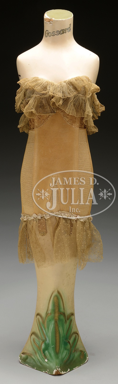 GOSSARD CORSET CLOTHING STORE DISPLAY.Molded masonite composition female form clad with one of this maker’s sample corsets. SIZE: 27″ t. CONDITION: Very good to excellent; some chipping to the top and base; corset has a few tears but overall very good. 37437-33 (400-800) – Lot 2270 Auction: Advertising, Toy & Doll - Spring 2015 Please Note: All prices include the hammer price plus the buyer’s premium, which is paid by the buyer as part of the purchase price. The prices noted here after the auction are considered unofficial and do not become official until after the 46th day. |