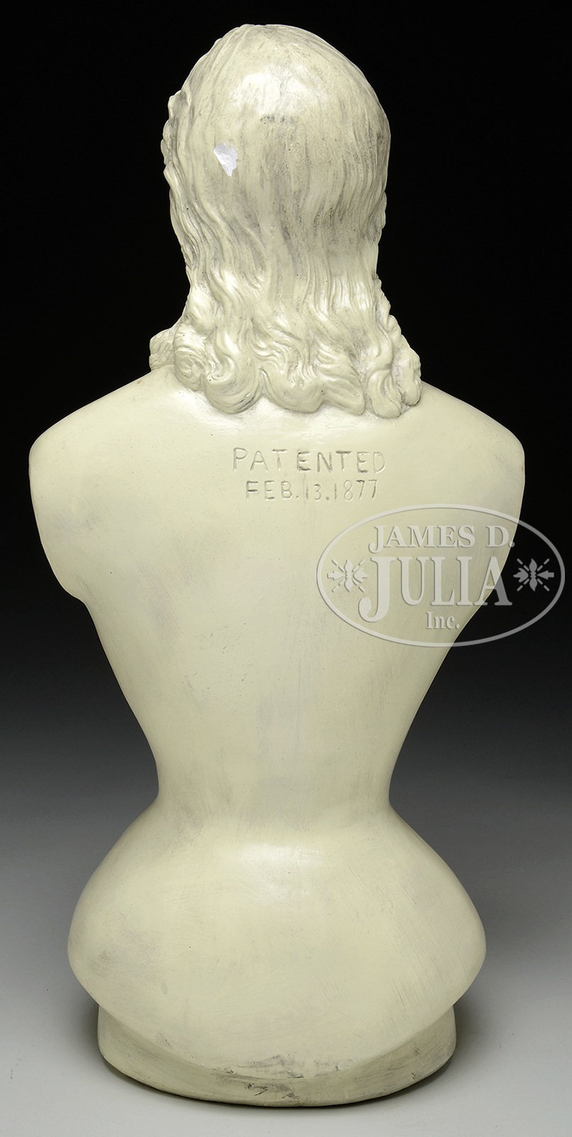 DOCTOR WARNER’S HEALTH CORSET CHALKWARE STORE DISPLAY.Figural female bust which may have originally been clad with a sample corset, is marked on the back “Patented Feb. 13, 1877”. SIZE: 19-1/2″ t. CONDITION: Very good to excellent 37437-34 (300-500) – Lot 2271 Auction: Advertising, Toy & Doll - Spring 2015 Please Note: All prices include the hammer price plus the buyer’s premium, which is paid by the buyer as part of the purchase price. The prices noted here after the auction are considered unofficial and do not become official until after the 46th day. |
