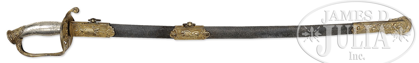 HORSTMANN SILVER GRIPPED CIVIL WAR PRESENTATION FOOT OFFICER’S SWORD.You are bidding on a beautiful high-grade Civil War officer’s sword sold by “W.H. Hortsmann & Sons, Philadelphia” and so marked on the ricasso. This beautiful sword has a shark skin scabbard with high relief embossed figural mounts, high relief casting on pommel and hilt and a deluxe sheet silver engraved grip with presentation which reads “Presented to Lieut. A.M. Clarke by his company as a token of confidence and respect.” A quick search of Civil War soldier database produces no A.M. Clarks but we do find an A.M. Clark who was from Philadelphia and was a lieutenant in the 67th Pennsylvania Infantry originally out of Philadelphia which makes him a likely recipient of this sword. The 67th Pennsylvania was originally part of the 8th Army Corp but joined the Army at Potomac in mid-1863 and took part in many of the actions in Virginia starting with Winchester, VA in June of 1863, ending at Appomattox in April of 1865. Aspah M. Clark was appointed lieutenant July 27, 1863 and was with the unit through end of war. More research should probably be done to ascertain history of Mr. Clark. Regardless, this is a scarce pattern of American Civil War foot officer’s sword with beautiful engraved silver grip and shark skin scabbard with relief mount, unique to Horstmann of Phildelphia. CONDITION: Sword is very good overall. 31-1/2″ blade is gray/white overall with 18″ etched patriotic panels on each side; protective cloth washer is still partially retained; brass hilt, pommel and scabbard mounts retain traces of original gilt which is very strong in protected areas of relief on hilt and figural panels on scabbard mounts. Drag and middle mount are missing their retaining screws otherwise sword is complete and orig. 4-50430 JS103 (3,750-5,750) – Lot 2272