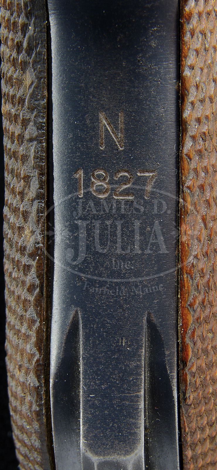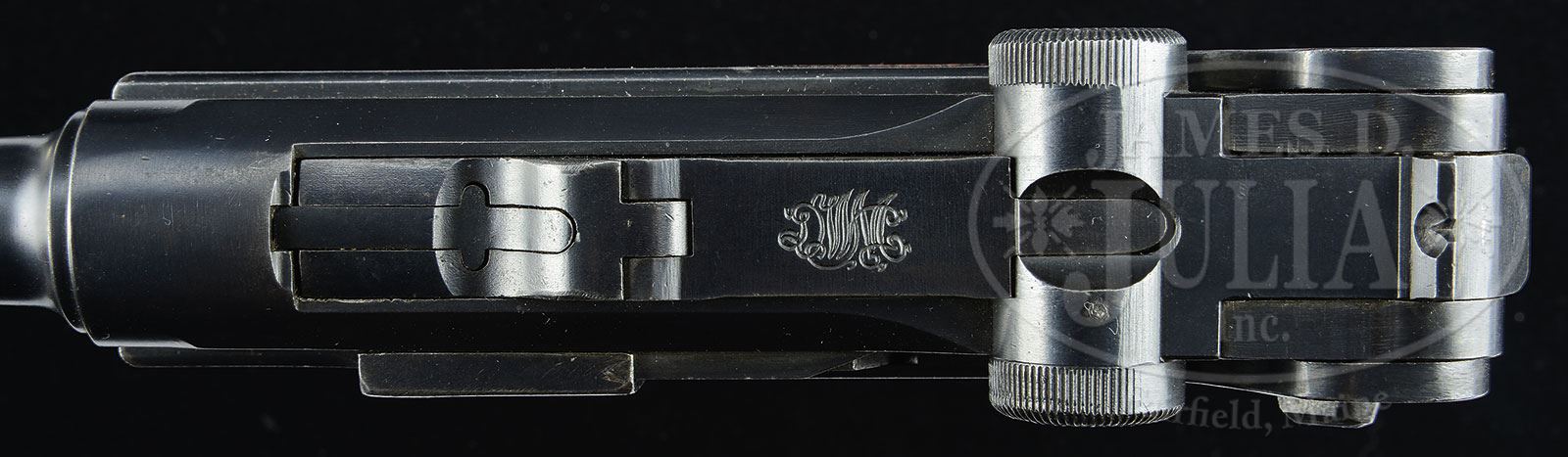 *◊ RARE NORDSEE UNIT MARKED 4″ NAVY CONVERSION LUGER PISTOL.SN 21a. 4″ 9mm bbl cut down from 6″ Navy bbl with Crown/M proof above SN on bottom. Crown proofs on left side of bbl and receiver. DWM scroll on center toggle link. Crown/M proofs on left receiver. Imperial proof on sideplate. Two digit SN without suffix letter on front of frame. Numbers on gun are matching except for checkered walnut grips. Toggle assembly is unnumbered. Proper Crown/M proof Navy wood bottom magazine with numbers that do not match. Nordsee unit marked “N/1827” on backstrap. Converted to P.O8 configuration by shortening the bbl and removing the grip safety mechanism after WWI. This gun is featured on pg. 921 of The Borchardt & Luger Automatic Pistols by Joachim Gortz & Dr. Geoffrey Sturgess. PROVENANCE: Collection of Dr. Geoffrey Sturgess. CONDITION: Fine. Retaining 95% blue and 70% straw with scattered light frosting. Grips are worn and have light chips and nicks to checkering. Bore is worn and pitted. Magazine has 75% blue and wood bottom has dings and chips. Mechanics are fine. 4-52910 (2,000-3,000) – Lot 2272