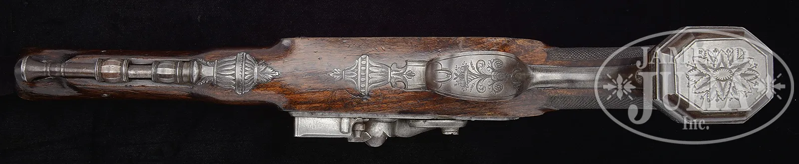 FINE PAIR OF CASED FLINTLOCK PISTOLS INSCRIBED “LIEUT. COL. PHILIP P. HATHAWAY FREETOWN, MASS”.SN NSN. Cal. 69. Most unusual to find inscribed flintlock pistols but this is a beautiful pair no doubt engraved contemporarily to Col. Hathaway’s presentation circa 1830. Lt. Col. Philip P. Hathaway is listed with this rank in the 5th Massachusetts Infantry October 5, 1829 til 1833 in the 1883 “History of Bristol County” by D. H. Hund. The Hathaway family of Freetown, Mass dates back to the 17th century with several well-known family members who were military commanders in the American Revolution, War of 1812 through the Civil War. This beautiful pair of imported Liege flintlock pistols measure 13″ overall with engraved iron mounts, 7-1/2″ micro-grooved rifled 69 Cal. bores. This style of rifling was quite new at the time and no doubt this was an expensive pair of officer’s pistols in their day. The accompanying burled case is compartmentalized for the guns, cleaning rod, bullet mold, oiler, powder measure, balls & flints. CONDITION: Guns are fine overall, appear orig & complete with well-fit engraved iron mounts. Bbls retain traces of thin striped finish. Proofs & inscriptions are crisp with scattered areas of light pitting. Stocks are sound retaining portions of orig thin varnish. There is a hairline crack forward of lock escutcheon on one gun & a barely discernible glued repaired crack to wrist on same gun. Trigger guard also has crack through its screwed base near butt. Mechanically both pistols are functional with crisp well-defined bores with bright breeches. Accompanying casing is sound & solid with 4″ crack in lid with scattered dings, dents & other blemishes though still retaining much of possibly orig varnish. Iron 69 Cal. bullet mold is pitted. Powder measure, red Moroccan leather powder flask, oiler & wood tools makes a nice addition to box but are probably later editions. 50183-1 JS (8,000-12,000) – Lot 2273