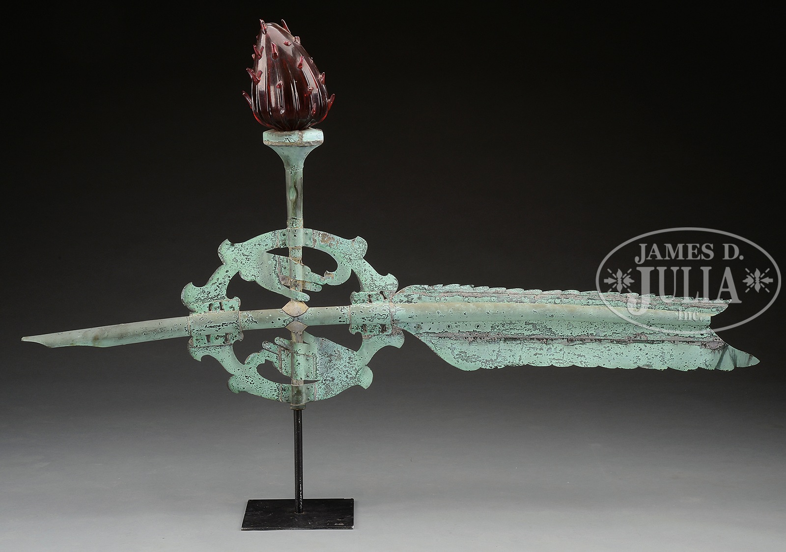 RARE AND UNUSUAL LARGE COPPER QUILL WEATHERVANE WITH BLOWN GLASS TORCH.Second half 19th century, American. This large example of a quill pen incorporated into the form of a banner, the vertical post modeled as a torch fitted with a large ruby red blown glass ‘flame’. The whole in undisturbed verdigris now offered on a museum stand. SIZE: 45″ h x 66-1/2″ l. CONDITION: The glass flame has lost several of the points that protrude from the sides but it is in otherwise good condition with no cracks or fractures. The bottom tip of the fleche with old crimp, otherwise very good. 50567-8 (6,000-8,000) – Lot 2273