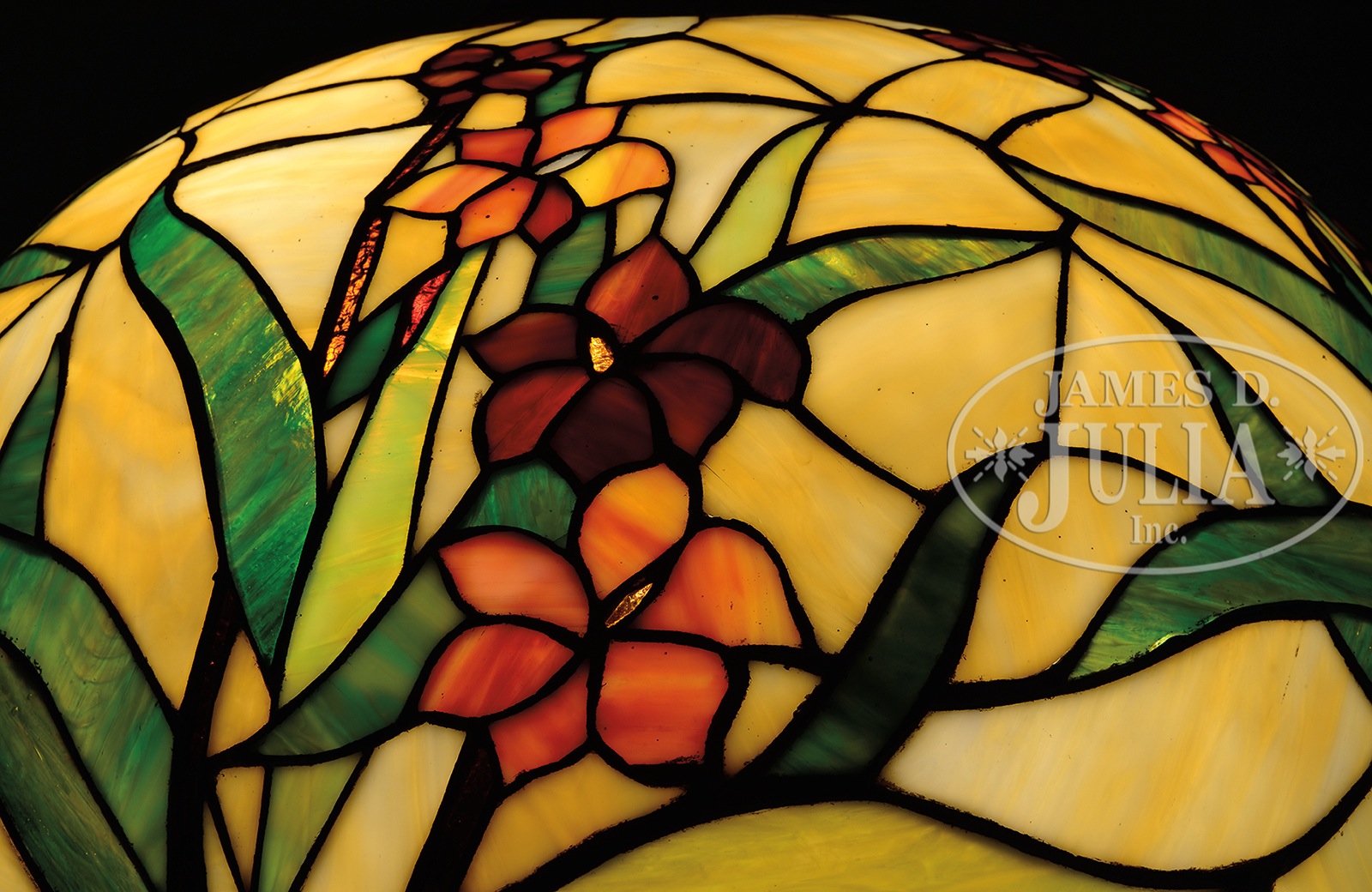 HANDEL LEADED TABLE LAMP.Handel leaded table lamp has five vertical bands of colorful flowers with shaded green leaves against a caramel slag background. Shade rests on a Handel base with vertical ribbing on foot and stem leading to the three-socket cluster with acorn pulls. Base is completed with a cast metal openwork fleur de lis cap. Base is finished with a rich brown patina. Shade is signed on interior with an applied metal tag “Handel”. Base is signed on underside with cloth tag “Handel Lamps”. SIZE: Shade is 22″ dia. Lamp is 27″ t. CONDITION: Shade is very good to excellent with very few tight hairlines. Base is very good to excellent, rewired with appropriate cloth cord. 5-68856 (1,500-2,500) – Lot 2274
