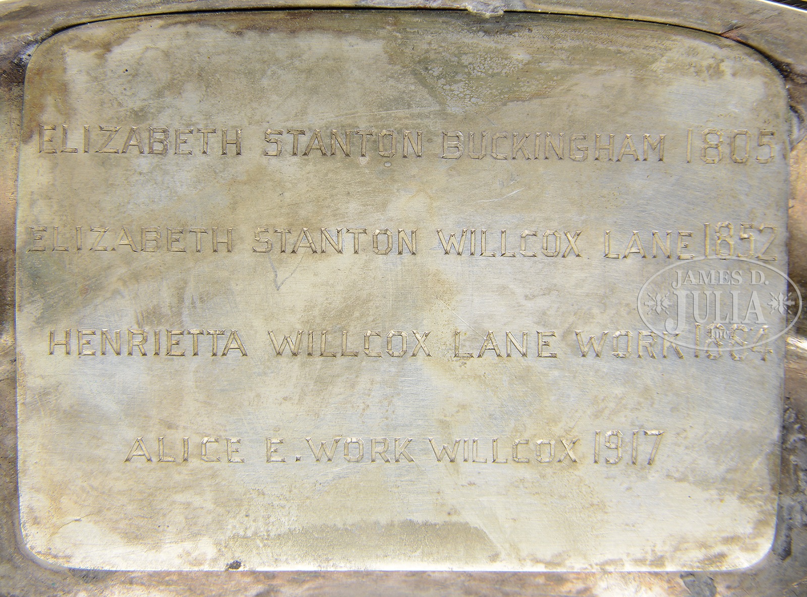 AMERICAN SILVER 3 PIECE TEA SERVICE MADE BY WM. BRAISTED HEYER.Early 19th century. New York. Hand chased American silver 3 piece tea service of stepped oval configuration, each piece on 4 ball feet with lower lobed section, waisted center with applied mid band of scroll decoration and applied foliate bands at top and base, square handles and stepped oval covers on sugar and tea pot with fluted domes and finials. Made in New York City by William Braisted Heyer about 1805. Each piece has rectangular plaques soldered inside of base with family lineage from 1805 – 1968. Accompanying this lot will be an appraisal from 1987 with extended family history. SIZE: Teapot 10″ h. Total weight 60.4 troy ounces. PROVENANCE: History well documented on plaques under bases, beginning with Elizabeth Stanton Buckingham who owned it in 1805, descended through 4 other owners to Alice Willcox Whitney in 1868. The family is a well known Clinton, CT. family. CONDITION: A few minor dings and some tarnish. 9-25080 (1,500-2,500) – Lot 2274