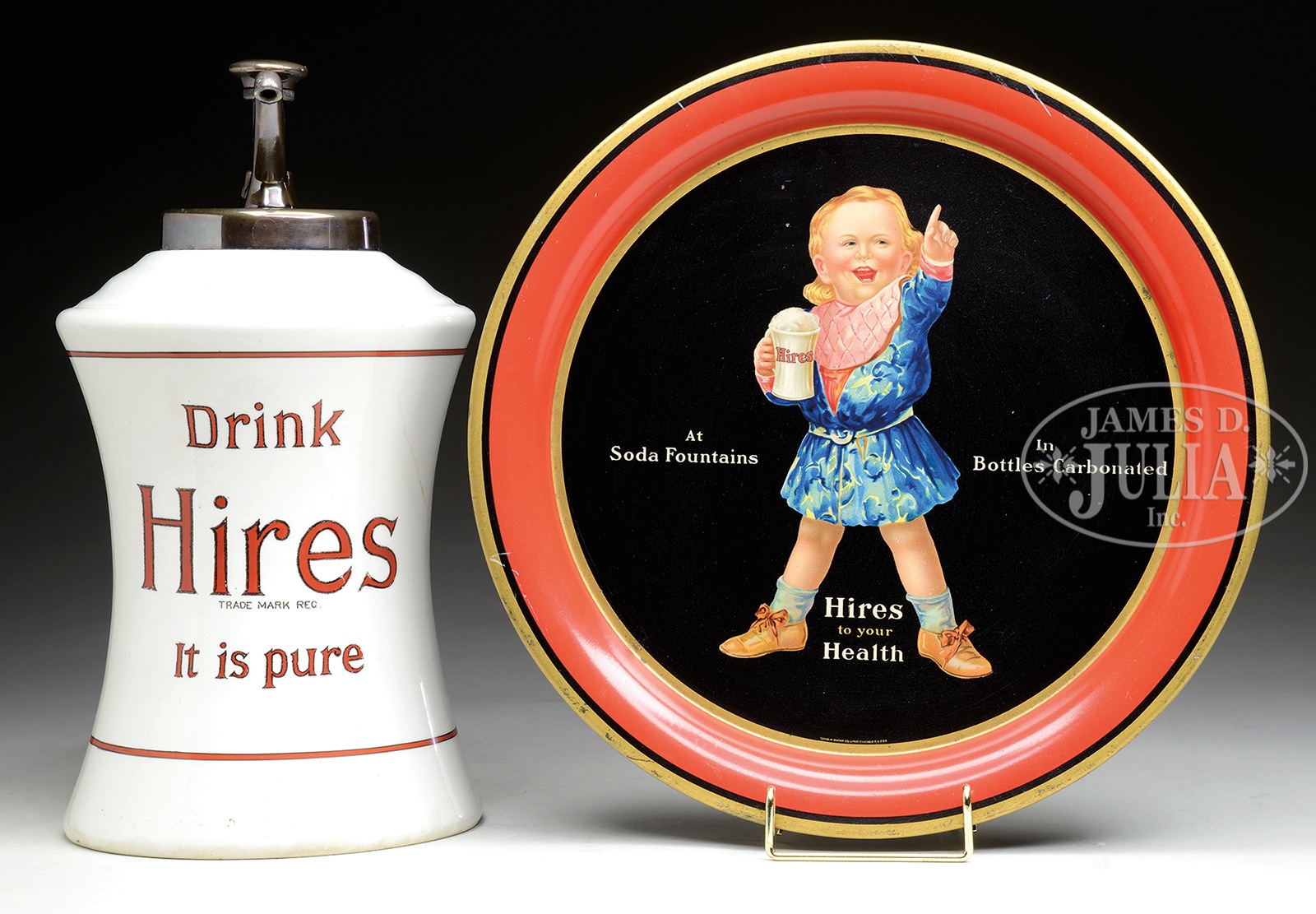 LOT OF 7 HIRES ROOT BEER ADVERTISING ITEMS.1) Hires 1950s bottle cap sign. 2) “Drink Hires” 1950s tin sign. 3) Hires figural bottle tin sign. 4) Hires 1950s thermometer. 5) Hires 1950s glass menu board. 6) Hires Ugly Kid circa 1908 serving tray. 7) Hires Root Beer ceramic syrup dispenser. SIZE: 1) 34-1/2″ dia. 2) 32″ w x 11″ h. 3) 15-1/2″ w x 57-1/2″ h. 4) 12″. 5) 12″ w x 24″ h. 6) 13-1/4″ dia. 7) 14″ h. CONDITION: 1) Near excellent. 2) Near excellent. 3) Near excellent. 4) Very good with few bends to the aluminum bezel. 5) Good to very good; corrosion to metal frame; broken glass needs replacing. 6) Near excellent. 7) Very good; hairline crack to the hourglass body; original marked pump. 1086-17 (1,000-1,500) – Lot 2274 Auction: Advertising, Toy & Doll - Spring 2015 Please Note: All prices include the hammer price plus the buyer’s premium, which is paid by the buyer as part of the purchase price. The prices noted here after the auction are considered unofficial and do not become official until after the 46th day. |