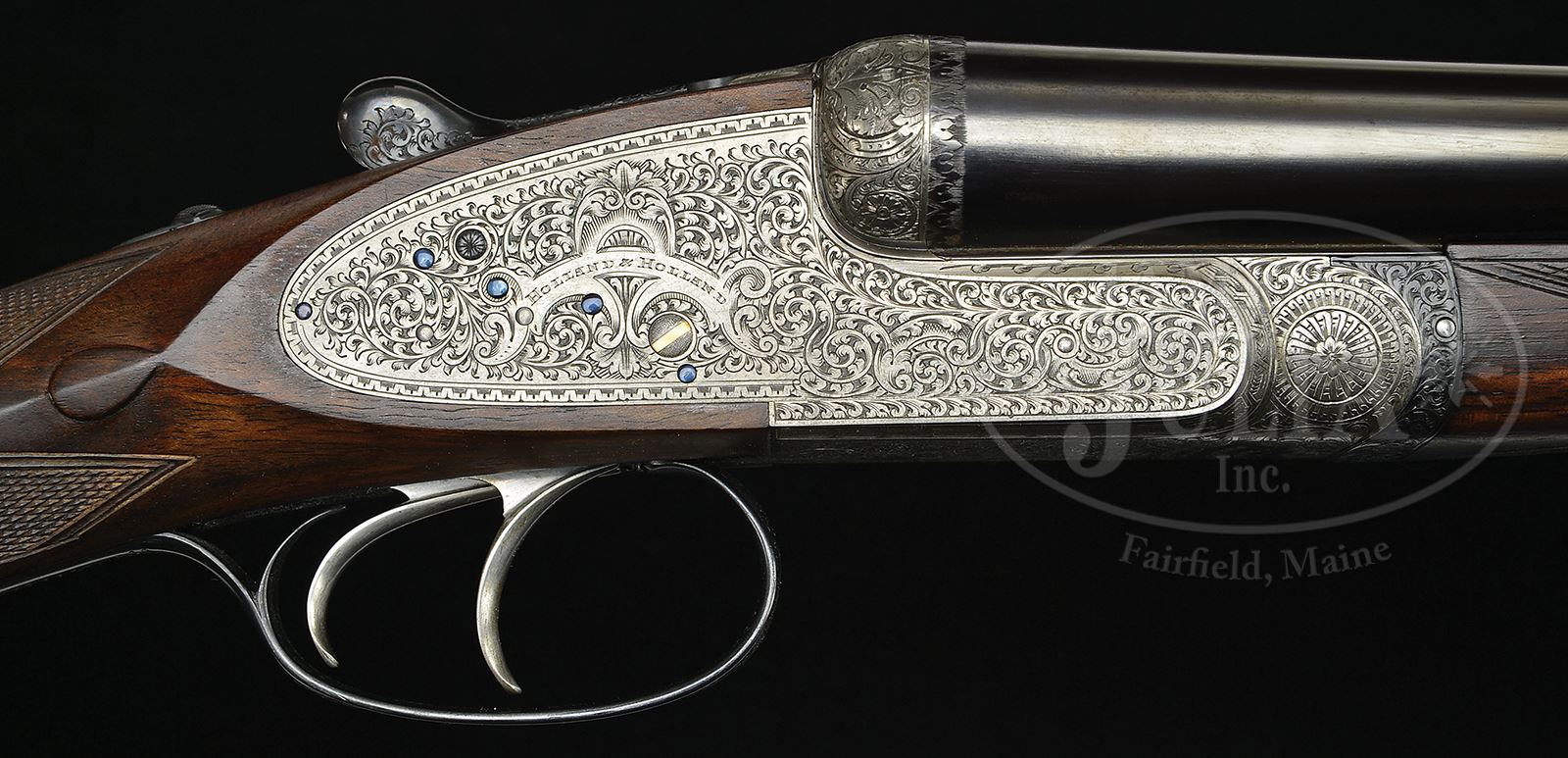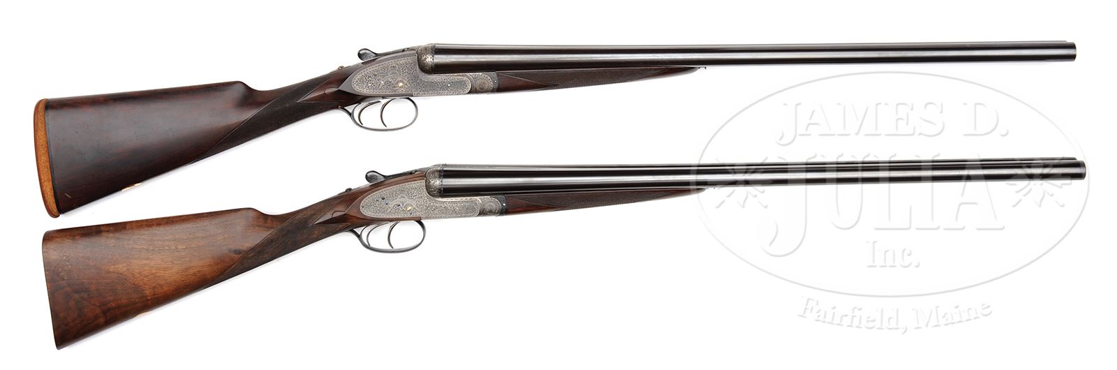 *CASED PAIR OF HOLLAND & HOLLAND ROYAL BREVIS GAME GUNS WITH CARTRIDGE MAGAZINE.SN 30970/ 30971. (ca 1926) Cal. 12 ga. 2-1/2″ Chambers. These guns have 25″ chopper lump bbls; undoubtedly inspired by the large following attained by Robert Churchill and his XXV gun. (These short barreled guns were not dubbed “Royal Brevis” until after 1931, when all Holland Royals with bbls 28″ or less were referred to by this name.) The bbls of this matched pair, with nos “1” and “2” gold inlaid on rear of ribs, top levers, and forend tips, are engraved “Holland & Holland.” and “98 New Bond Street, London” on tops of each bbl set. Bbl flats are stamped with London nitro proofs for 2-1/2″ chambers, and bbls are fitted with 1922 patent self-opening assist spring. Typical H & H Royal actions are stocked to the fences and feature automatic safeties (SAFE inlaid in gold), gold band tumbler end cocking indicators, double triggers, and H & H patent hand detachable locks. Actions and lockplates are engraved with classic H & H house style large, shaded, open scroll with acanthus highlights. “Holland & Holland” is in arched scroll flanked device at the center of each lockplate. Bottoms of actions are engraved “ROYAL” “SELF-OPENER” and “PATENT 1922”; top levers “ROYAL EJECTOR”. Lightly figured and nicely streaked European walnut straight grip buttstocks feature diamond hands, drop points, typical point pattern checkering with mullered borders, and gold ovals on toe lines. Gun no. “1” has oval engraved “F. S. C” and has unusual rubber faced foam rubber pad, while gun no. “2” has vacant oval and checkered wood butt. Matching splinter ejector forends have Anson releases. Gun no. “1”: Bore diameter: left-.732, right -.732. Bore restrictions: left -.006 (IC), right -.007 (IC). Wall thickness: left -.024, right -.028. Drop at heel: 2-1/16″, drop at comb: 1-3/8″. Weight: 6 lbs. 2 oz. LOP: 13-5/8″. Gun no. “2”: Bore diameter: left-.734, right -.734. Bore restrictions: left -.009 (IC), right -.003 (IC). Wall thickness: left -.022, right -.023. Drop at heel: 2-3/8″, drop at comb: 1-1/2″. Weight: 6 lbs. 5 oz. LOP: 13-9/16″. Original makers oak and leather two gun case with brass corners and push button lock, is embossed “F. S. C.” on top. Interior is lined in scarlet cloth with gold embossed H & H label in lid, along with charge card for these particular guns, and H & H notice regarding extractors. Case contains H & H marked round pewter oil bottle, two pairs of Holland marked snap caps, a bone striker case containing four strikers, marked “30770, 30771 spare strikers”, and a nickel-plated tweezer-type broken case extractor. Also included is an oak and leather 16″ x 12″ cartridge magazine with brass corners. Interior is lined in scarlet cloth, having Holland & Holland gold embossed black leather label, with five compartments for cartridges. PROVENANCE: Bureau of Customs Certificates of Registration. CONDITION: As found. Gun no. “1”: Excellent. Bbls retain 95% orig black, slightly thinned at normal carry area. Action and lockplates retain most of their muted orig case hardening color. Orig blue of top lever and trigger guard, is silvering at normal areas of wear. Pad is petrified. Stocks retain nearly all their orig finish with some minor marks and scratches from normal use. Bores are excellent, bright and shiny, but with areas of what appears to be spots of congealed oil, mostly on top of right bore. Action is tight. Bbls are on face. Ejectors are strong and in time. Gun no. “2”: Excellent, as refurbished. Bbls retain nearly all of an excellent quality re-black. Action and lockplates coin finished and starting to oxidize, mostly on bottom. Forend iron, top lever, and trigger guard re-blued, and retain nearly all of that blue. Buttstock is a new well done replacement. (Tag affixed to trigger guard states “restock exactly the same meas. wood to match no 1 gun”.) Stock retains nearly all of its orig finish, is considerably lighter in color than gun no. “1”, and checkering is sharp. Otherwise shaping and inletting is of factory quality. There are some patches of wax paper adhering to stock near butt. Forend retains its orig finish and has 1″ x 1/8″ piece missing from left front edge. Bores are excellent, smooth, bright, and shiny. Action is tight. Bbls are on face. Ejectors are slightly out of time. Case leather is still light in color with some areas of rubbing and scratches. Straps and handle are good. Interior cloth has some minor insect damage and numerous rubs (some rubbed through) and some soiling. Partitions have been moved and are loose, with some pieces of blocking separated. Accessories are fine. Cartridge magazine leather has darkened, and has some rubs. Straps and handle are good. Interior cloth has considerable insect damage and mildew. 49316-1, 49316-2, MGM33 (15,000-25,000) – Lot 2274