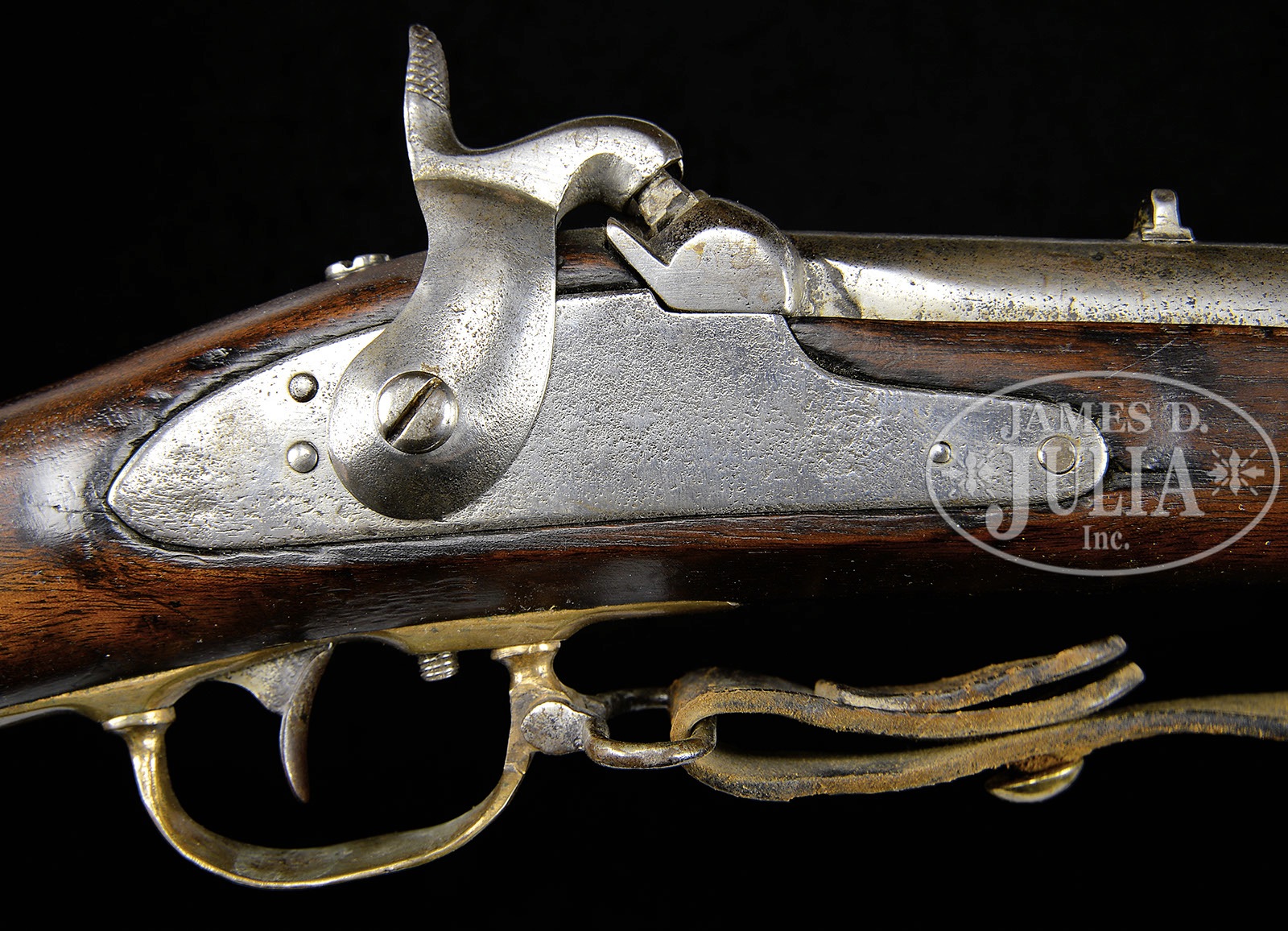 CONFEDERATE NORTH CAROLINA RIFLE.SN 405. .58 cal. This gun, just consigned from New Jersey, is new to the market and appears all original, complete and authentic in every regard. This gun most likely was made by Mendenhall, Jones & Gardner of Greensboro, NC. MJ&G was one of the larger North Carolina makers and according to Madaus & Murphy’s ‘Confederate Rifles & Muskets’ delivered about 2,300 guns to the state of North Carolina. This gun conforms to what Madaus & Murphy refer to as a type-two MJ & G rifle. Characteristics of this rifle and other type-twos are .58 cal., 33″ round bbl with 7 lands and grooves, brass 2-piece trigger guard, flat brass bbl bands retained by band springs each stamped with “U” on top, brass nose cap, iron ramrod with long, tapered flared end and iron butt-plate. This gun has no external markings other than a small ‘NC’ stamped between rear sight and bolster. Internally, gun has matching assembly number ‘134’ on breech plug and lock and serial number ‘405’ is found stamped on hammer, lock-plate, bbl and penciled on bbl mortise of stock. CONDITION: Gun is good to very good overall. Appears original and authentic throughout. Metal has all been cleaned and has a gray/white color with pitting. Stock has been refinished with numerous small dings and dents. Forestock has two long hairline cracks with one small splintered area on left side of stock about 1″ long. There is a large 2″ or 3″ crack on rear toe of buttplate and several burned areas around buttplate as can be seen in photos. The accompanying leather sling is sound and solid though highly scuffed and appears to be of a later vintage than gun. 4-49253 JS171 (3,000-5,000) – Lot 2276