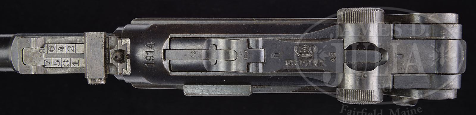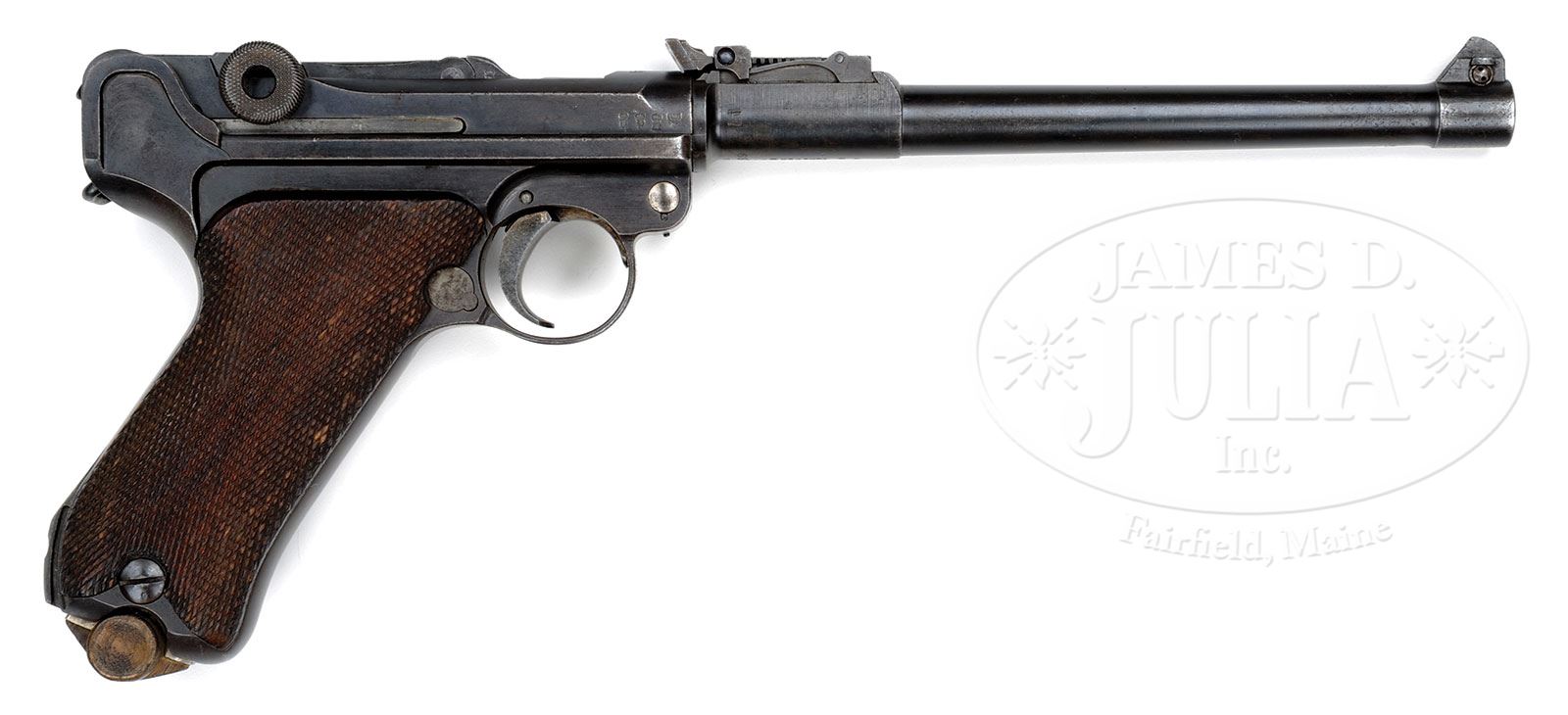 *◊ ERFURT 1914 ARTILLERY LUGER PISTOL.SN 6948a. Cal. 9mm 8″ bbl with fine tuned front and fine tuned rear adjustable sights. SN and British proofs on bottom of bbl. 1914 date above chamber. Crown/”ERFURT” on center toggle link. Imperial and British proofs on toggle assembly. Imperial proofs on right receiver. British proofs on left receiver. All numbered parts on gun are matching including original checkered walnut grips. Erfurt proofs on small parts. Proper wood bottom magazine with numbers that do not match. This gun is featured on pgs 945, 1092 of The Borchardt & Luger Automatic Pistols by Joachim Gortz & Dr. Geoffrey Sturgess. PROVENANCE: Collection of Dr. Geoffrey Sturgess. CONDITION: Fine retaining 85% blue with scattered light pitting. 30% straw with corrosion. Grips are lightly worn with minor chips on checkering and visible wood grain. Bore is sharp with very light frosting. Magazine body has little wear and wood bottom has minor dings. Mechanics are fine. 4-52938 (2,000-3,000) – Lot 2276