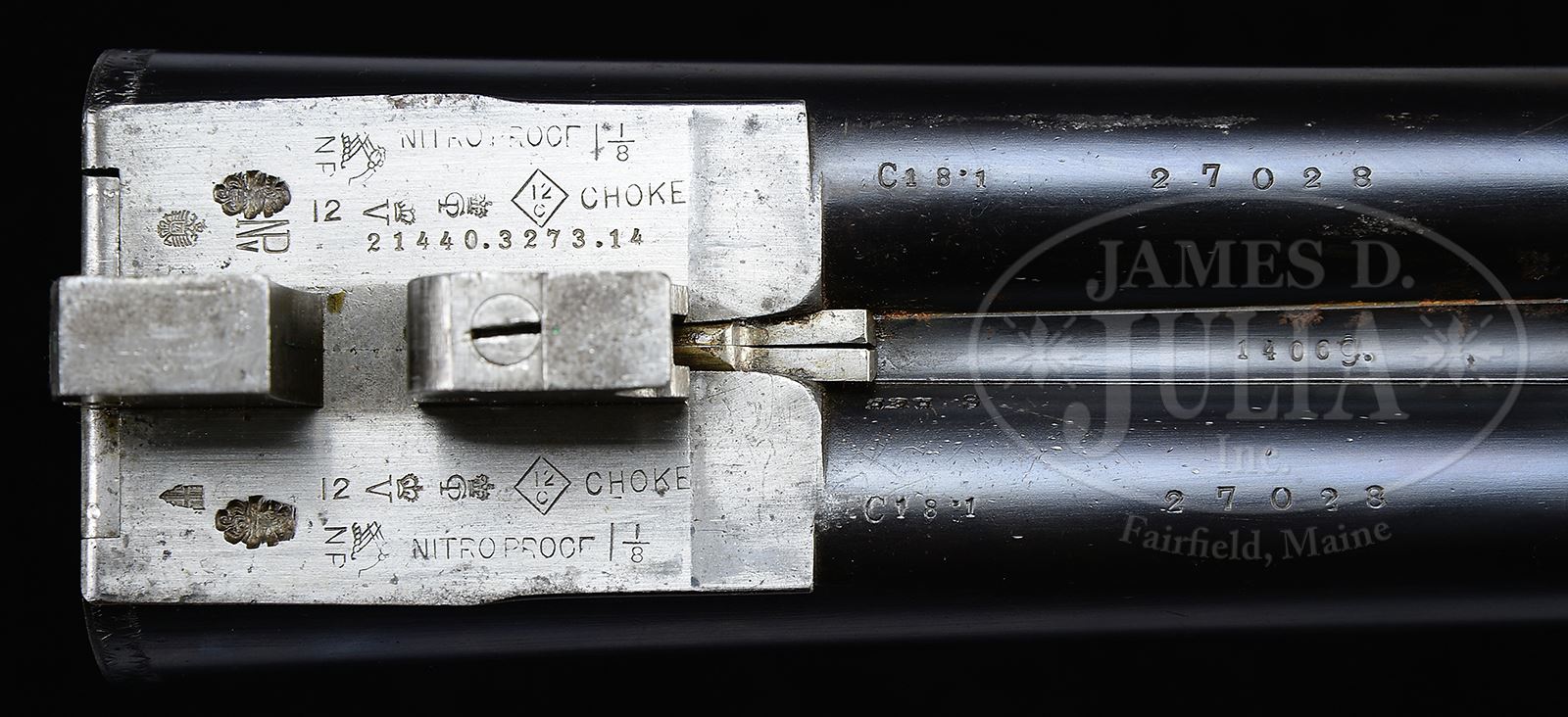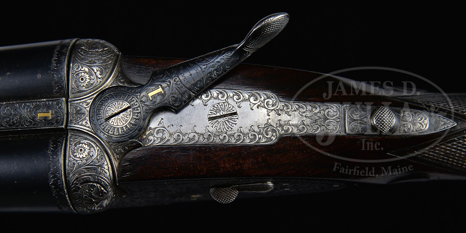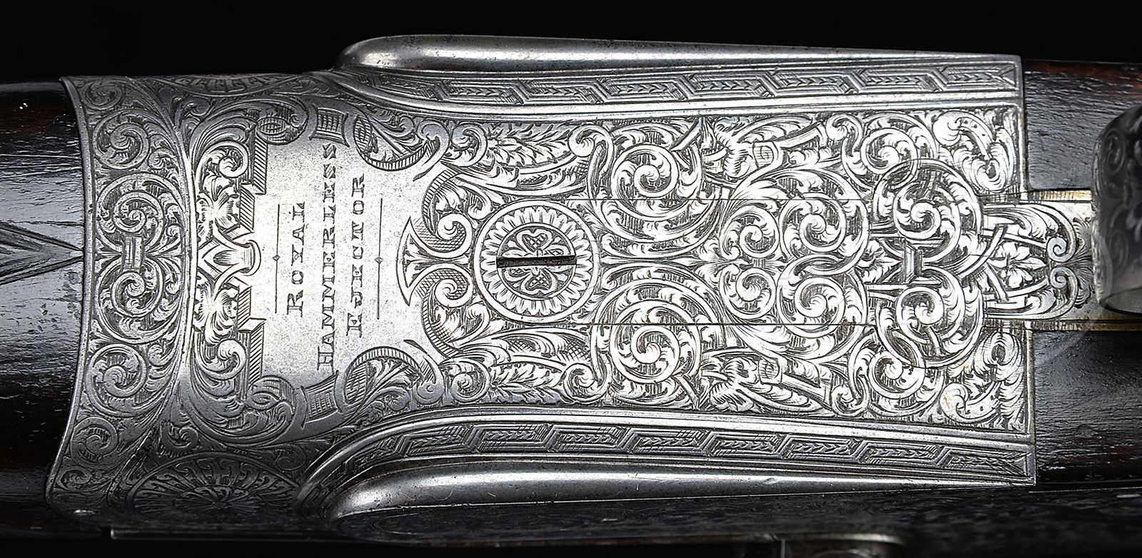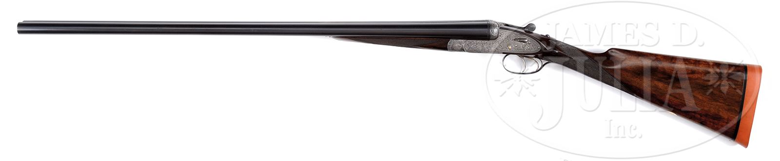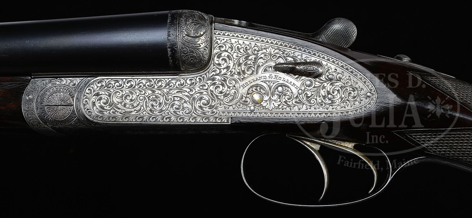 *FINE HOLLAND & HOLLAND HAMMERLESS EJECTOR GAME GUN.SN 27028. (1911) Cal. 12 ga. 30″ Chopper lump bbls are fitted with narrow, swamped game rib gold inlaid “1” at rear of rib (gun was no. “1” of a pair, “1” is also gold inlaid on top lever and forend tip). Tops of bbls are engraved “Holland & Holland.” and “98. New Bond Street, London,”. Bbl flats are stamped with London nitro proofs for 2-1/2″ chambers, and 1914 vintage Vienna proofs. Bottoms of bbls are stamped with SNs. Typical sidelock Royal action features non-automatic safety (SAFE inlaid in gold), hidden third fastener, gold band tumbler end cocking indicators, detachable sidelocks, and double triggers. Action is engraved in typical Holland Royal style with near full coverage of varying sized open, shaded scroll, with acanthus highlights. “Holland & Holland” is in arched device on each lockplate. Bottom of action is engraved “Royal” “Hammerless” “Ejector”. Top lever is engraved “Holland’s Patent”. Trigger guard bow is also scroll engraved. SN is on short tang. Nicely marbled and lightly figured European walnut straight grip buttstock measures 14-3/8″ over Silver type pad, and features diamond grip with standard point pattern checkering, drop points, and a gold oval on toe line with monogram “GG” under the crown of a baronet. Matching splinter ejector forend stamped “STEEL” on iron, has Anson release. Bore diameter: left -.730, right -.730. Bore restrictions: left -.017 (mod), right -.010 (IC). Wall thickness: left -.027, right -.024. Drop at heel: 2-13/16″, drop at comb: 1-3/4″. Stock is considerably cast on. Weight: 6 lbs 12 oz. LOP: 14-3/8″. CONDITION: Fine, as partially refinished. Bbls retain over 90% of an old re-black with some subsequent marks and flecks. Action cleaned to coin finish, engraving remains clear. Stocks retain most of an old hand rubbed oil finish over numerous light marks. A retracting sling has been removed from butt, with matching piece of wood installed, and a patch set into bottom rib where attaching eye once resided. Pad is new. Bores are fair, with scattered pitting throughout. Action is tight. Right bbl is slightly off face. Ejectors are strong and in time. 49604-1 MGM381 (7,000-10,000) – Lot 2276