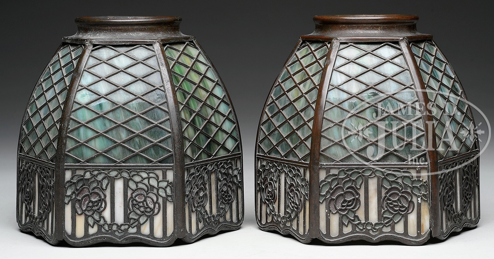 PAIR OF HANDEL METAL OVERLAY SHADES.Handel metal overlay shades have rose border with caramel slag glass background and painted roses and leaves. Top section of shade has a trellis metal overlay with green slag glass backing. Metal is finished in a brown patina and shades have a metal 3-1/4″ fitter. Each is signed on the interior with an applied metal tag “Handel”. SIZE: 6-1/2″ t x 7″ w at the widest. CONDITION: Very good. One shade has solder separation at bottom corner. 5-68754 (1,200-1,500) – Lot 2278