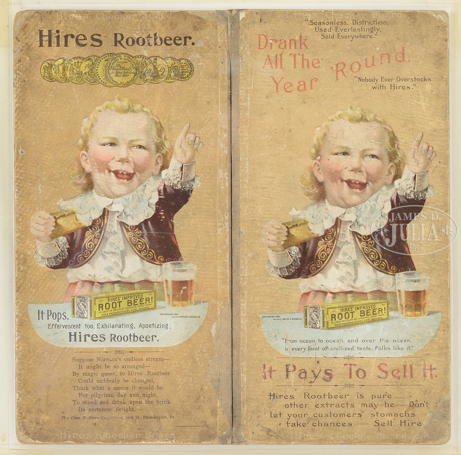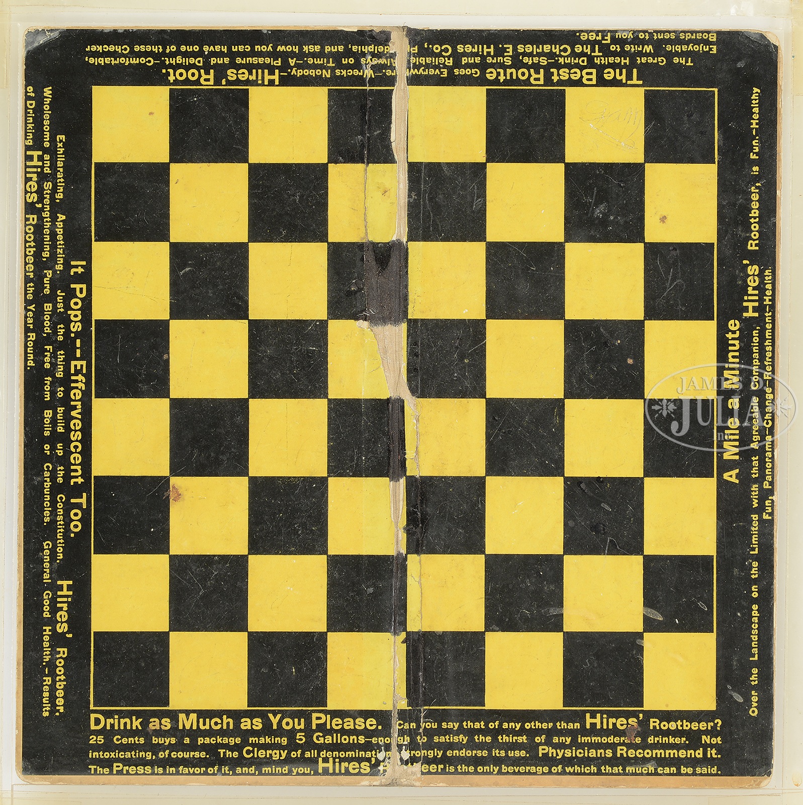 LOT OF 3 HIRES ROOT BEER ADVERTISING ITEMS.1) Glass change receiver with a reverse applied Hires “Ugly Kid” decal. 2) Rare, early embossed Hires Root Beer cardboard sign with illustration of the “Ugly Kid”. Appears to retain its original string hanger and brass grommets. 3) Hires cardboard checkerboard. SIZE: 1) 7″ dia. 2) Image: 9-1/2″ x 5-1/2″. 3) 12″ square. CONDITION: 1) Very good with a few scattered paint chips. 2) Very good. 3) Good to very good with some soiling & paper loss along interior fold. 49036-8 (600-1,200) – Lot 2278 Auction: Advertising, Toy & Doll - Spring 2015 Please Note: All prices include the hammer price plus the buyer’s premium, which is paid by the buyer as part of the purchase price. The prices noted here after the auction are considered unofficial and do not become official until after the 46th day. |